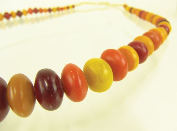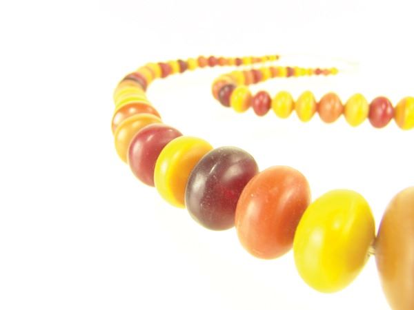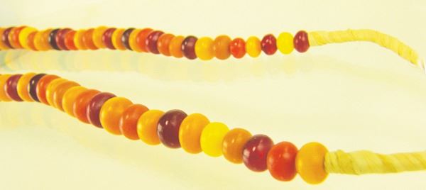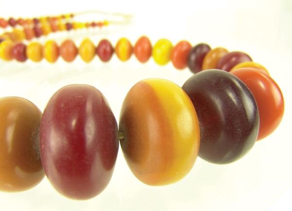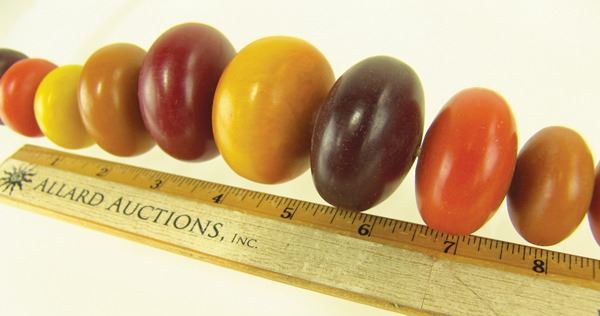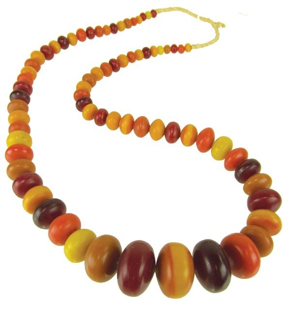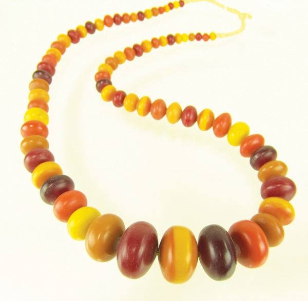 An exceptional, long 52" strand of the rarest, multi-color graduated beads ranging in size from 2" x 1-3/8" to 5/8" x 3/8". These are traditionally worn piled on by African woman as a sign of wealth andLate 1900s52"