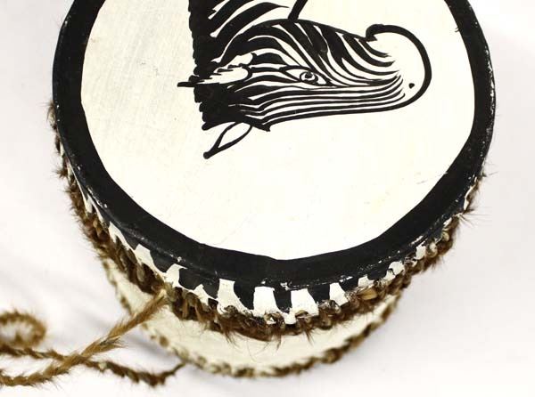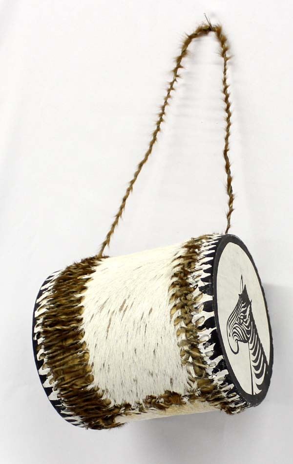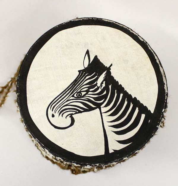 African Zulu Tribal Cowhide Covered Drum, hand painted zebra on top head, hide covered handle, measures 7.5'' x 9''