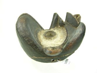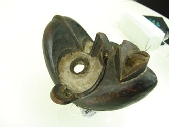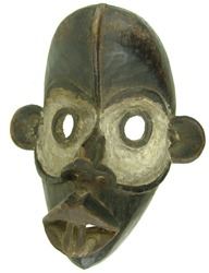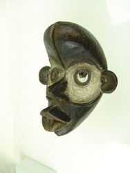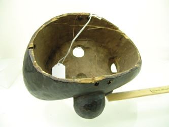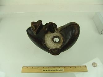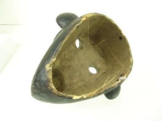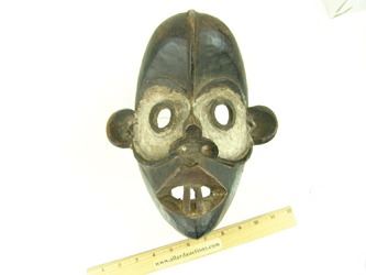 Early, hand carved and painted, hardwood ceremonial mask with rather grotesque, exaggerated facial features, including interesting teeth and ears. Good condition, minor repairs. Early 1900s. 10" x 9"