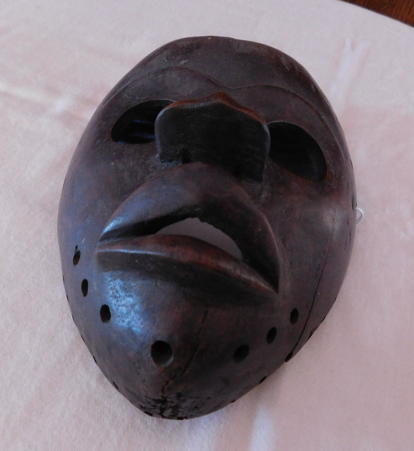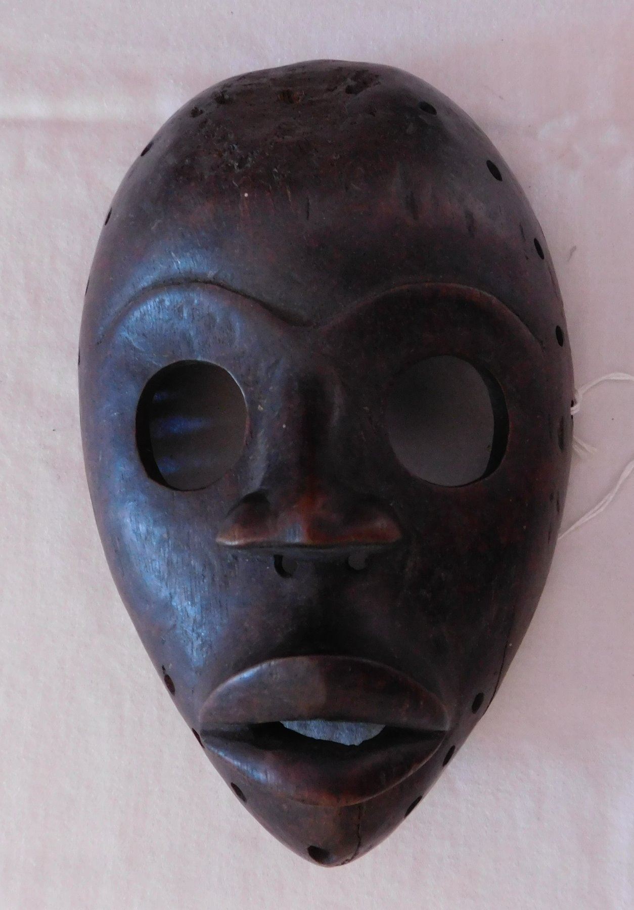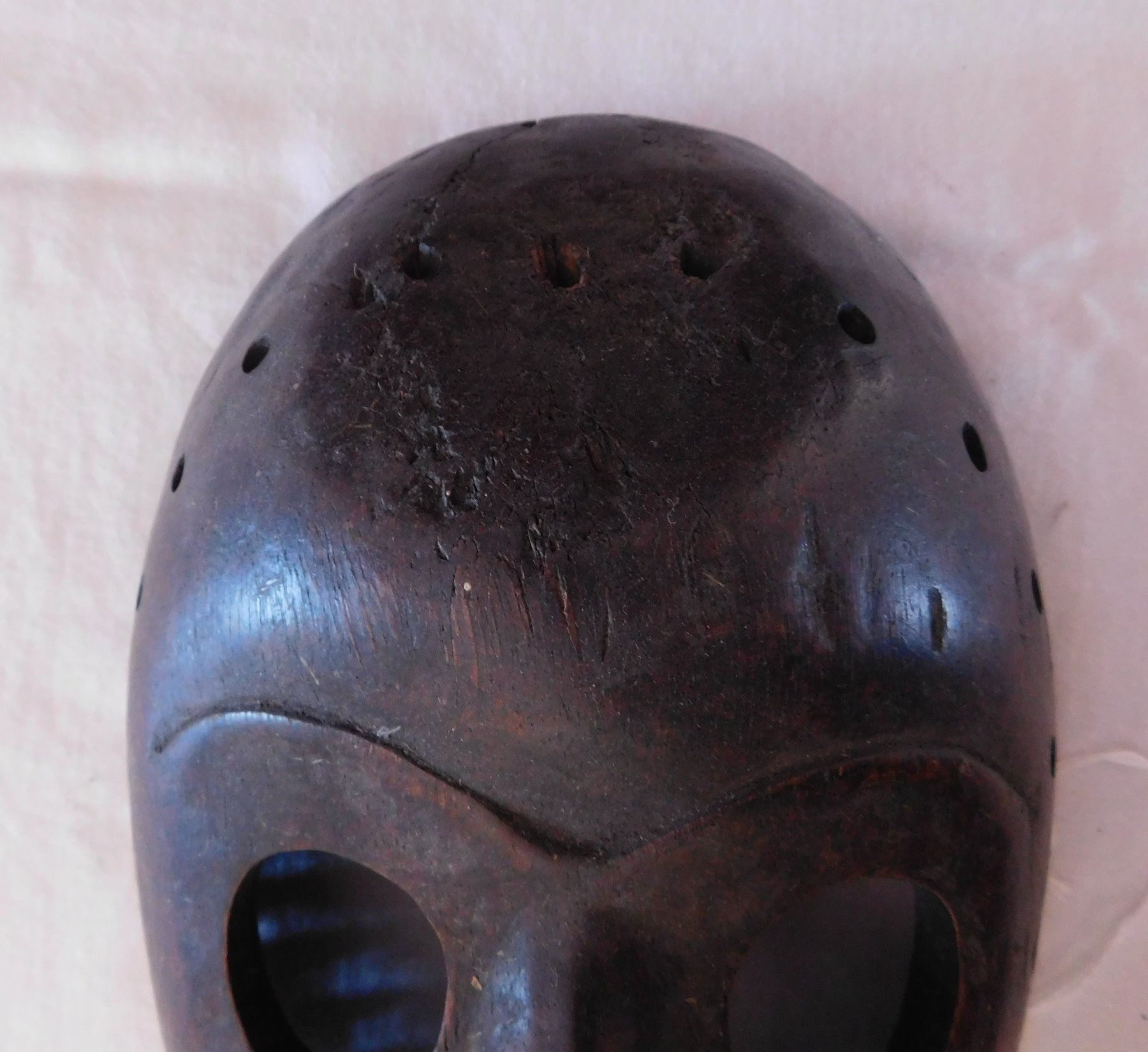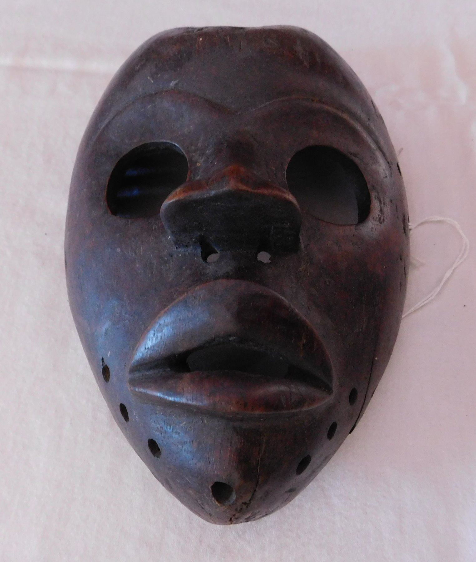 African Dan Wood Mask, early 20th century. Made of hardwood, the item measures 5 1/2" x 8 3/8" x 2 3/4". West Africa, Ivory Coast. Lots of drill holes for tying raffia. Displays great. Nice minimalist design. Condition: Great patina, cracked, see images. Shipping: $20.00 w/insurance and signature.