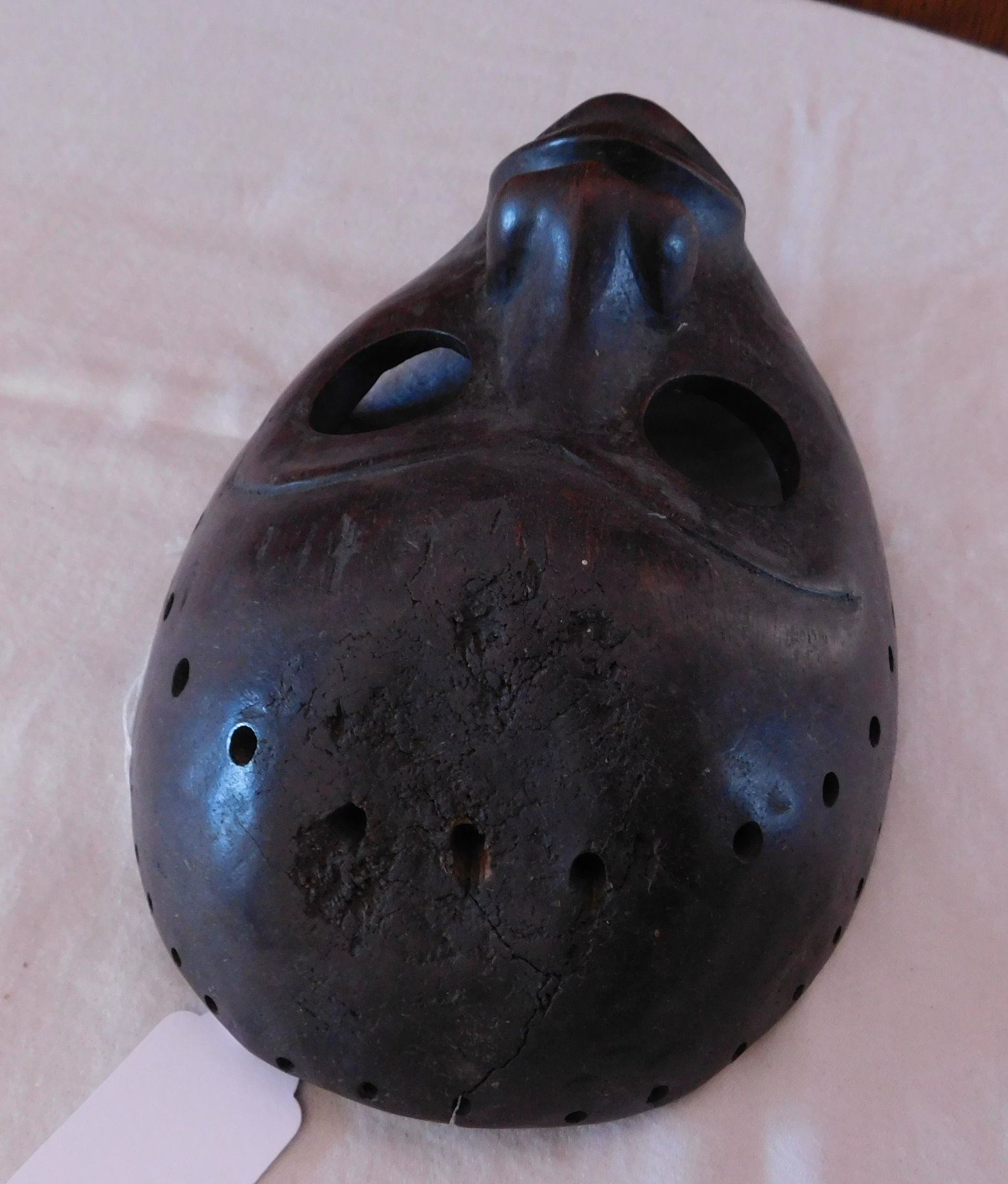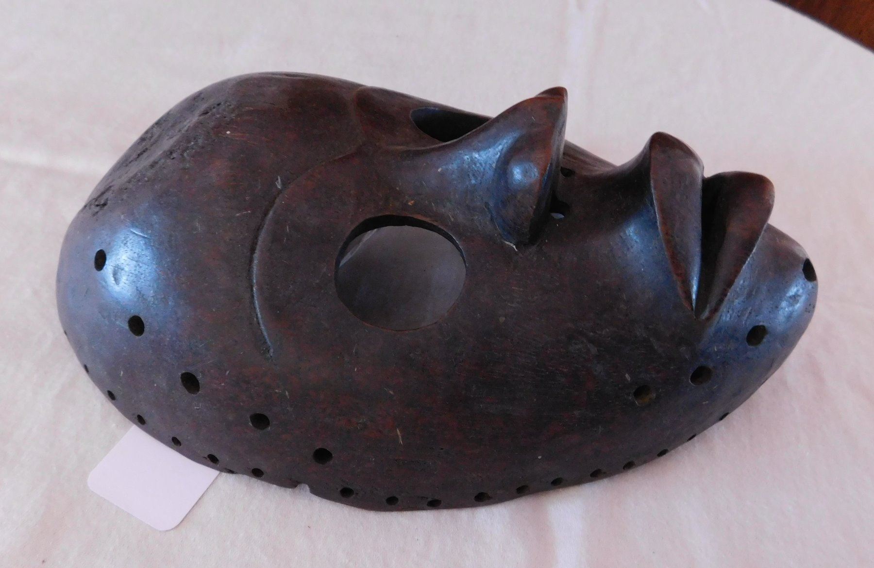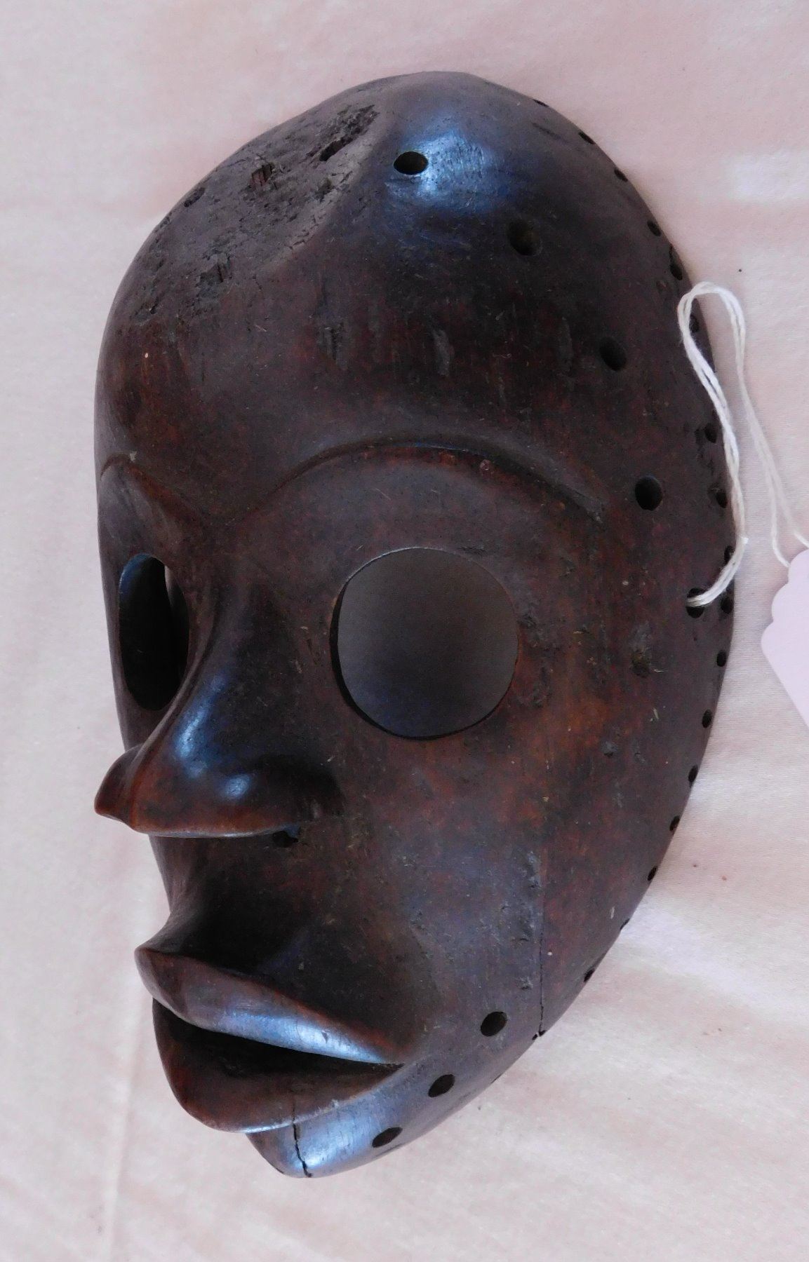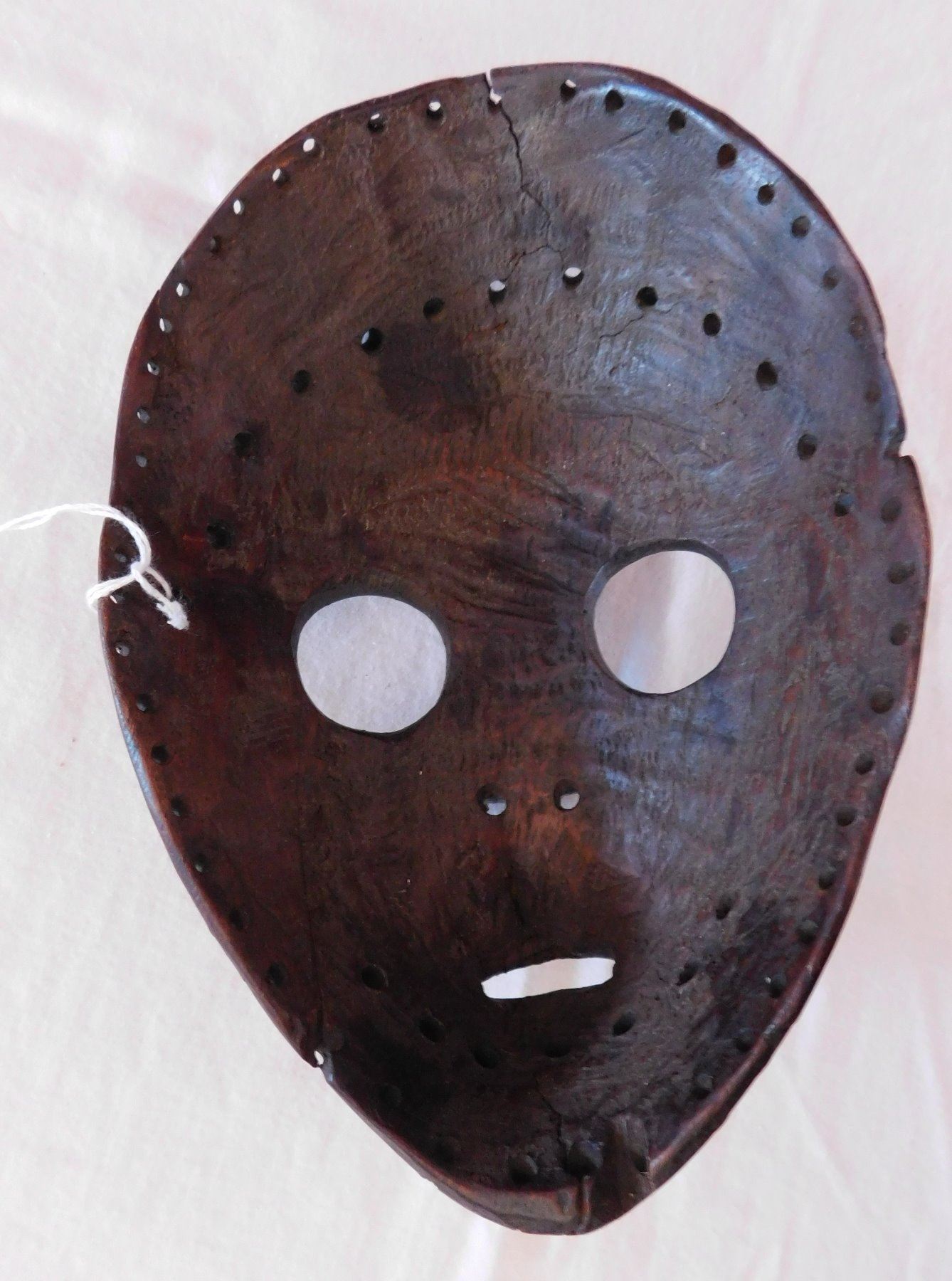 African Dan Wood Mask, early 20th century. Made of hardwood, the item measures 5 1/2" x 8 3/8" x 2 3/4". West Africa, Ivory Coast. Lots of drill holes for tying raffia. Displays great. Nice minimalist design. Condition: Great patina, cracked, see images. Shipping: $20.00 w/insurance and signature.