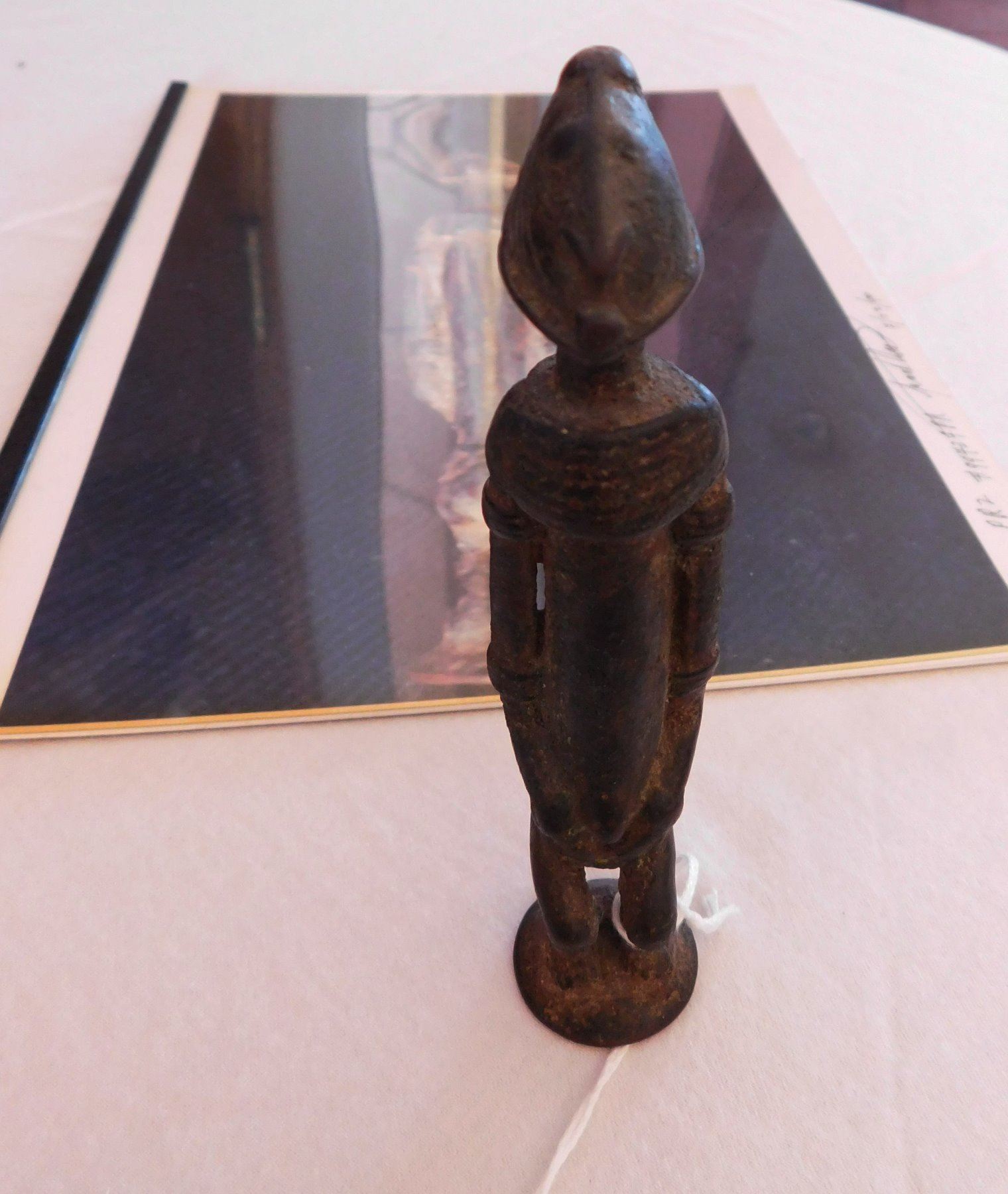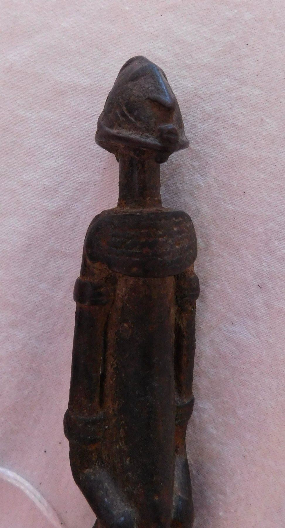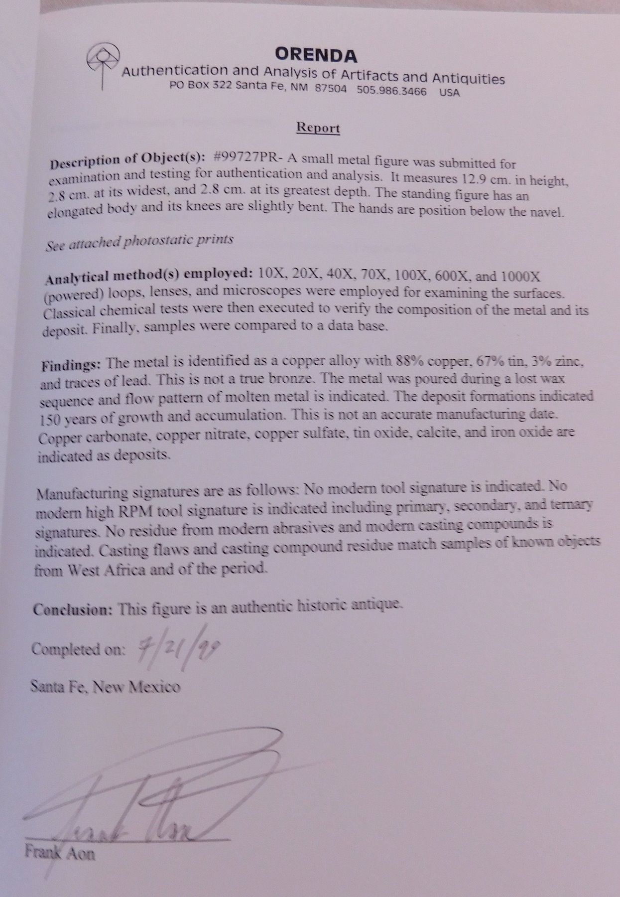 African Dogon Bronze Effigy Figure w/Report-COA, early historic period. Made of copper alloy, this bronze measures 5 1/8" x 1" x 1". Dogon, West Africa. Orenda Labs, Frank Aon authenticity report. Buy with confidence. Condition: Good patina, some wear, see images. Shipping: $40.00 w/insurance and signature, due to value.