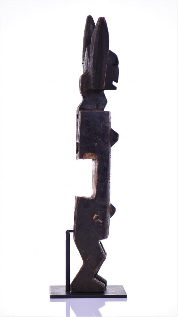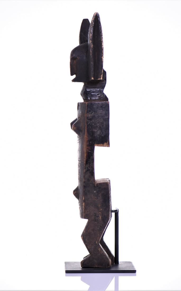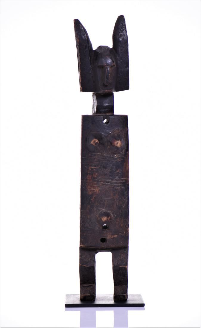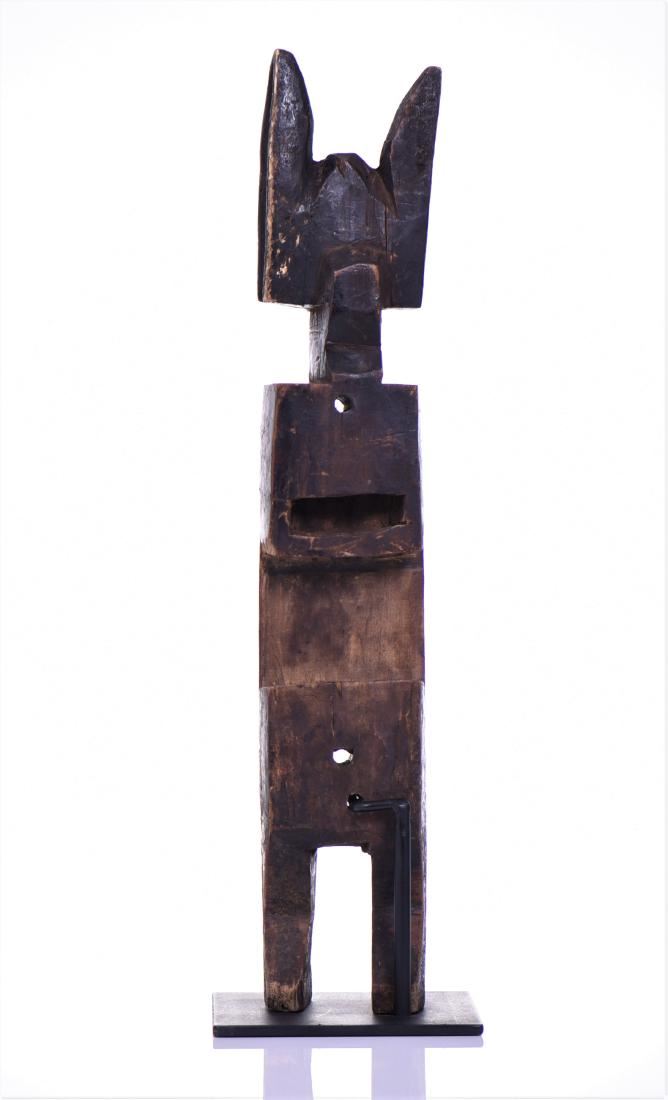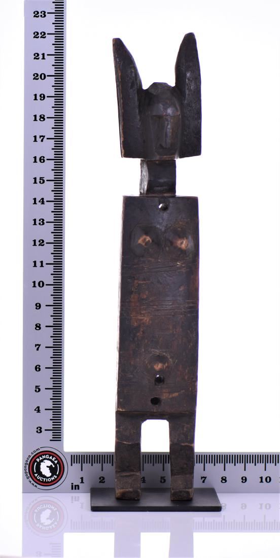 African Dogon Door Lock (Male Section), Mali. Dogon art is primarily sculpture. Dogon art revolves around religious values, ideals, and freedoms (Laude, 19). Dogon sculptures are not made to be seen publicly, and are commonly hidden from the public eye within the houses of families, sanctuaries, or kept with the Hogon (Laude, 20). The importance of secrecy is due to the symbolic meaning behind the pieces and the process by which they are made. Provenance: Ethnographic Tribal Museum Collection (See Auction Catalog Description). Some Lots Have Been On Exhibition And Have A Custom Made Metal Stand Specifically Designed To Fit The Work. Estimated more than 75 yrs old. (Pangaea Auctions) Size and/or Weight: See Measurement Photo. (Photos Represent The Lot Condition.)