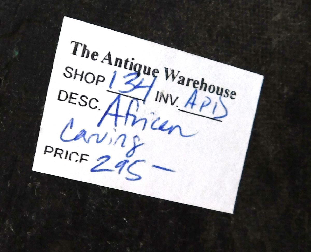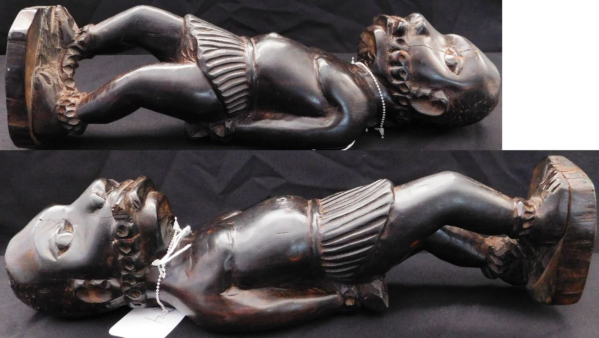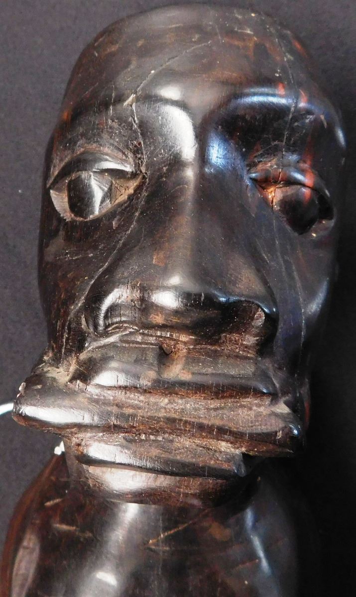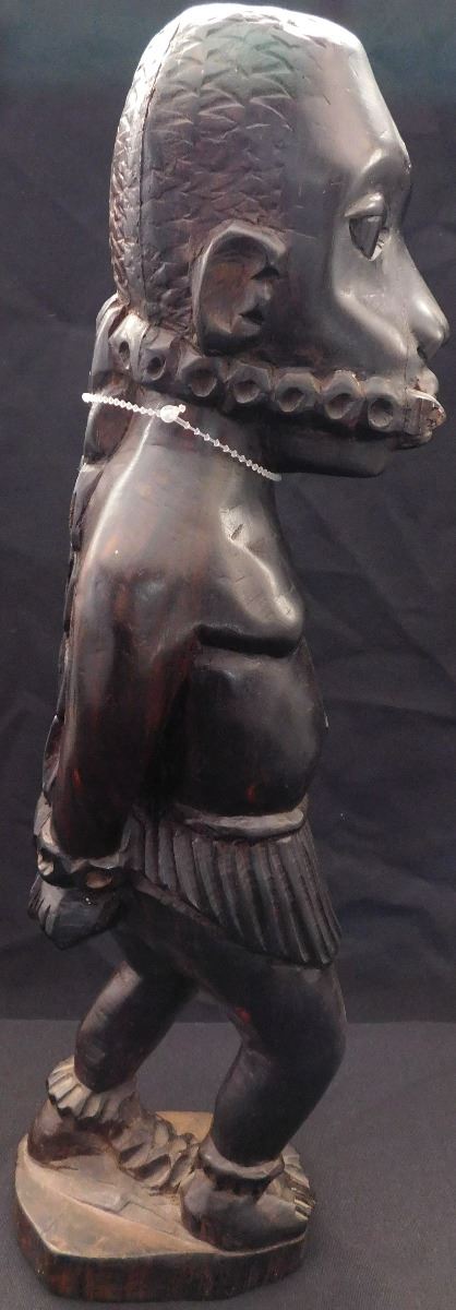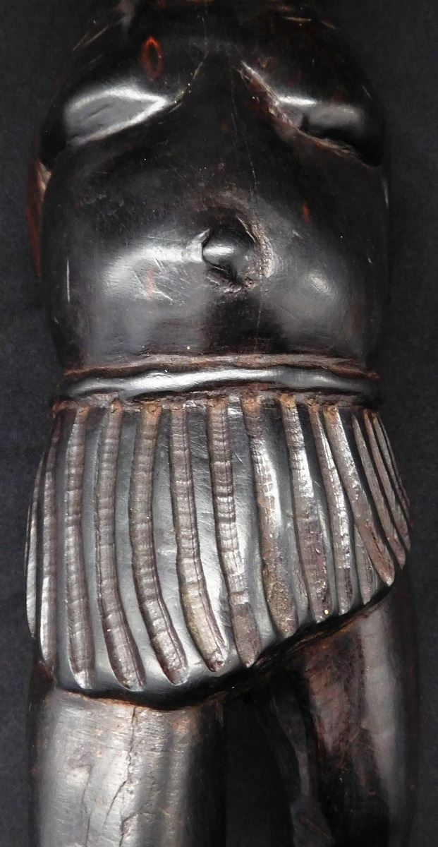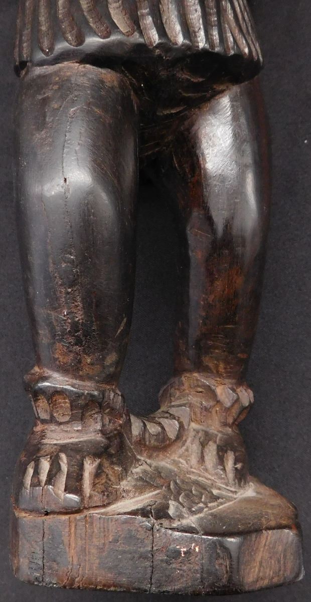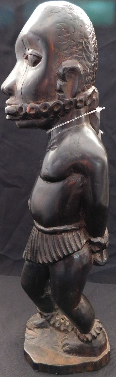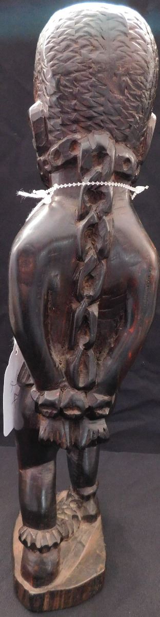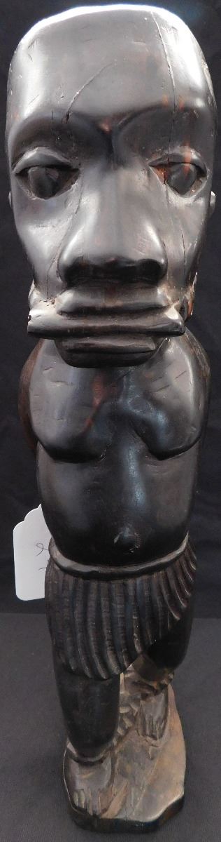 African Ebony Human Figure, circa 1800s. Made of ebony, item measures 16" tall x 4.5" x 5". From the Congo. Note the fine carving on head and skirt. This figure represents a captured male, likely during the slave trade era. Condition: Very fine, see images. Shipping: $24.00