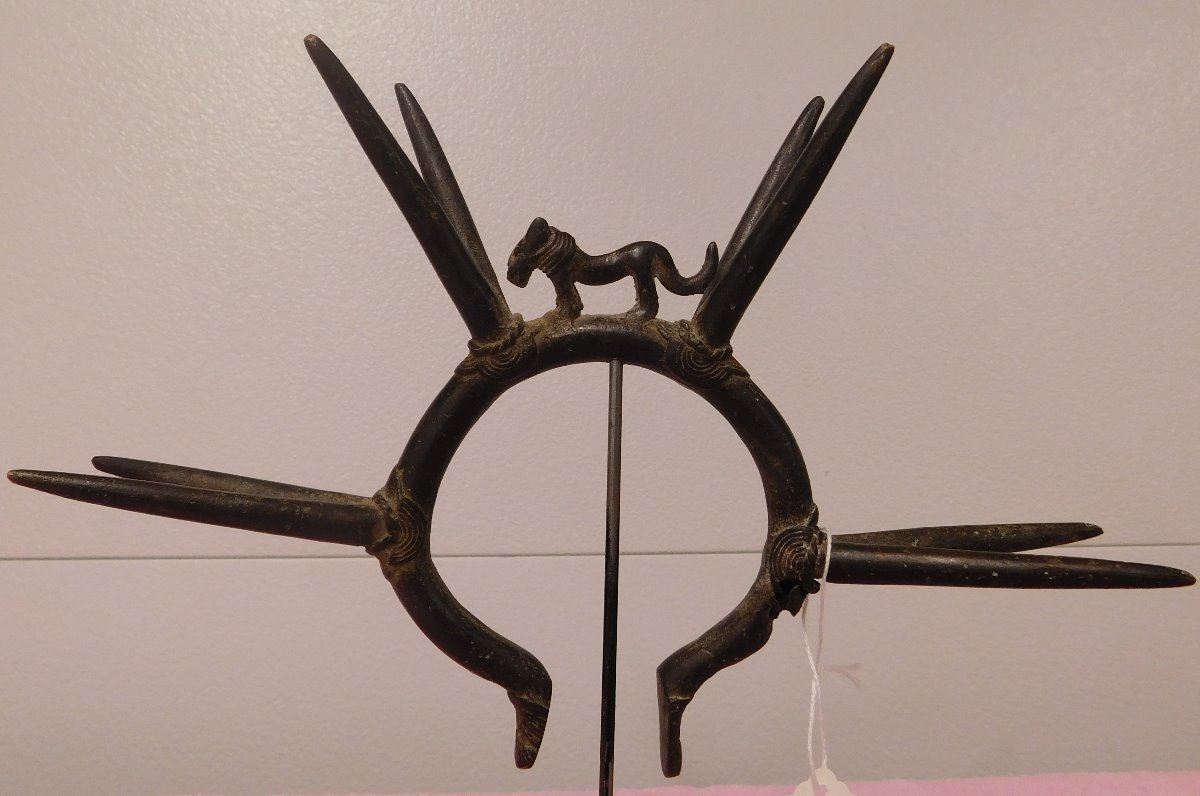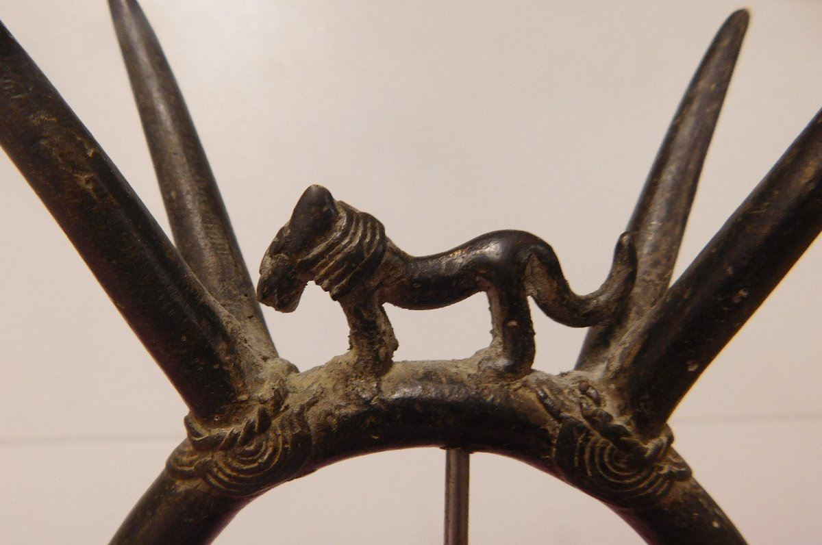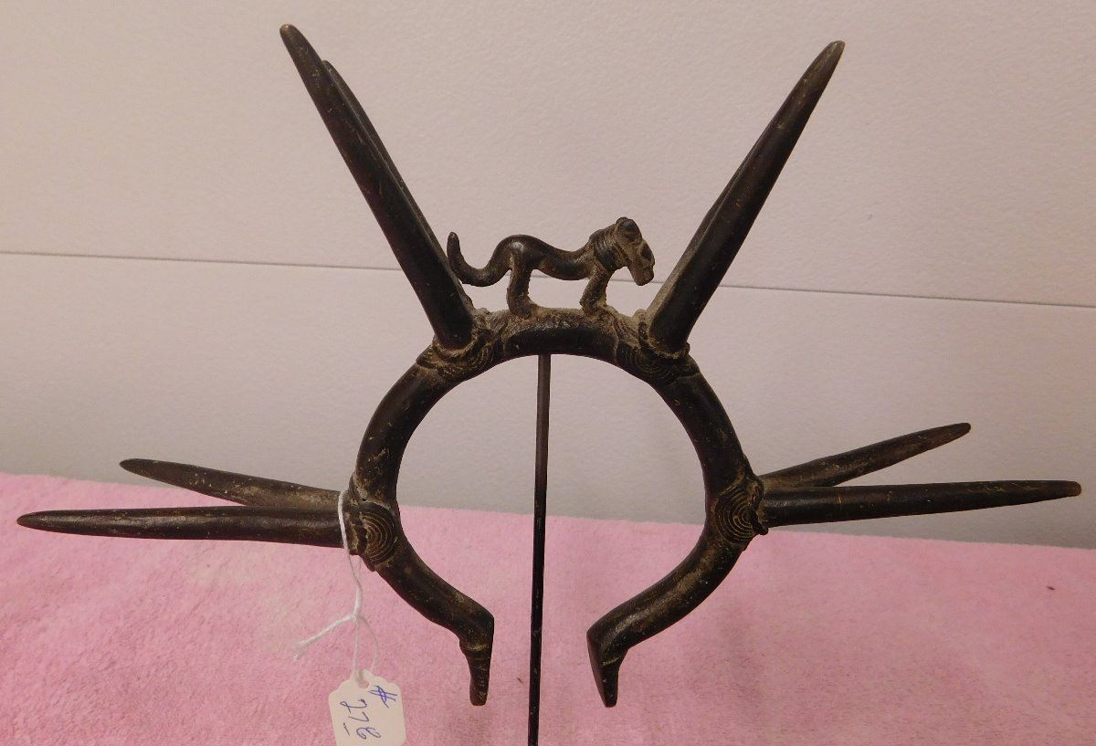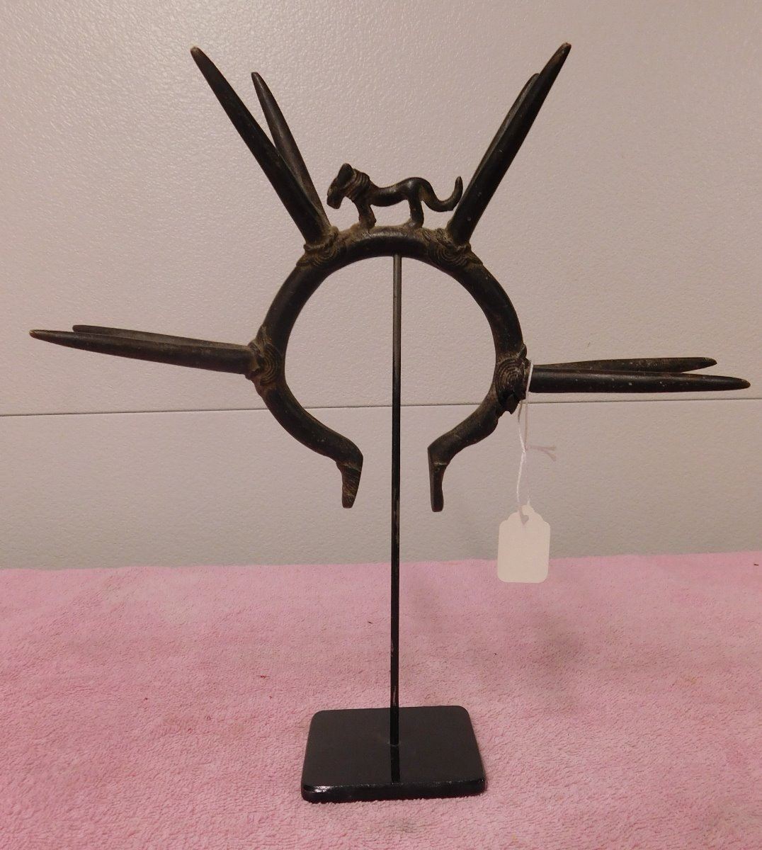 African Gold Weight on Stand, circa 1000 years old. Made of bronze, the item measures 10" x 10" x 2.25". From Ghana. Effigy gold weight. Condition: As found, see images. Shipping: $28.00 w/insurance and signature.