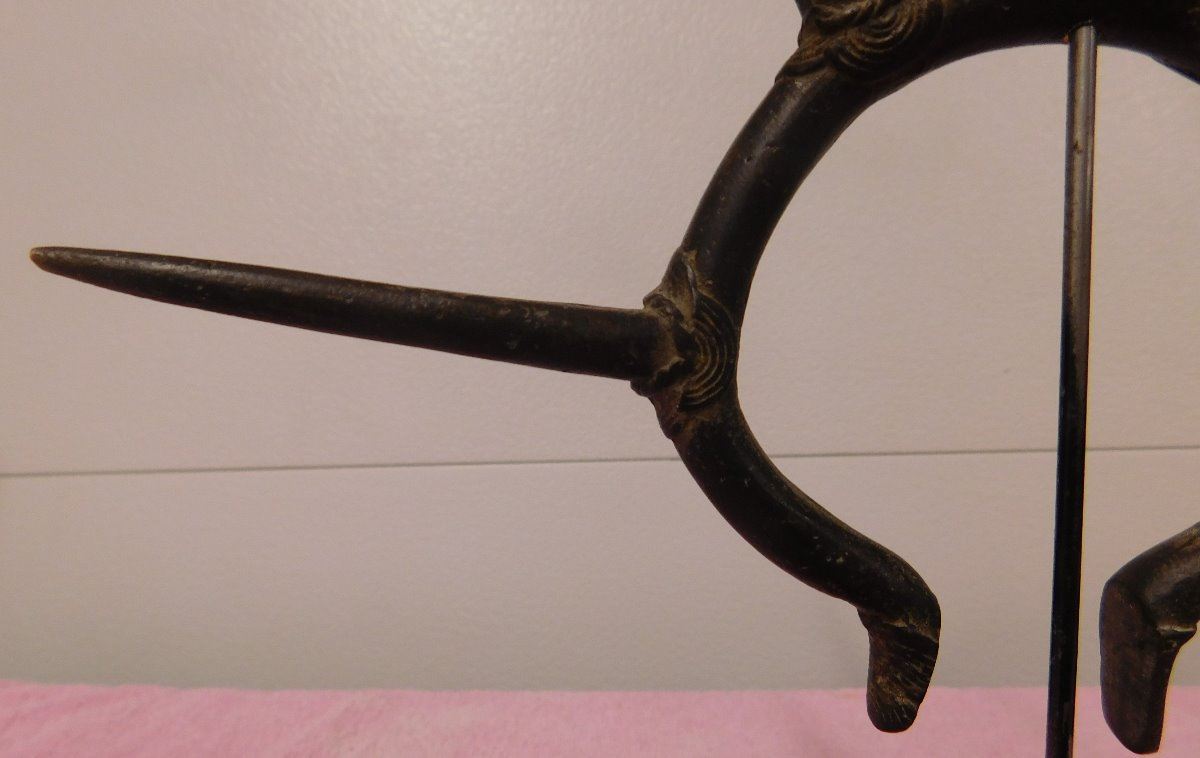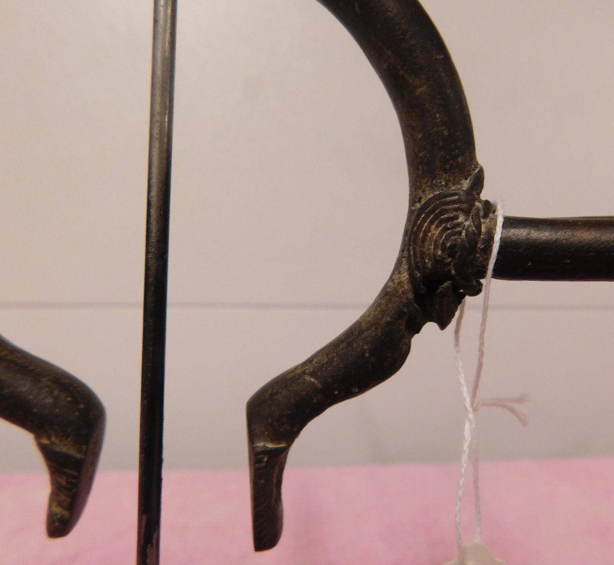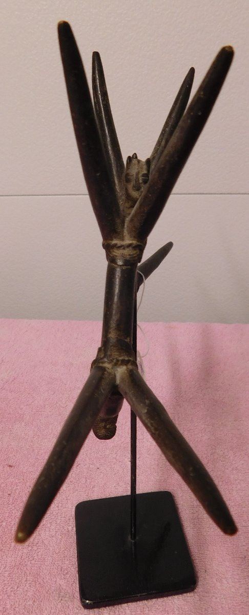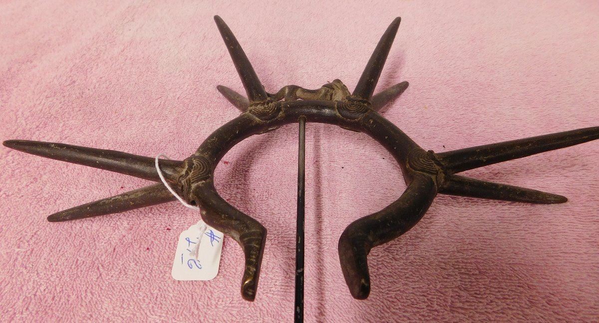 African Gold Weight on Stand, circa 1000 years old. Made of bronze, the item measures 10" x 10" x 2.25". From Ghana. Effigy gold weight. Condition: As found, see images. Shipping: $28.00 w/insurance and signature.