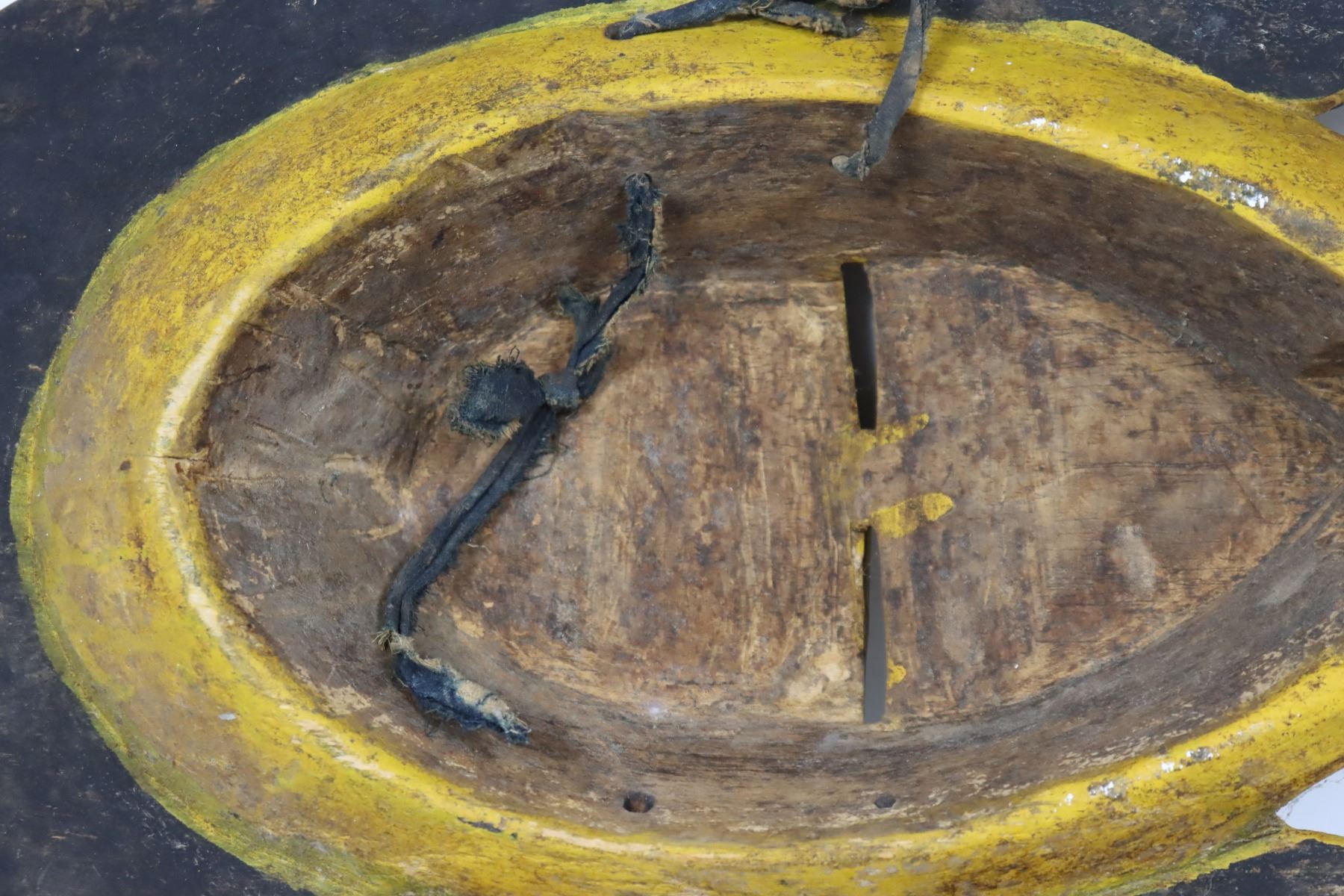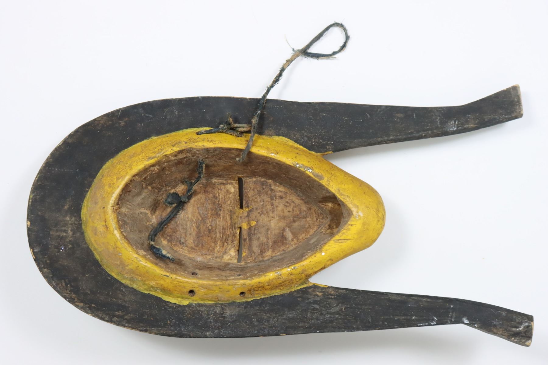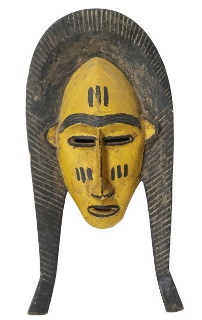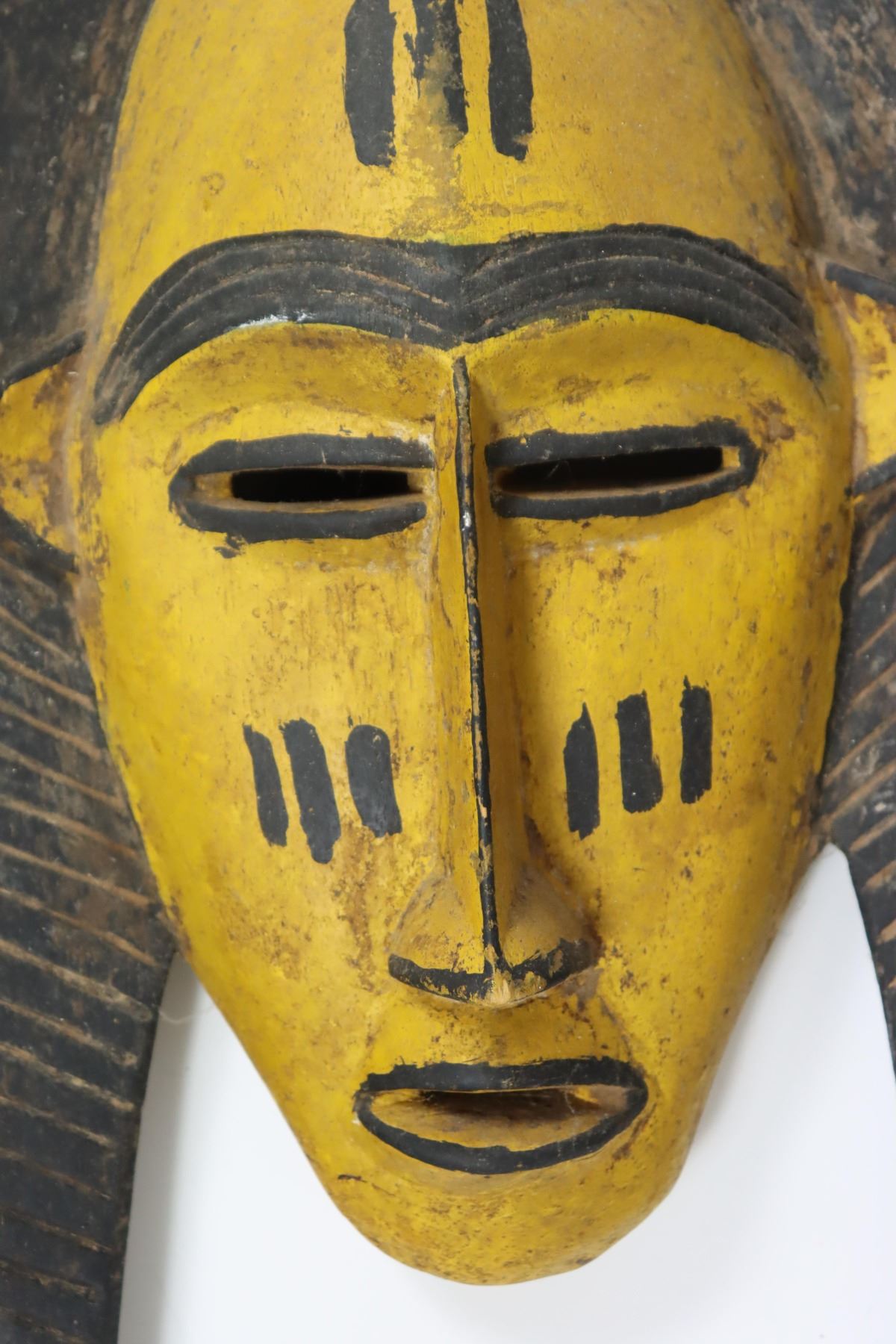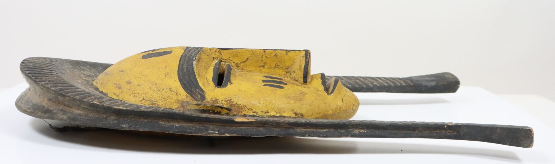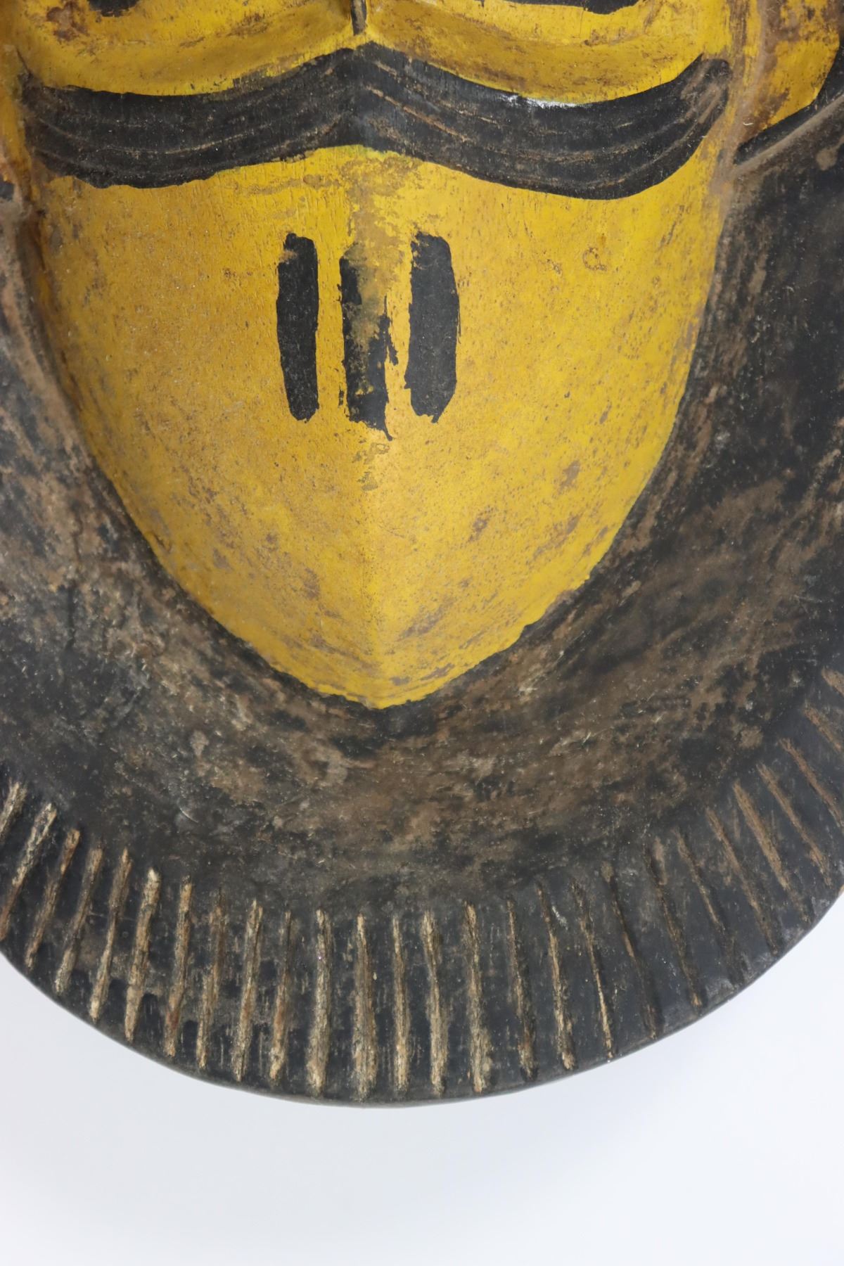 African hand made wooden mask with open slots for eyes. Face is a yellow color with black markings.