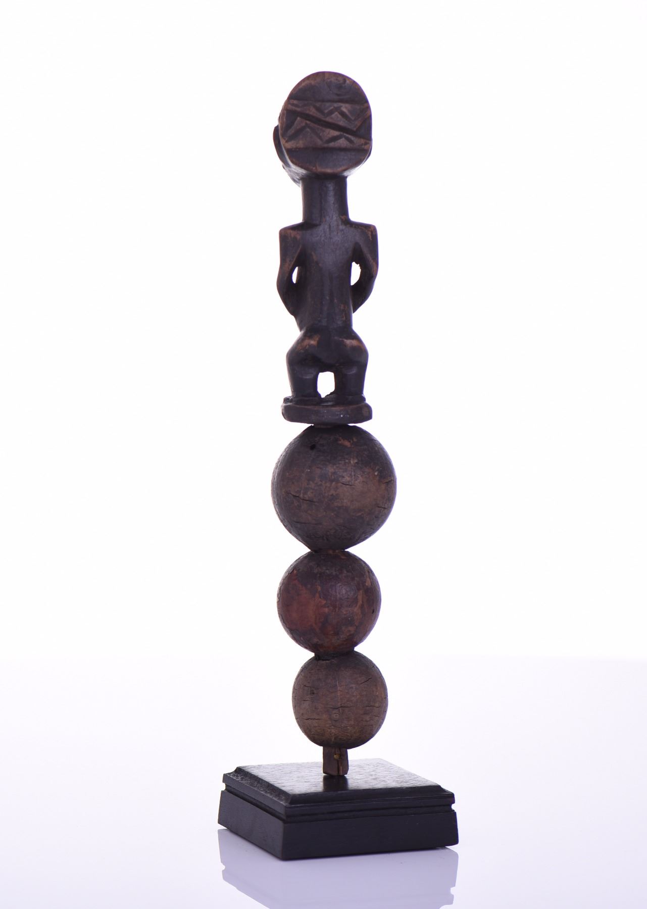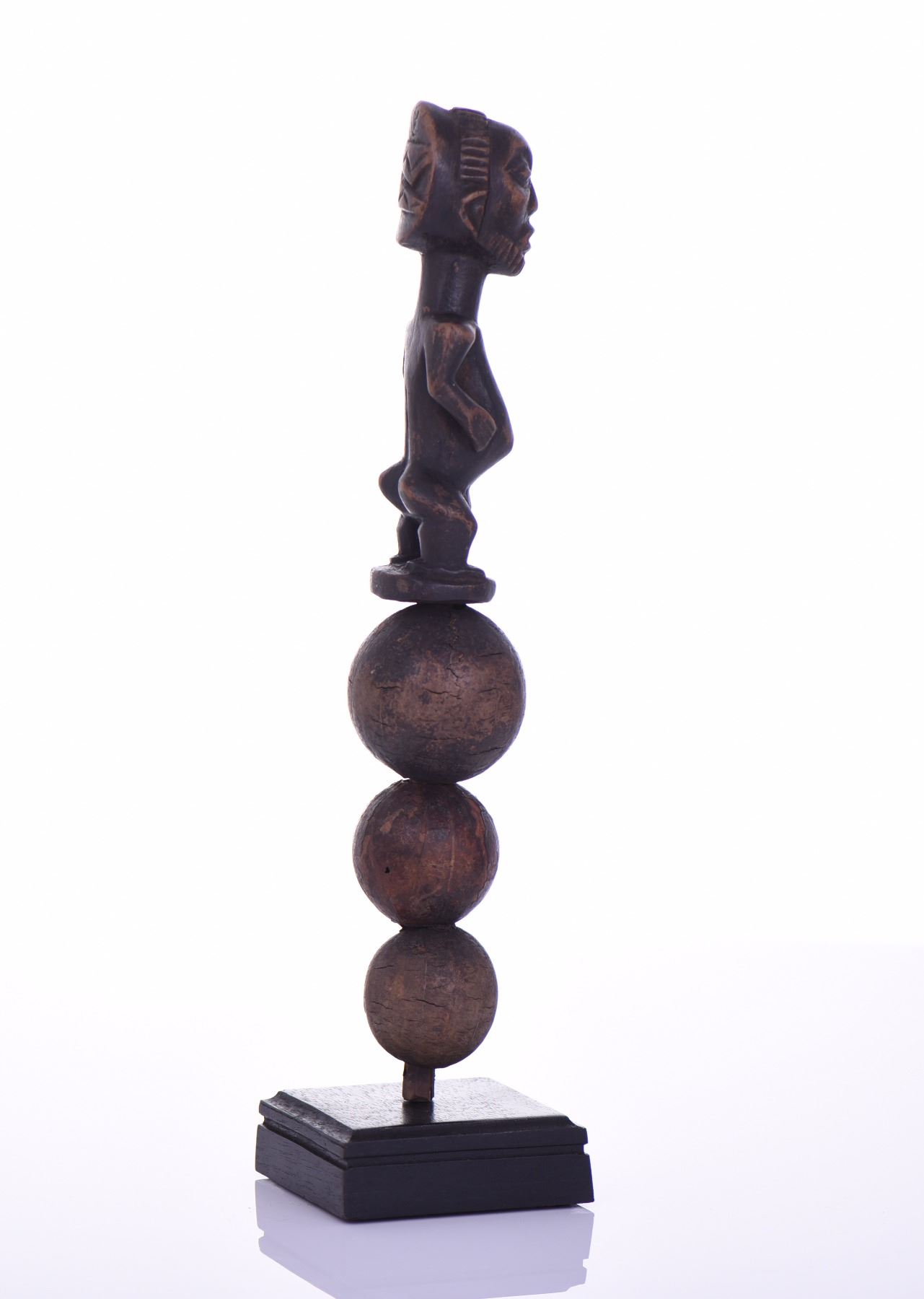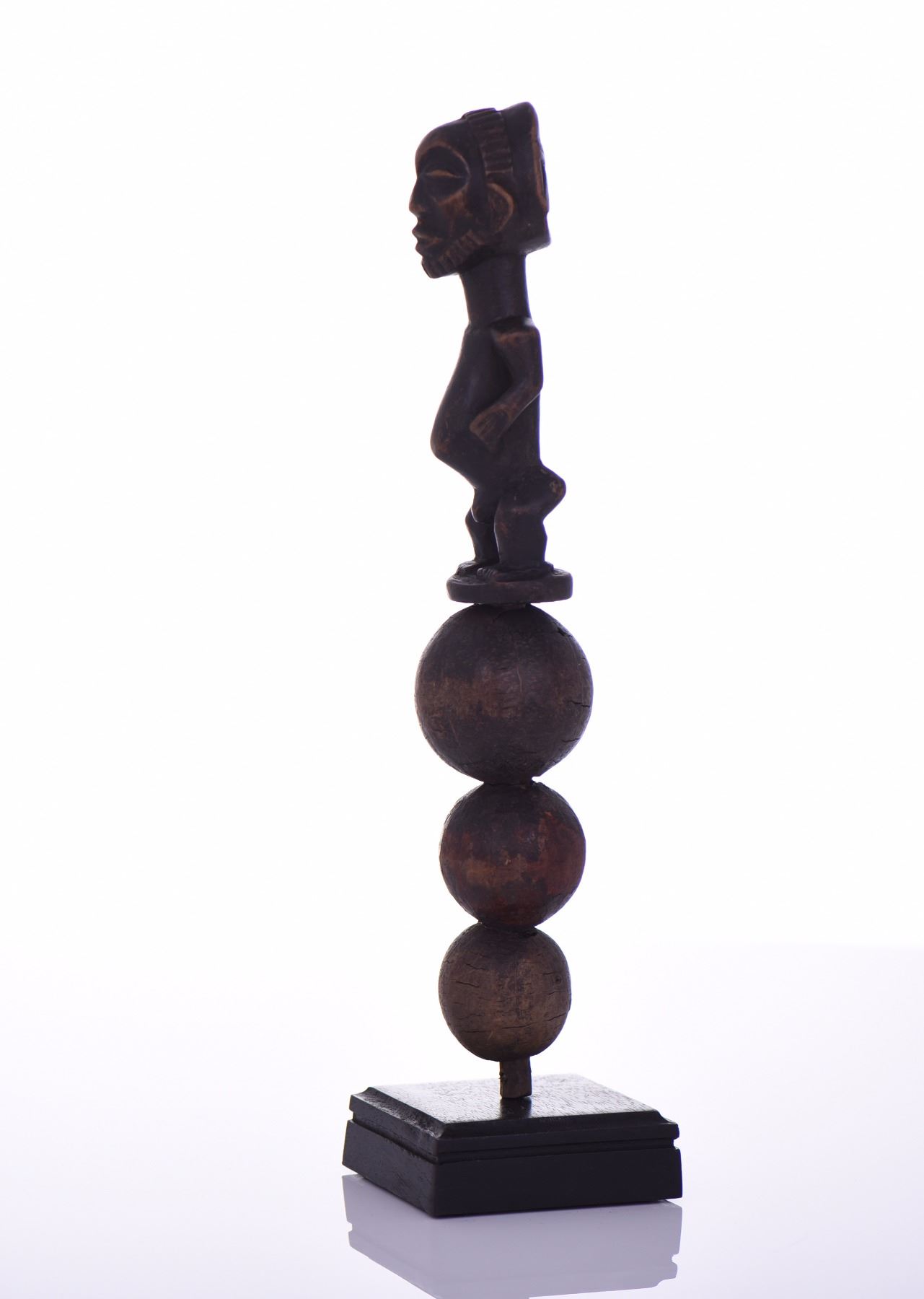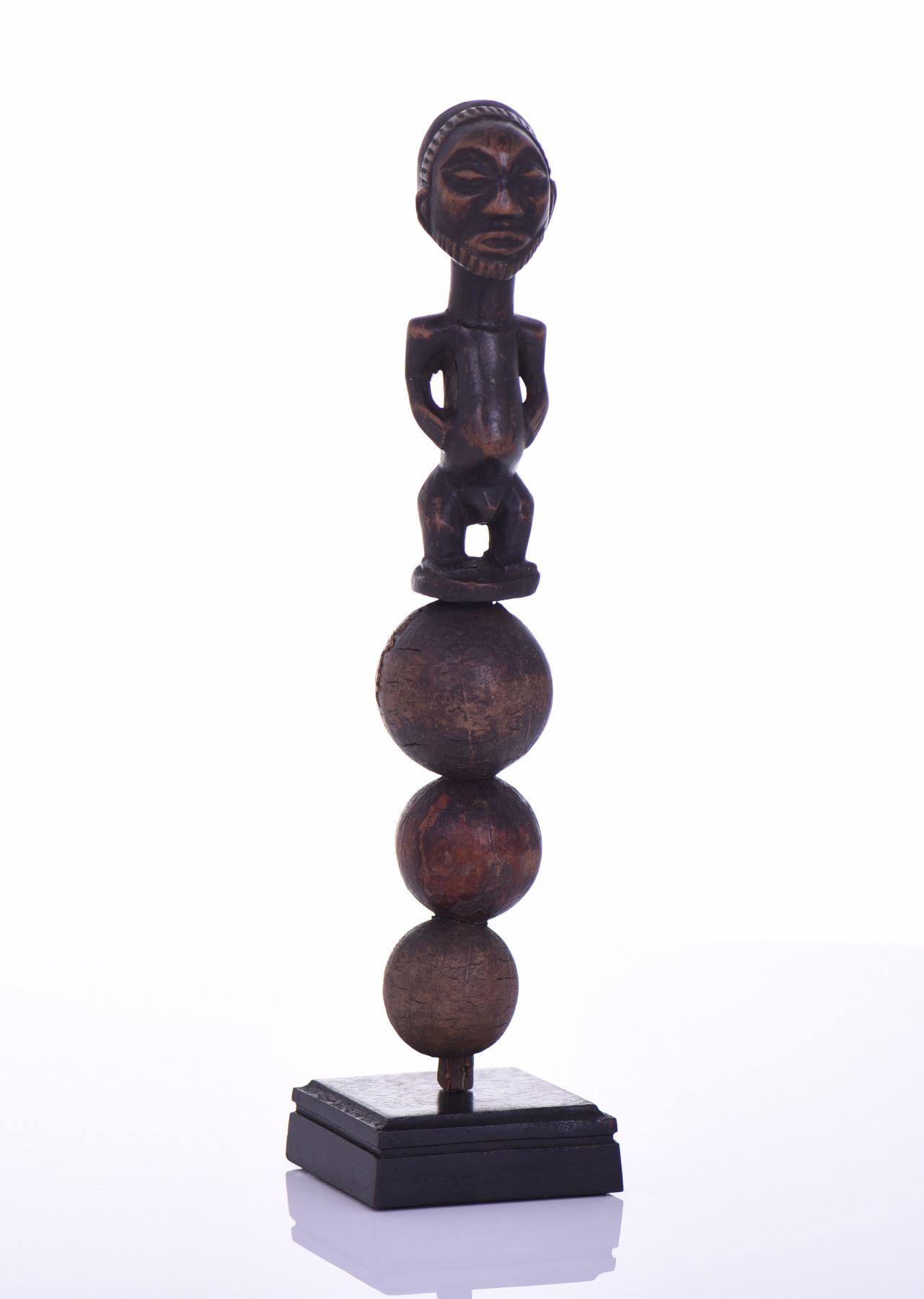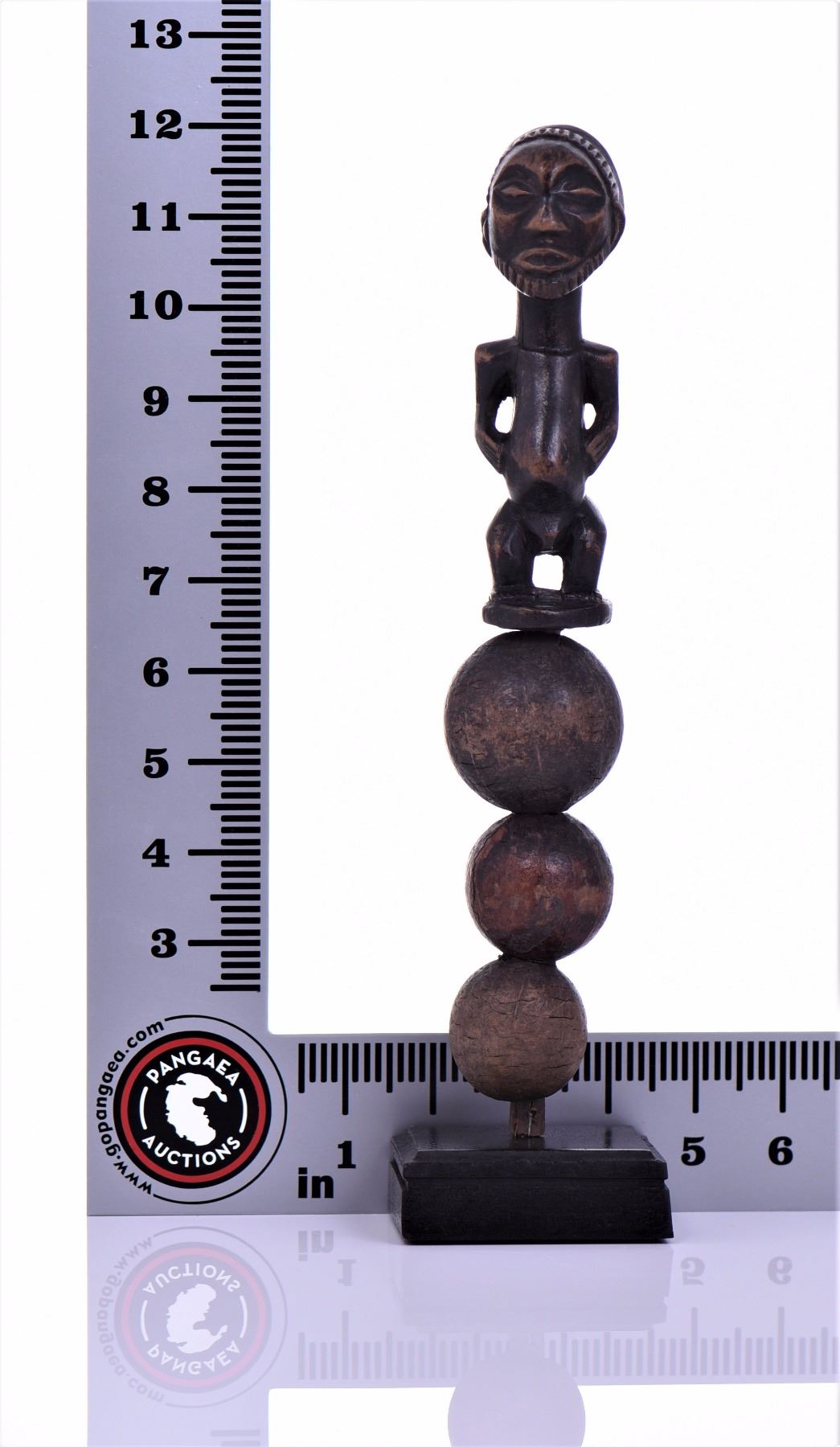 African Hemba Rattle And Power Figure Carved From Wood And Made With Natural Calabash Gourds, Lualaba River, Congo. Fully Functional And Rattles Loudly. Provenance: Ethnographic Tribal Museum Collection (See Auction Catalog Description). Some Lots Have Been On Exhibition And Have A Custom Made Metal Stand Specifically Designed To Fit The Work. Estimated more than 75 yrs. old. African art is a term typically used for the art of Sub-Saharan Africa. A few of the most popular traditional African art was produced by the tribal people of the Fang, Dan, Baoule, Dogon, Senufo, Makonde, Bambara, and San. Most African sculpture was historically in wood and other natural materials that have not survived from earlier than a few centuries ago; older pottery figures can be found from a number of areas. Masks are important elements in the art of many peoples, along with human figures, often highly stylized and in vast variety of styles. Sculpture is most common among "groups of settled cultivators in the areas drained by the Niger and Congo rivers. Direct images of deities are relatively infrequent, but masks in particular were made for religious ceremonies. Later West African cultures developed bronze casting for reliefs, like the Benin Bronzes, to decorate palaces and for highly naturalistic royal heads from around the Yoruba town of Ife, in terracotta as well as metal, from the 12th to 14th centuries. Akan gold weights are a form of small metal sculptures produced over the period 1400–1900; some apparently represent proverbs, contributing a narrative element rare in African sculpture; and royal regalia included impressive gold sculptured elements. Many West African figures are used in religious rituals and are often coated with materials placed on them for ceremonial offerings. Eastern Africans, in many areas shorter of large timber to carve, are known for Tinga Tinga paintings and Makonde sculptures. There is also tradition of producing textile art. Modern Zimbabwean sculptors in soapstone have achieved considerable international success. Southern Africa's oldest known clay figures date from 400 to 600 AD and have cylindrical heads with a mixture of human and animal features. (Wikipedia) Size and/or Weight: See Measurement Photo. (Photos Represent The Lot Condition, Pangaea Auctions)