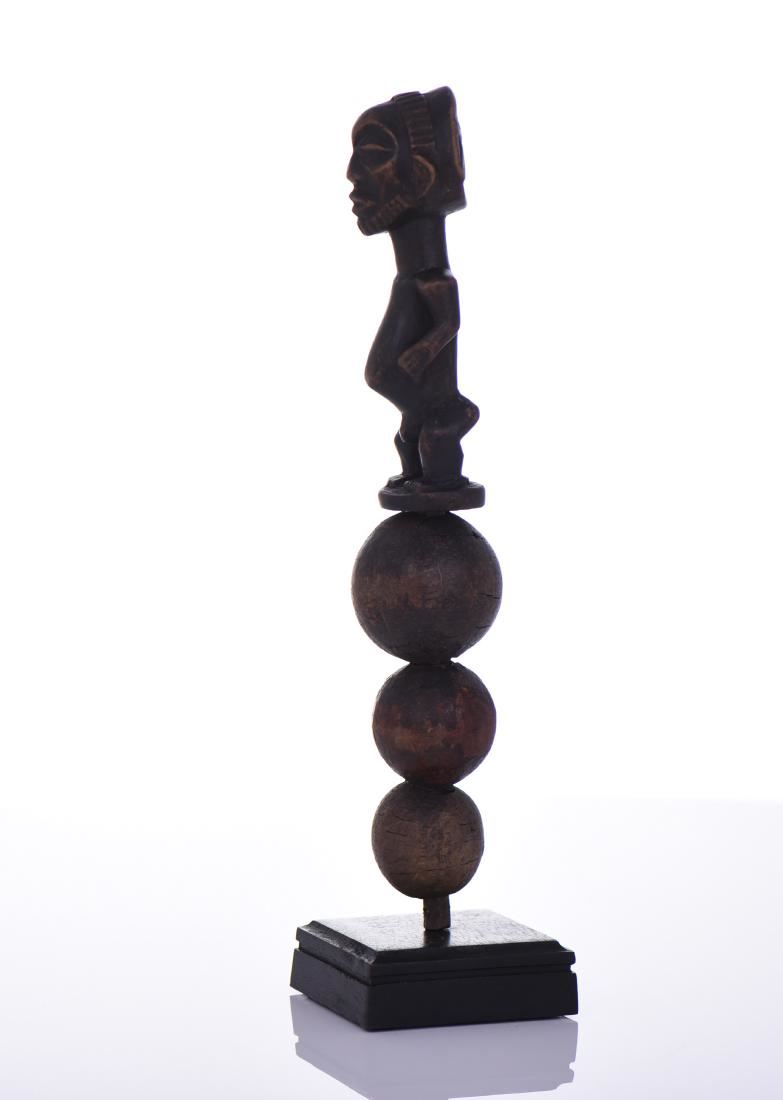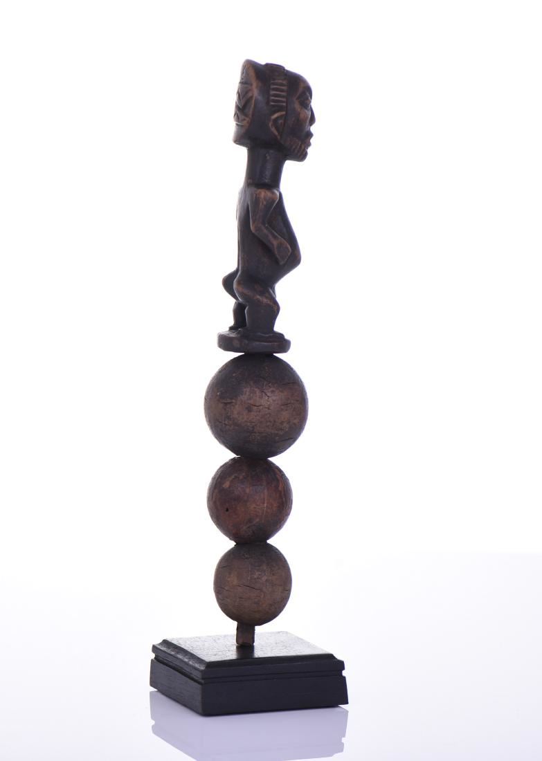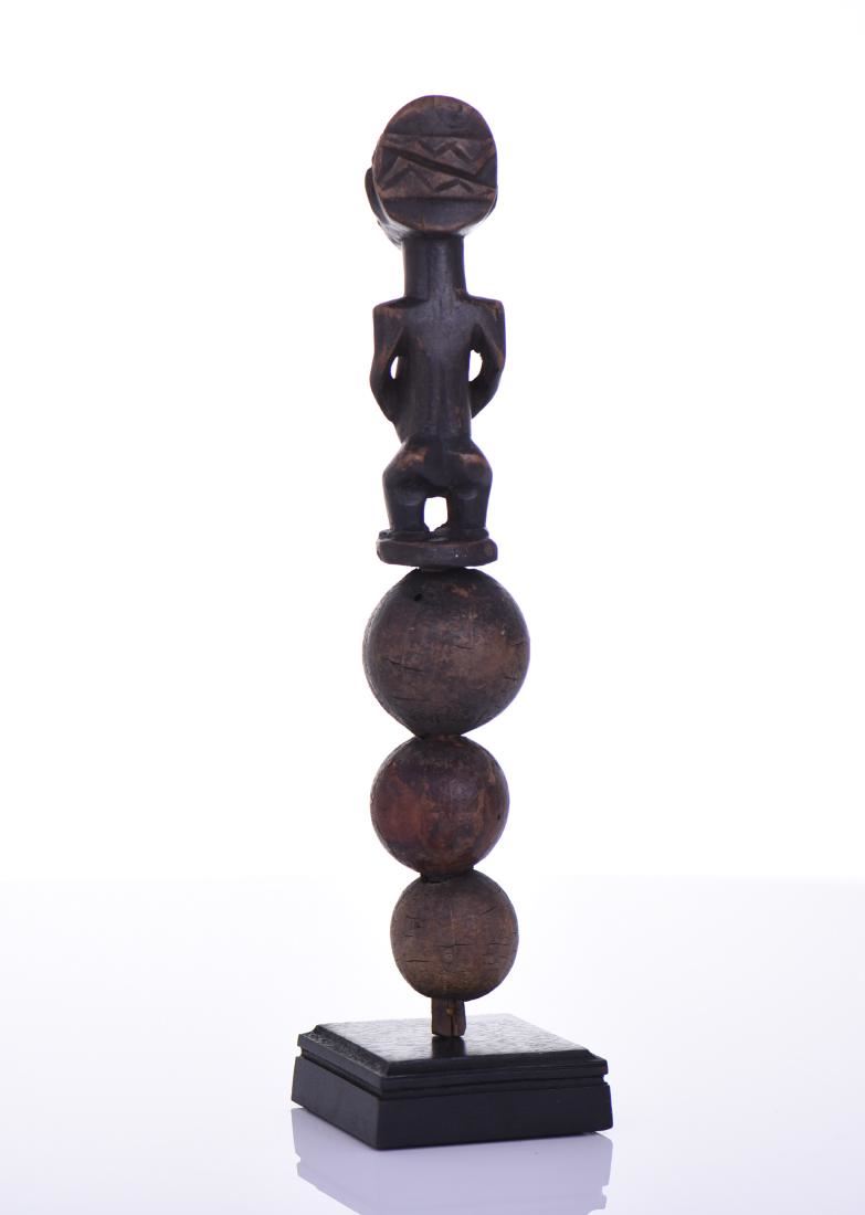African Hemba Rattle And Power Figure Carved From Wood And Made With Natural Calabash Gourds, Lualaba River, Congo. Fully Functional And Rattles Loudly. Provenance: Ethnographic Tribal Museum Collection (See Auction Catalog Description). Some Lots Have Been On Exhibition And Have A Custom Made Metal Stand Specifically Designed To Fit The Work. Estimated more than 75 yrs old. African art is a term typically used for the art of Sub-Saharan Africa. A few of the most popular traditional African art was produced by the tribal people of the Fang, Dan, Baoule, Dogon, Senoufo, Makonde, Bambara, and San. Most African sculpture was historically in wood and other natural materials that have not survived from earlier than a few centuries ago; older pottery figures can be found from a number of areas. Masks are important elements in the art of many peoples, along with human figures, often highly stylized and in vast variety of styles. Sculpture is most common among "groups of settled cultivators in the areas drained by the Niger and Congo rivers. Direct images of deities are relatively infrequent, but masks in particular were made for religious ceremonies. Later West African cultures developed bronze casting for reliefs, like the Benin Bronzes, to decorate palaces and for highly naturalistic royal heads from around the Yoruba town of Ife, in terracotta as well as metal, from the 12th to 14th centuries. Akan gold weights are a form of small metal sculptures produced over the period 1400–1900; some apparently represent proverbs, contributing a narrative element rare in African sculpture; and royal regalia included impressive gold sculptured elements. Many West African figures are used in religious rituals and are often coated with materials placed on them for ceremonial offerings. Eastern Africans, in many areas shorter of large timber to carve, are known for Tinga Tinga paintings and Makonde sculptures. There is also tradition of producing textile art. Modern Zimbabwean sculptors in soapstone have achieved considerable international success. Southern Africa's oldest known clay figures date from 400 to 600 AD and have cylindrical heads with a mixture of human and animal features. (Wikipedia) Size and/or Weight: See Measurement Photo. (Photos Represent The Lot Condition.)