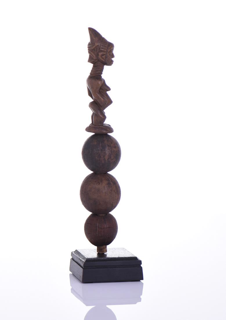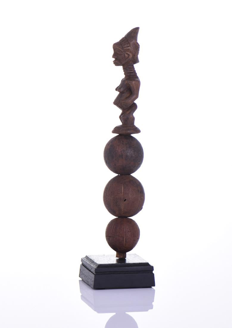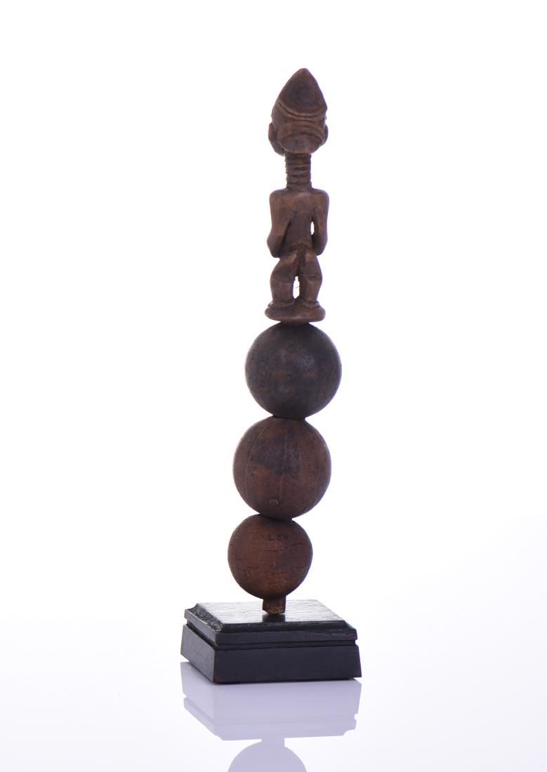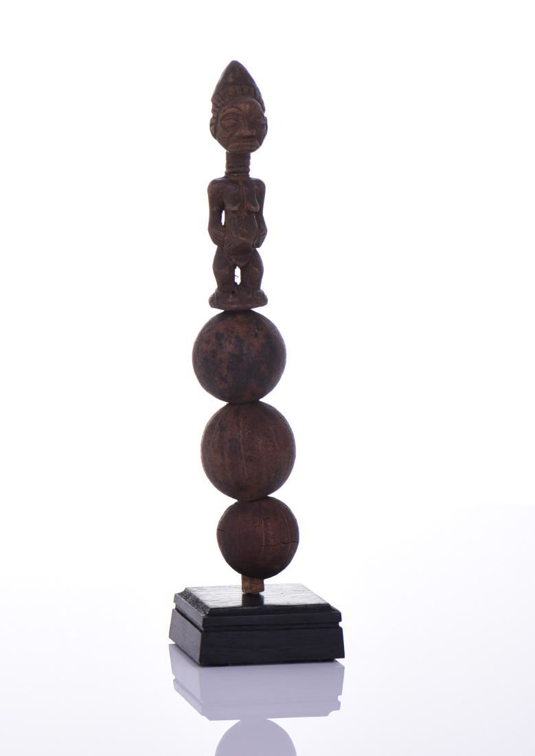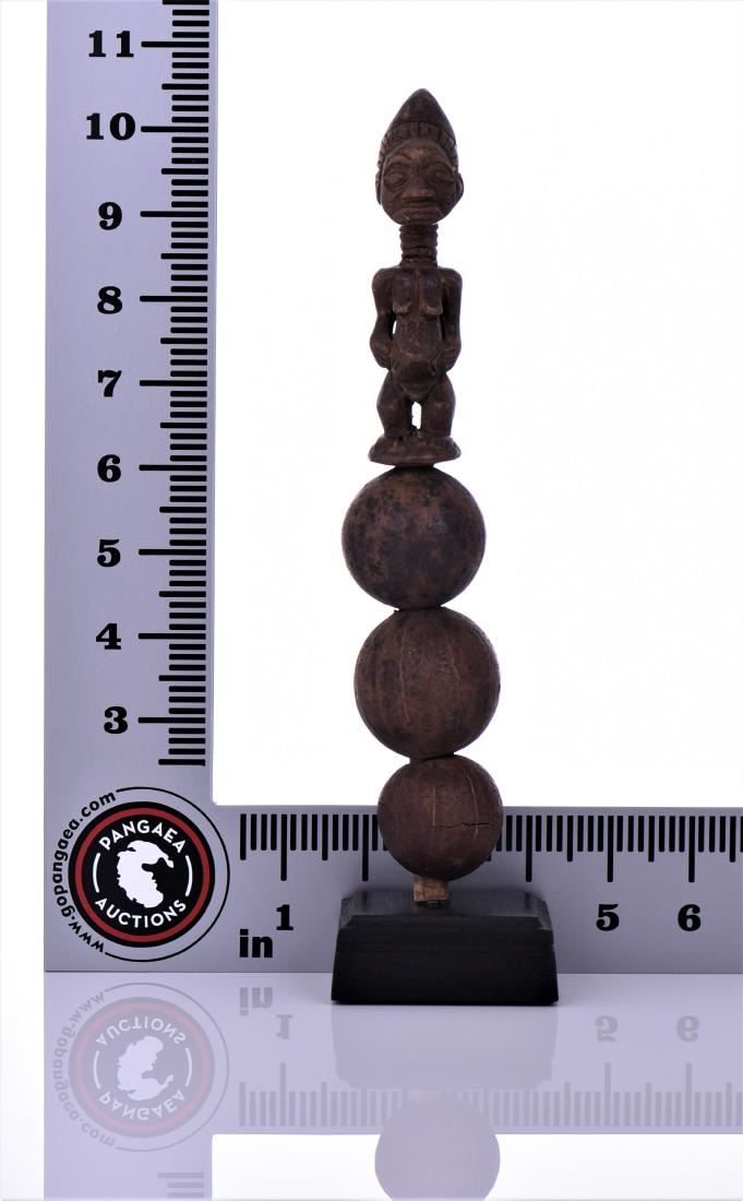 African Hemba Rattle And Power Figure Carved From Wood And Made With Natural Calabash Gourds, Lualaba River, Congo. Fully Functional And Rattles Loudly. Provenance: Ethnographic Tribal Museum Collection (See Auction Catalog Description). Some Lots Have Been On Exhibition And Have A Custom Made Metal Stand Specifically Designed To Fit The Work. Estimated more than 75 yrs old. African art is a term typically used for the art of Sub-Saharan Africa. A few of the most popular traditional African art was produced by the tribal people of the Fang, Dan, Baoule, Dogon, Senoufo, Makonde, Bambara, and San. Most African sculpture was historically in wood and other natural materials that have not survived from earlier than a few centuries ago; older pottery figures can be found from a number of areas. Masks are important elements in the art of many peoples, along with human figures, often highly stylized and in vast variety of styles. Sculpture is most common among "groups of settled cultivators in the areas drained by the Niger and Congo rivers. Direct images of deities are relatively infrequent, but masks in particular were made for religious ceremonies. Later West African cultures developed bronze casting for reliefs, like the Benin Bronzes, to decorate palaces and for highly naturalistic royal heads from around the Yoruba town of Ife, in terracotta as well as metal, from the 12th to 14th centuries. Akan gold weights are a form of small metal sculptures produced over the period 1400–1900; some apparently represent proverbs, contributing a narrative element rare in African sculpture; and royal regalia included impressive gold sculptured elements. Many West African figures are used in religious rituals and are often coated with materials placed on them for ceremonial offerings. Eastern Africans, in many areas shorter of large timber to carve, are known for Tinga Tinga paintings and Makonde sculptures. There is also tradition of producing textile art. Modern Zimbabwean sculptors in soapstone have achieved considerable international success. Southern Africa's oldest known clay figures date from 400 to 600 AD and have cylindrical heads with a mixture of human and animal features. (Wikipedia) Size and/or Weight: See Measurement Photo. (Photos Represent The Lot Condition.)