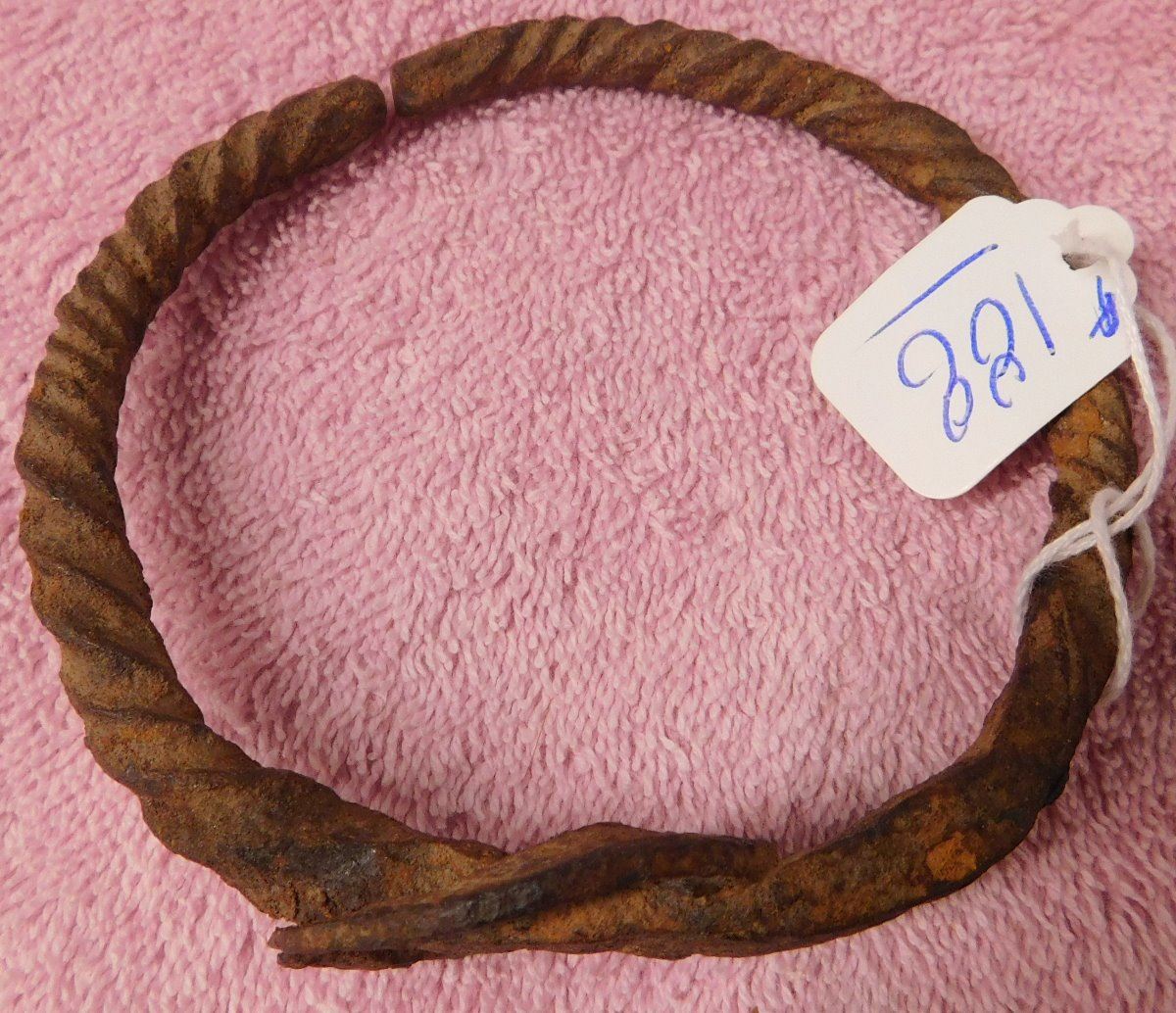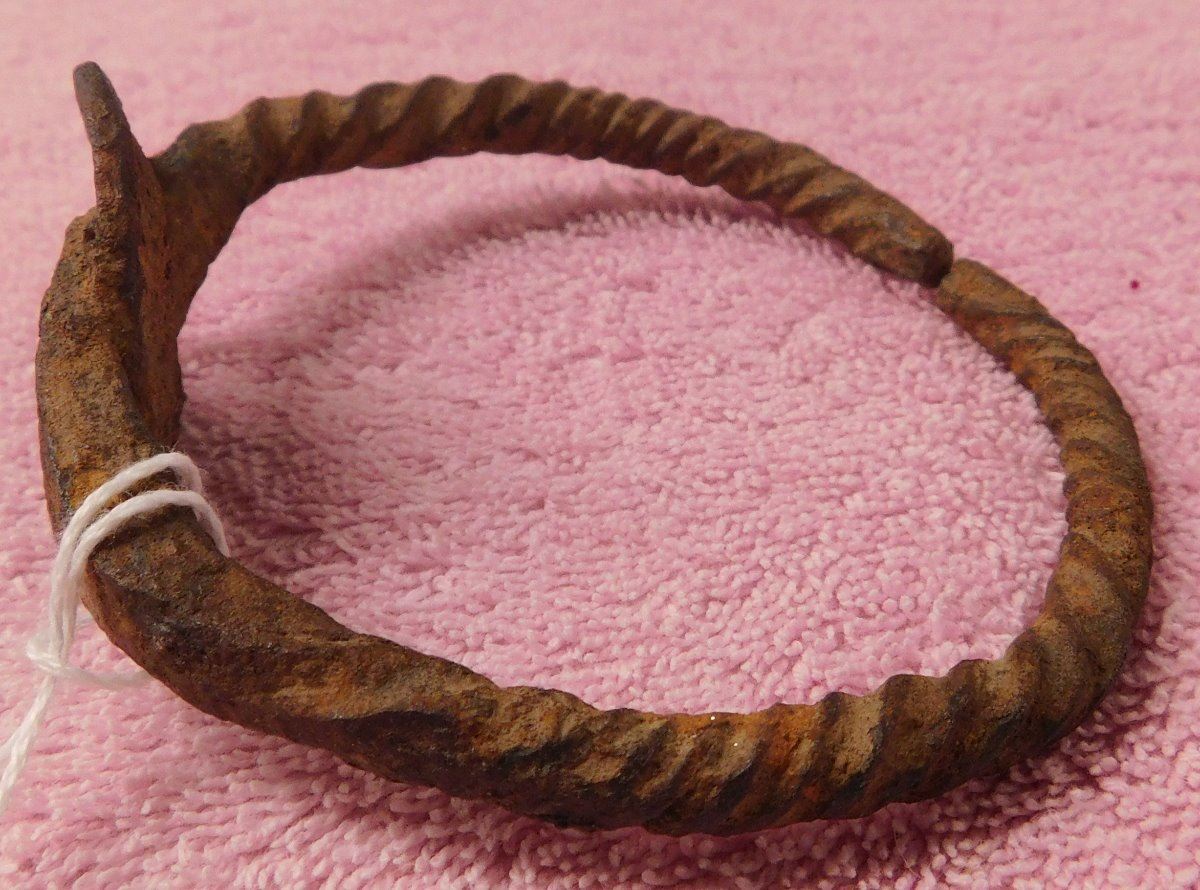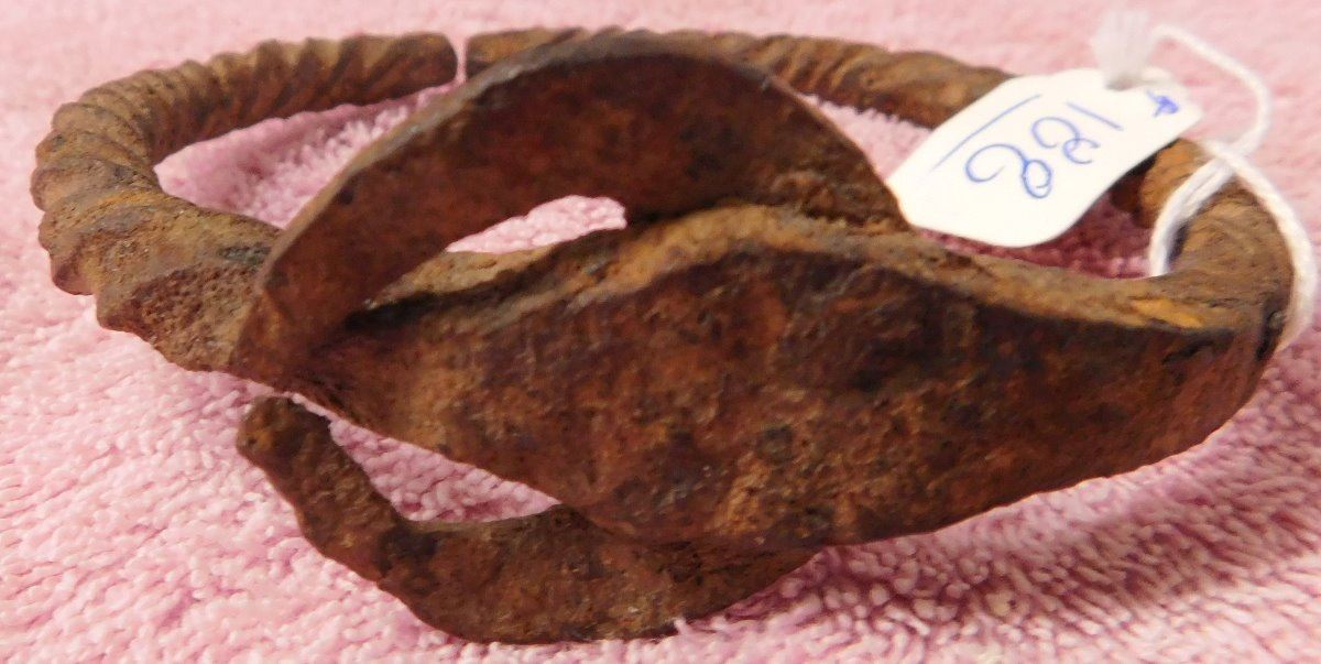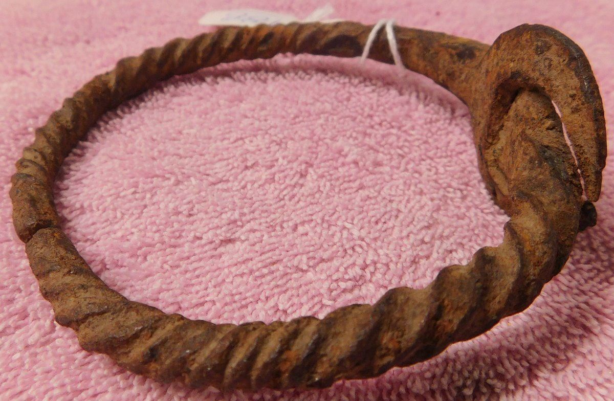 African Iron Bracelet, pre-historic item. Made of iron, the cuff measures 3.75" x 3.5" x 1.5". From Nigeria. Nice archaelogical relic. Condition: Some rust, see images. Shipping: $15.50 w/insurance and signature.