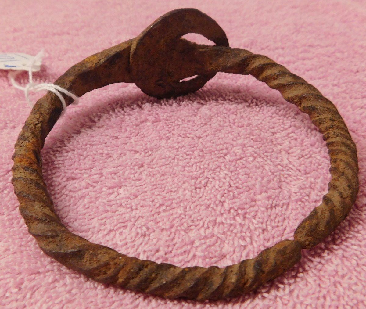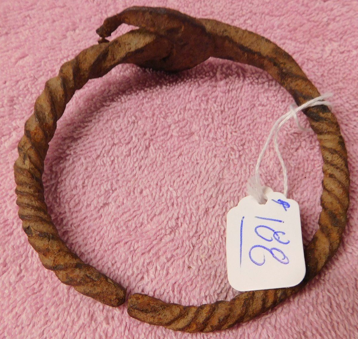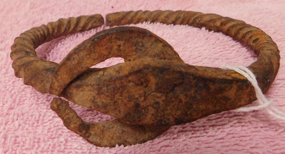 African Iron Bracelet, pre-historic item. Made of iron, the cuff measures 3.75" x 3.5" x 1.5". From Nigeria. Nice archaelogical relic. Condition: Some rust, see images. Shipping: $15.50 w/insurance and signature.