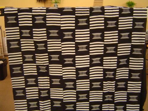This is authentic, high quality, hand woven, double weave, Kente from Ghana. Use this Kente as a piece of African Artifact, for designer projects or give it as a gift. This piece is a Black & White authentic Ghana pattern, woven in 4.5" strips and sewn together to make this 34.75" wide X 66" long piece of cloth. Kente is Ashanti (Asante) (Ghana, Kumasi, West Africa) Ceremonial Cloth that is hand woven on a horizontal treadle loom. The strips are used seperately or sewn together into larger pieces of cloth. Kente history goes back to the 17th Century and is a visual representation of history, ethics, oral literature, philosophy, moral values and religious beliefs.