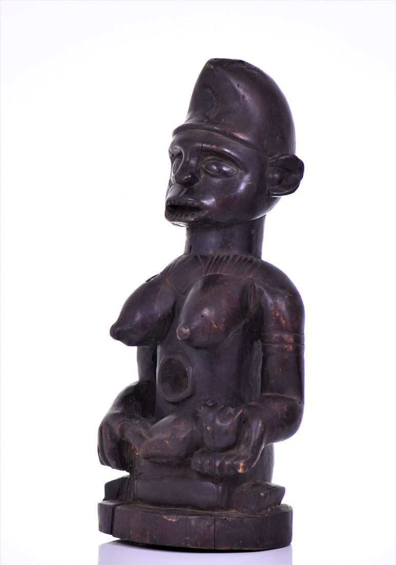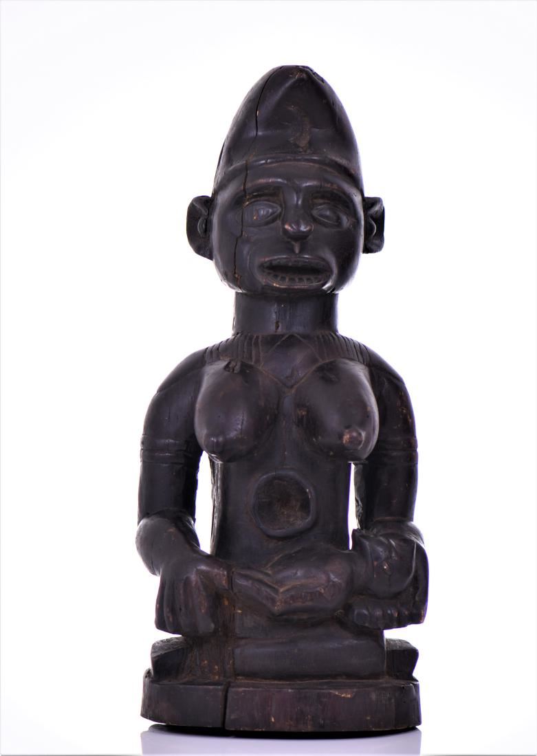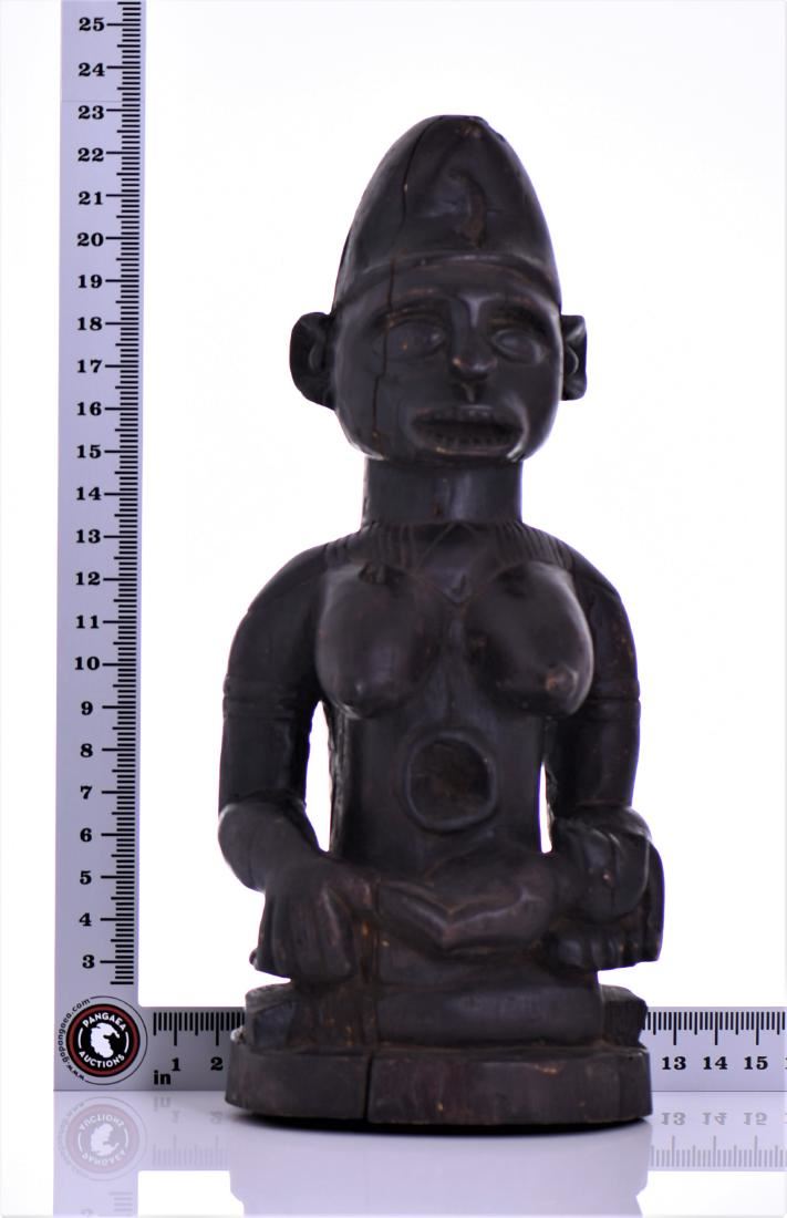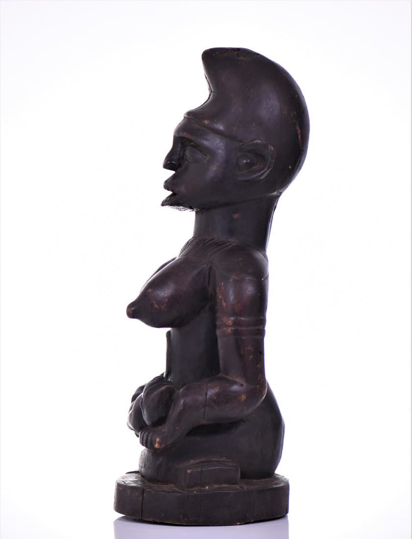 African Kongo Yombe Maternity Figure, Congo. A particularly sensitive tradition of maternity sculpture emerged in the last millennium among the peoples of the Kongo kingdom in the western Congo. Wood sculptures known as phemba were created for use in association with women's cults, and found their highest expression among the Kongo-Yombe subgroup. Provenance: Ethnographic Tribal Museum Collection (See Auction Catalog Description). Some Lots Have Been On Exhibition And Have A Custom Made Metal Stand Specifically Designed To Fit The Work. Estimated more than 75 yrs old. (Pangaea Auctions) Size and/or Weight: See Measurement Photo. (Photos Represent The Lot Condition.)