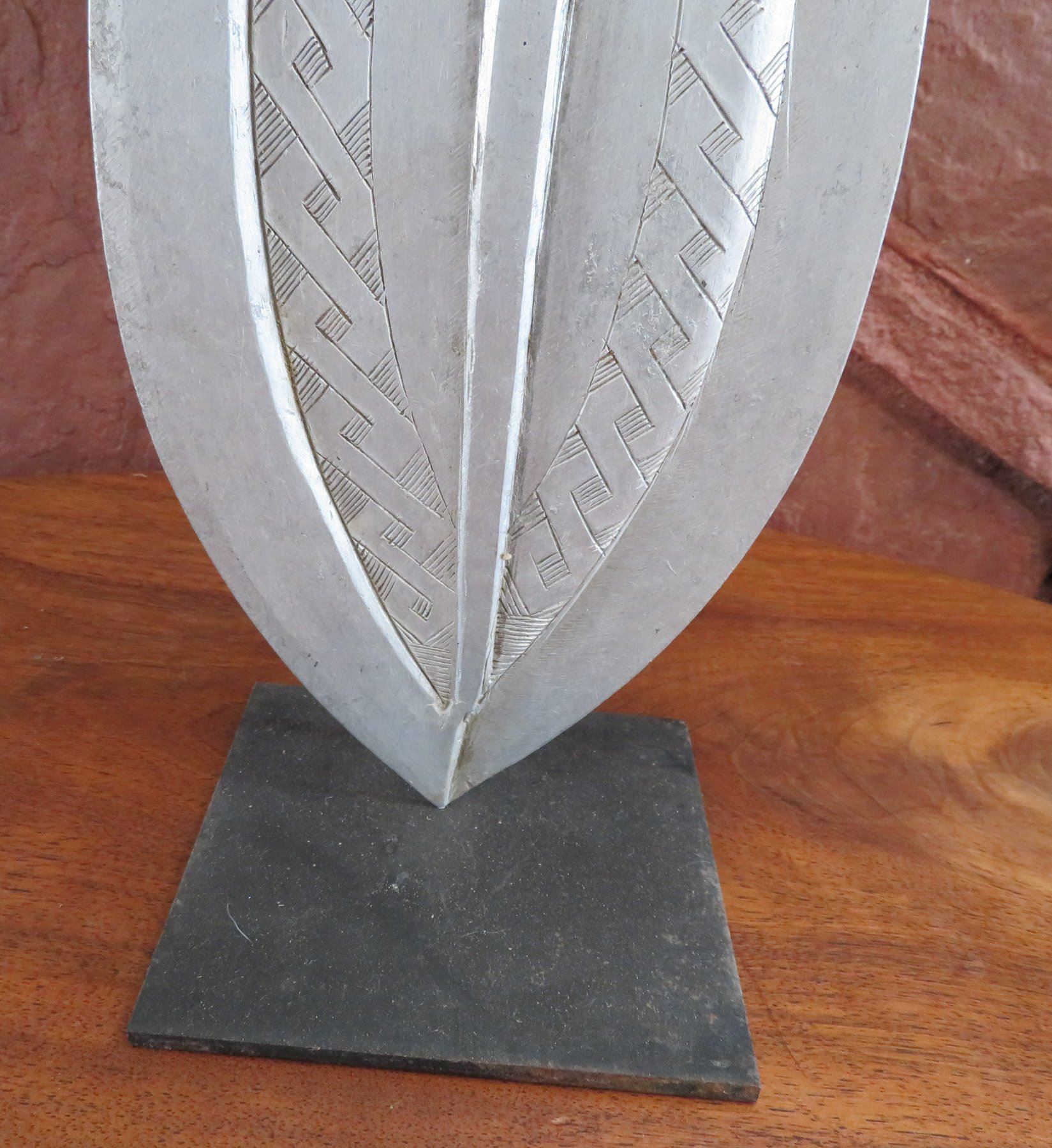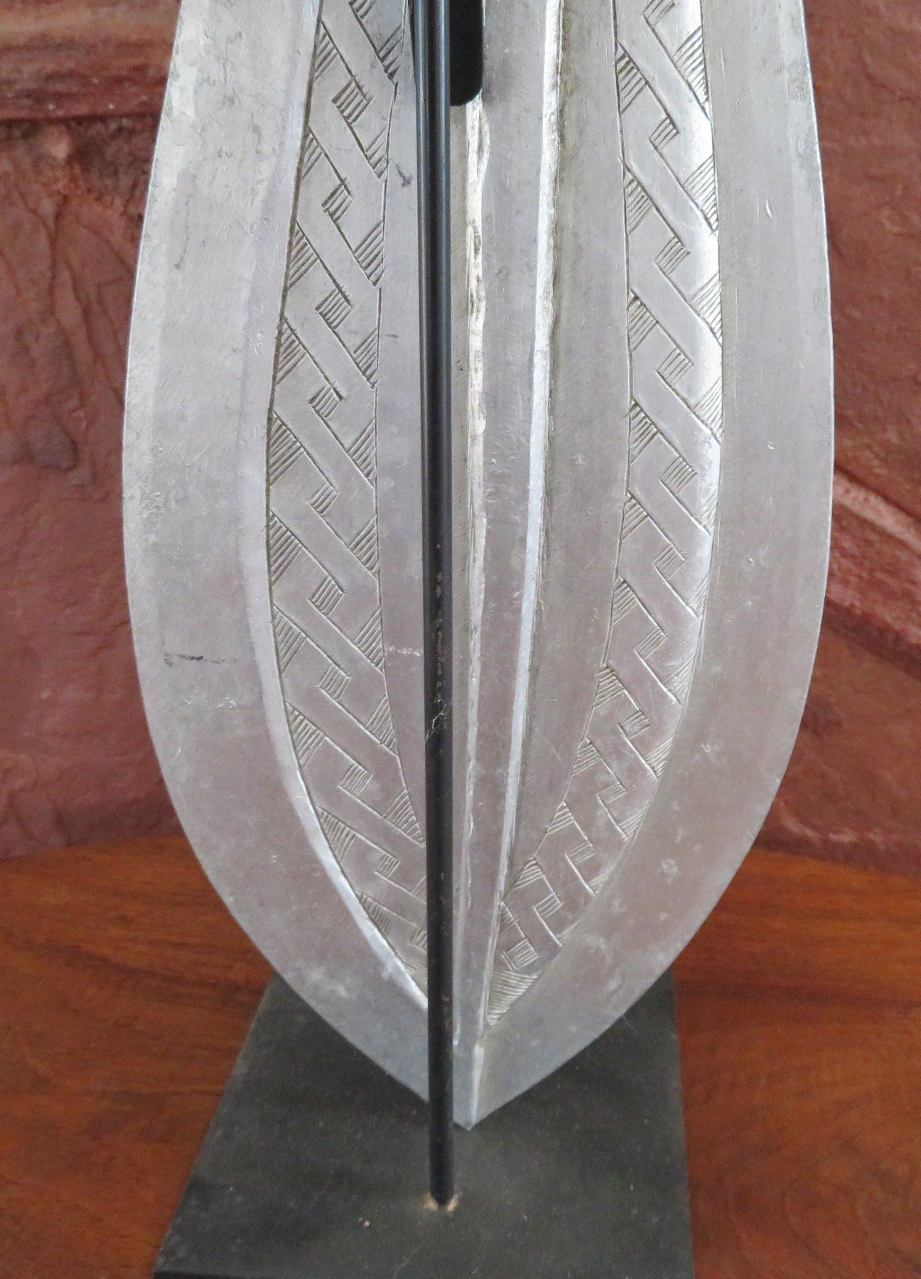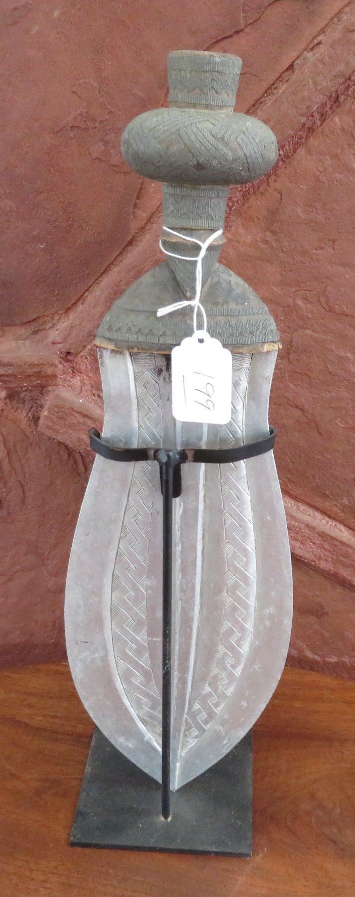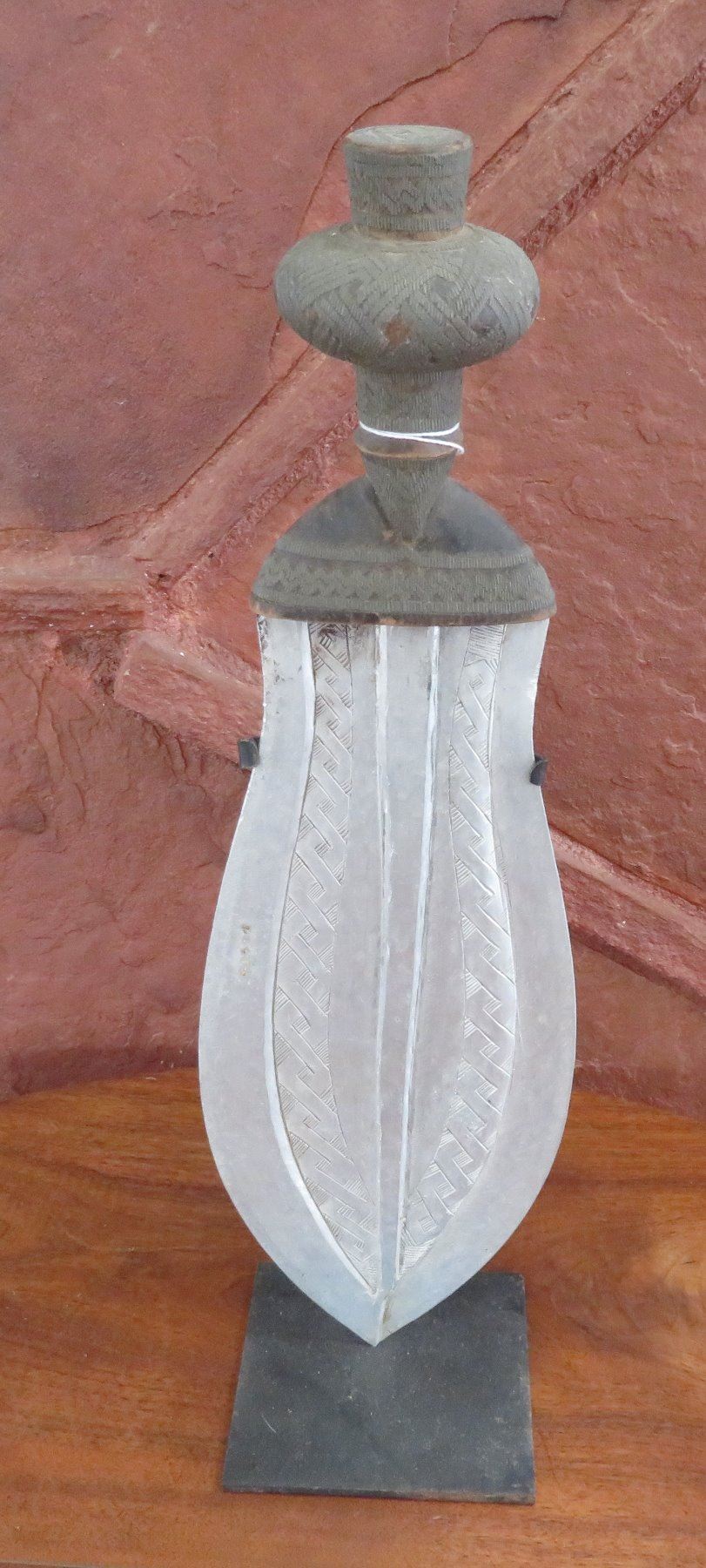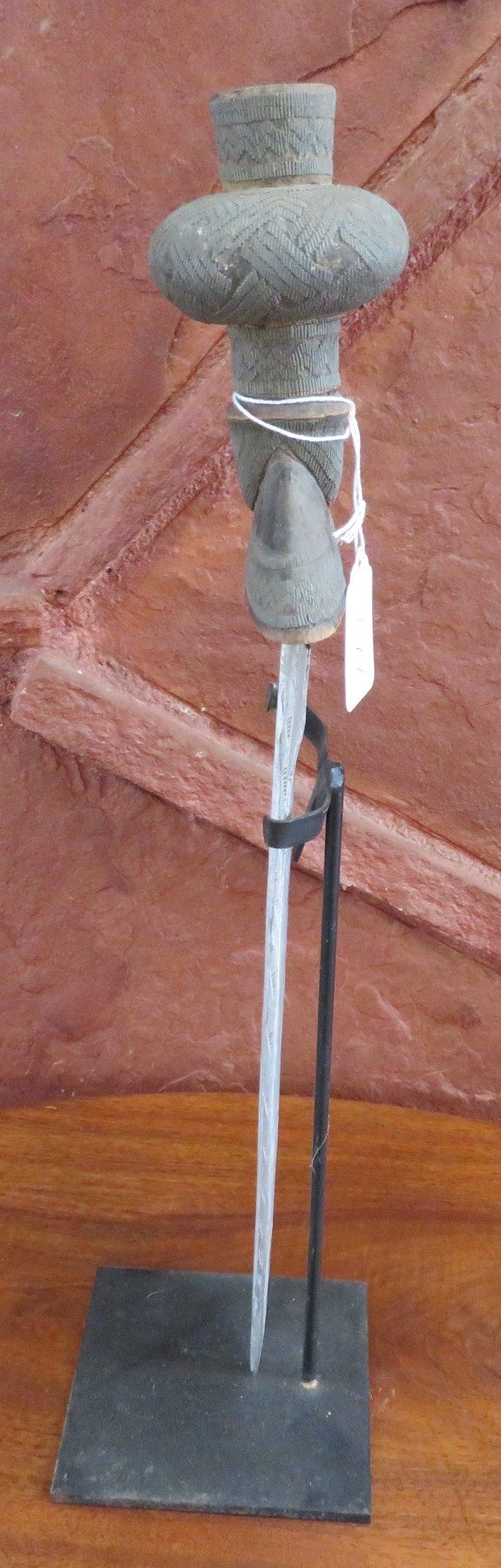 African Kuba Ikula Knife w/Stand, early 20th century item. Made of aluminum, wire, beads and wood, the item measures 16 1/2". Kuba, Congo. Condition: Good, see images. Shipping: $28.50 w/insurance and signature.