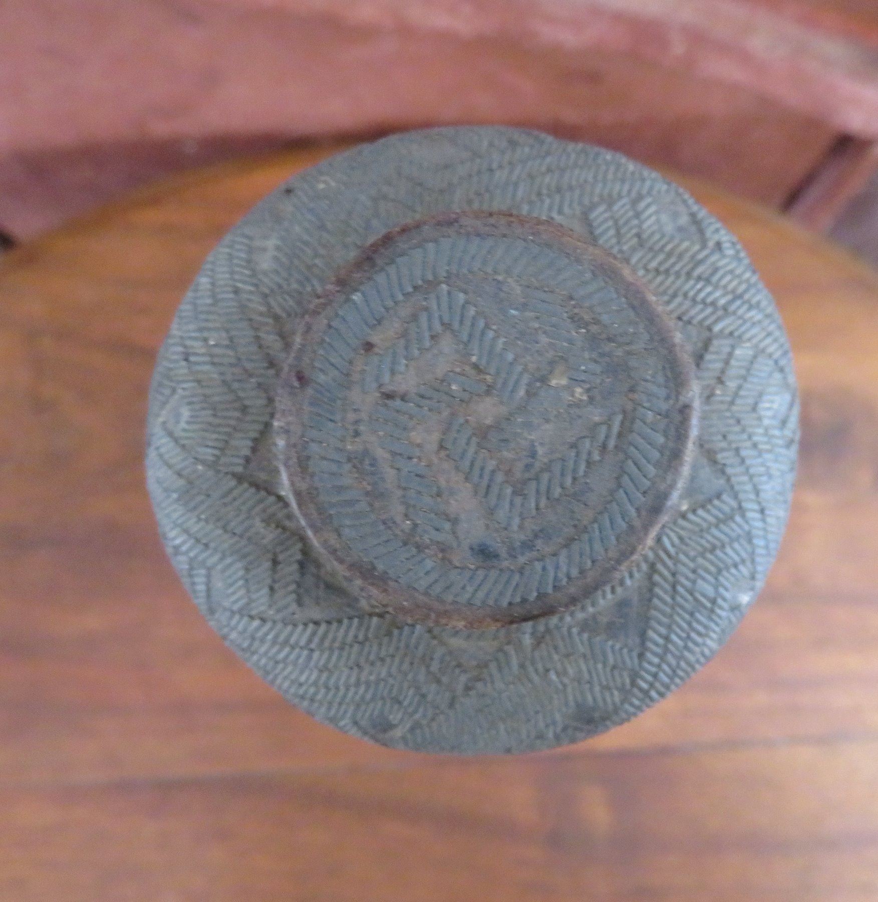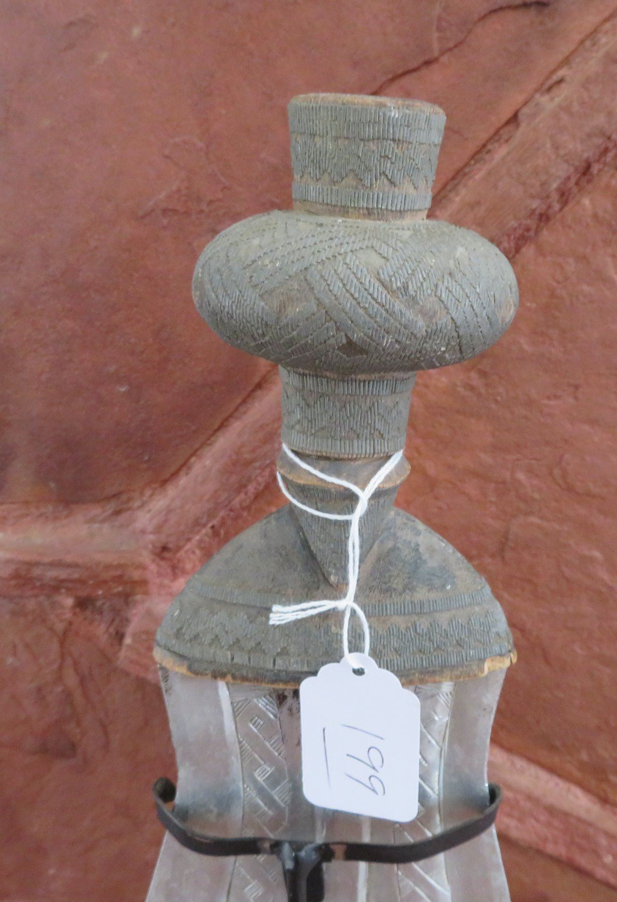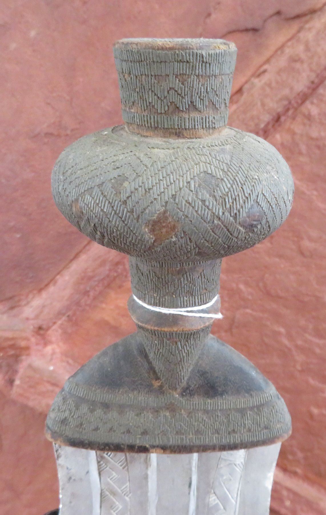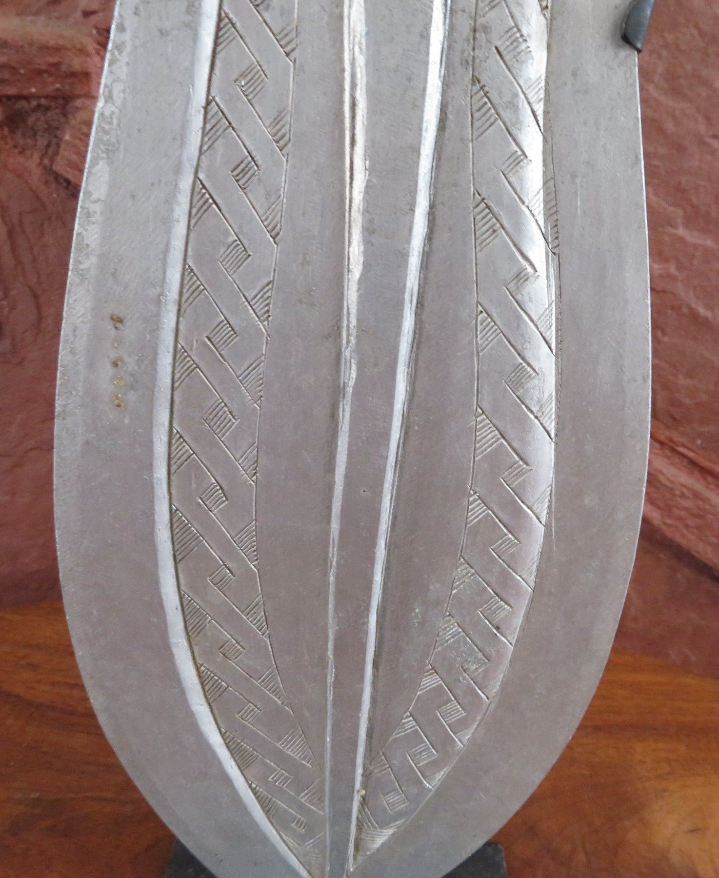African Kuba Ikula Knife w/Stand, early 20th century item. Made of aluminum, wire, beads and wood, the item measures 16 1/2". Kuba, Congo. Condition: Good, see images. Shipping: $28.50 w/insurance and signature.