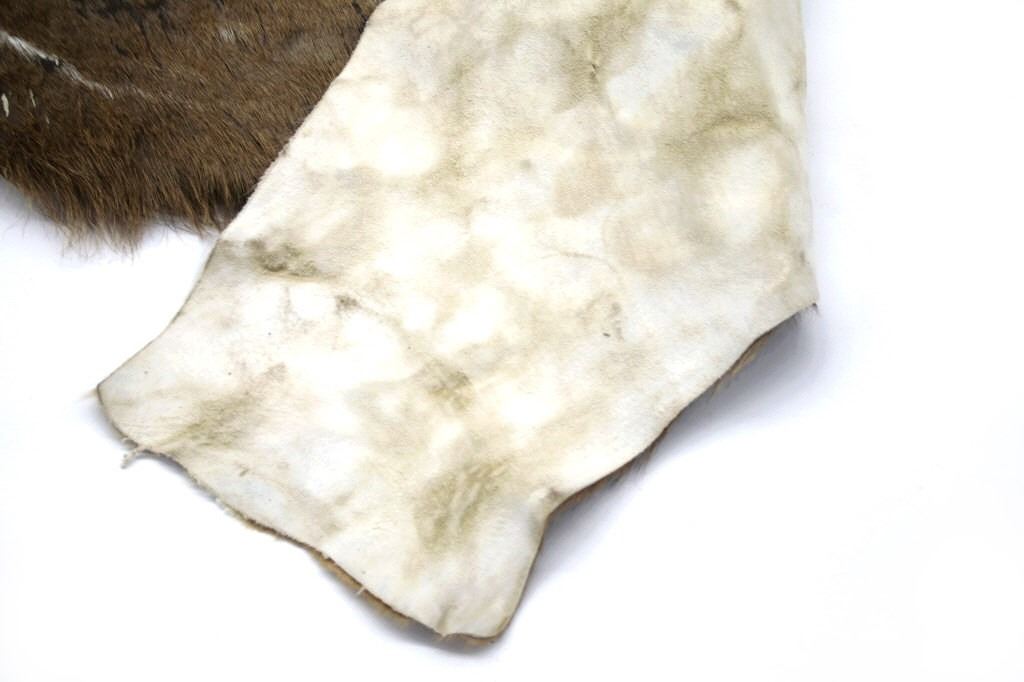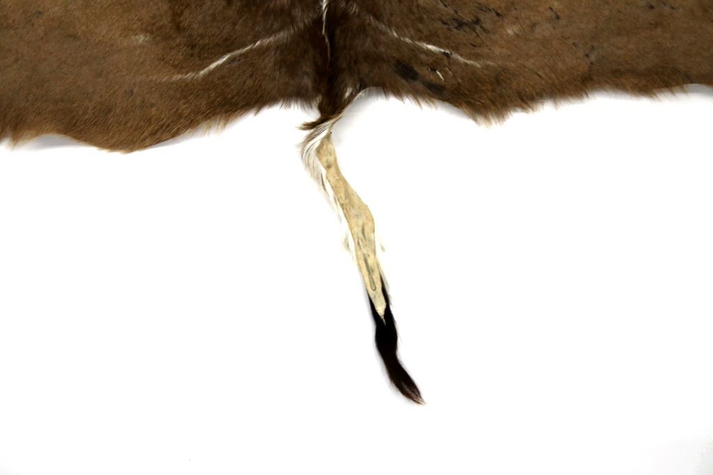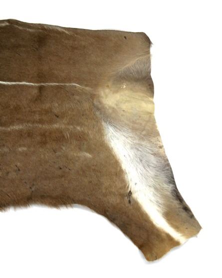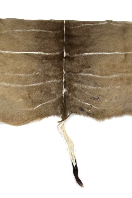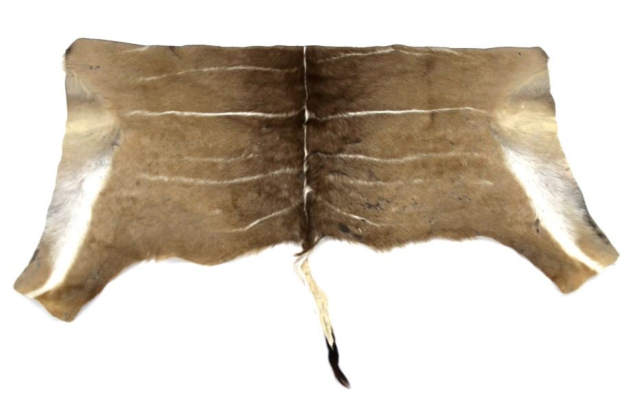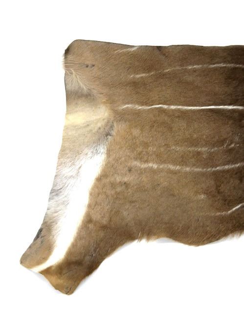 This is a half hide and shows the hind section of the Kudu. The hide features colors of white, tan and brown throughout with stripe of white going across the hide. The hide shows good condition overall with no signs of obvious damage present. The hide measures 38" L x 64" W.