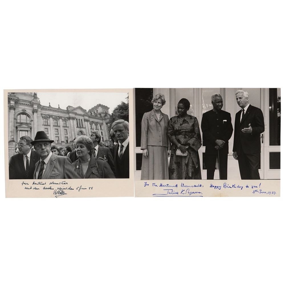 Two uncommon photos: a glossy 6.5 x 4.75 photo of South African president P. W. Botha, affixed to a 7 x 6 mount, signed and inscribed on the mount in fountain pen, and dated June 5, 1988; and a glossy 8 x 5 photo of Tanzanian president Julius Nyerere, affixed to an 8 x 6 mount, signed and inscribed on the mount in fountain pen,m and dated June 5, 1987. In very good to fine condition, with a small tear to the bottom edge of the Nyerere mount.