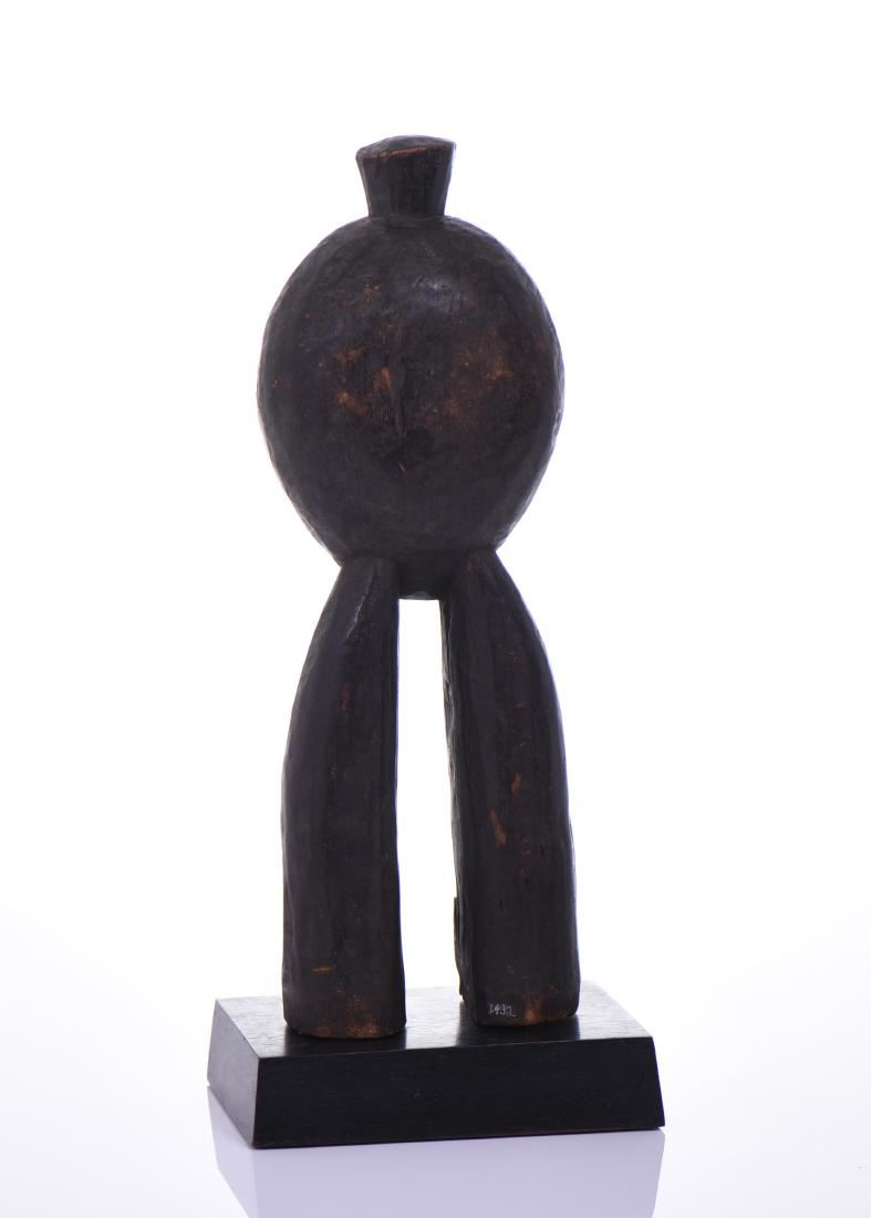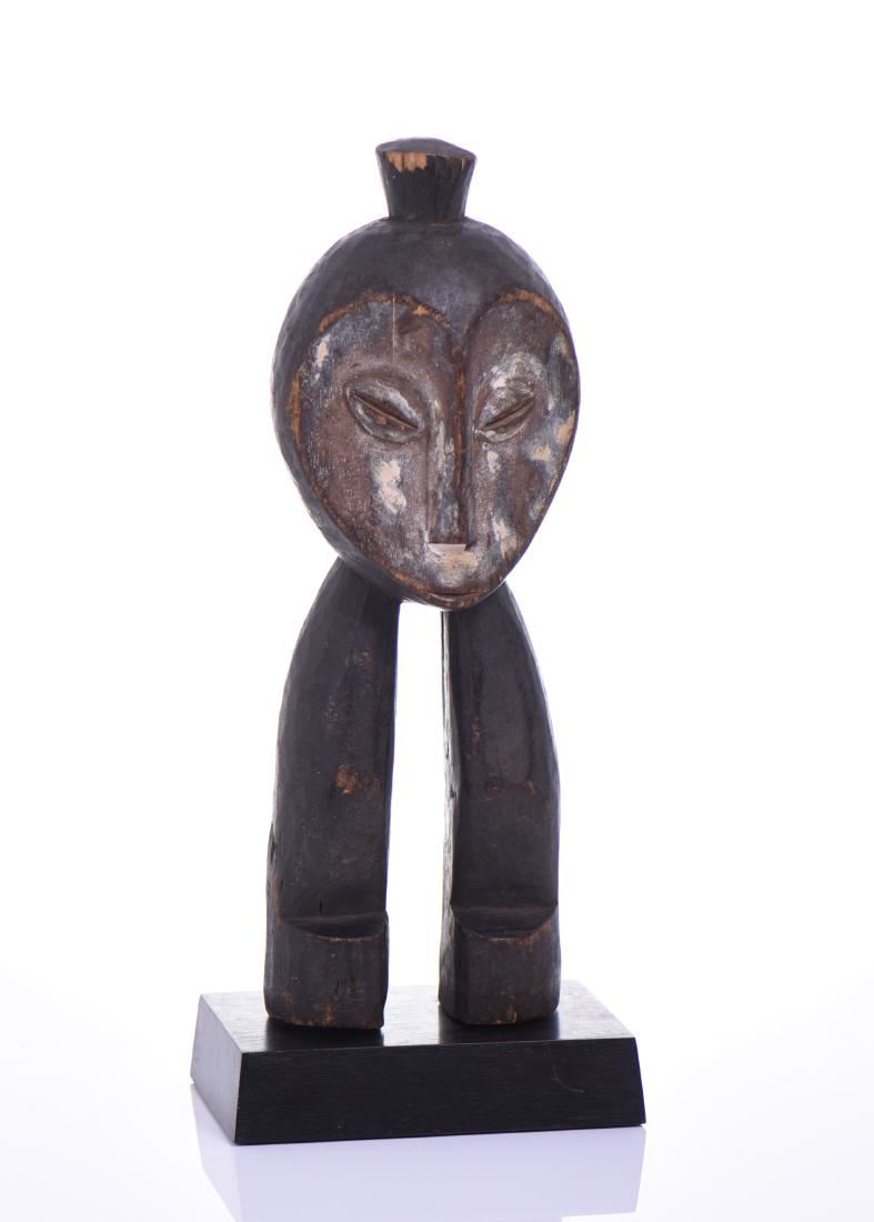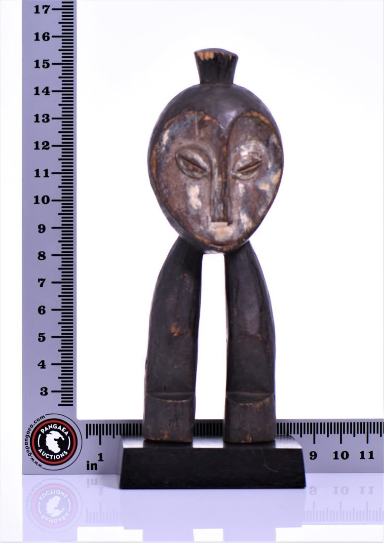 African Lega Wood Figure, Congo. Provenance: Ethnographic Tribal Museum Collection (See Auction Catalog Description). Some Lots Have Been On Exhibition And Have A Custom Made Metal Stand Specifically Designed To Fit The Work. Estimated more than 75 yrs old. African art is a term typically used for the art of Sub-Saharan Africa. A few of the most popular traditional African art was produced by the tribal people of the Fang, Dan, Baoule, Dogon, Senoufo, Makonde, Bambara, and San. Most African sculpture was historically in wood and other natural materials that have not survived from earlier than a few centuries ago; older pottery figures can be found from a number of areas. Masks are important elements in the art of many peoples, along with human figures, often highly stylized and in vast variety of styles. Sculpture is most common among "groups of settled cultivators in the areas drained by the Niger and Congo rivers. Direct images of deities are relatively infrequent, but masks in particular were made for religious ceremonies. Later West African cultures developed bronze casting for reliefs, like the Benin Bronzes, to decorate palaces and for highly naturalistic royal heads from around the Yoruba town of Ife, in terracotta as well as metal, from the 12th to 14th centuries. Akan gold weights are a form of small metal sculptures produced over the period 1400–1900; some apparently represent proverbs, contributing a narrative element rare in African sculpture; and royal regalia included impressive gold sculptured elements. Many West African figures are used in religious rituals and are often coated with materials placed on them for ceremonial offerings. Eastern Africans, in many areas shorter of large timber to carve, are known for Tinga Tinga paintings and Makonde sculptures. There is also tradition of producing textile art. Modern Zimbabwean sculptors in soapstone have achieved considerable international success. Southern Africa's oldest known clay figures date from 400 to 600 AD and have cylindrical heads with a mixture of human and animal features. (Wikipedia) Size and/or Weight: See Measurement Photo. (Photos Represent The Lot Condition.)