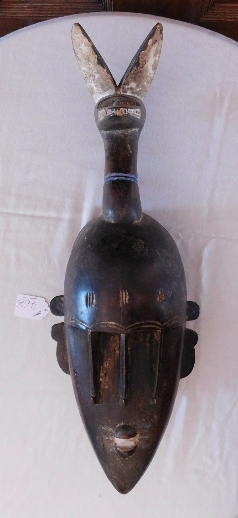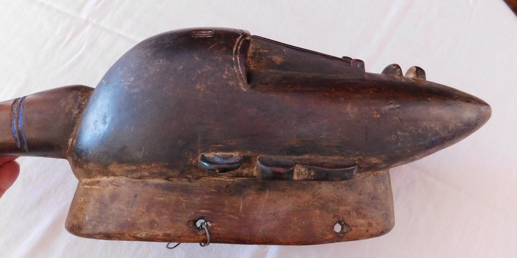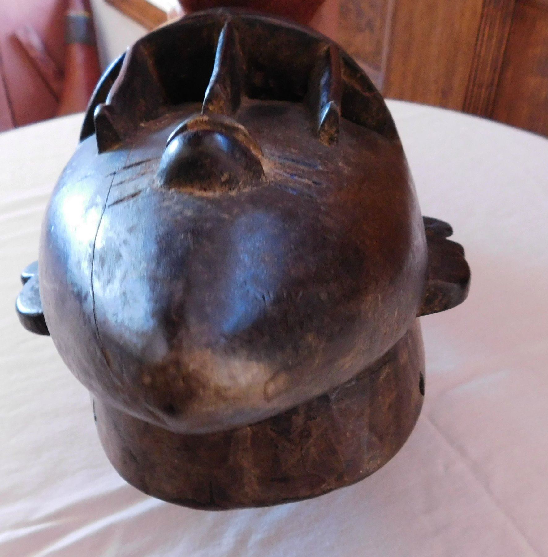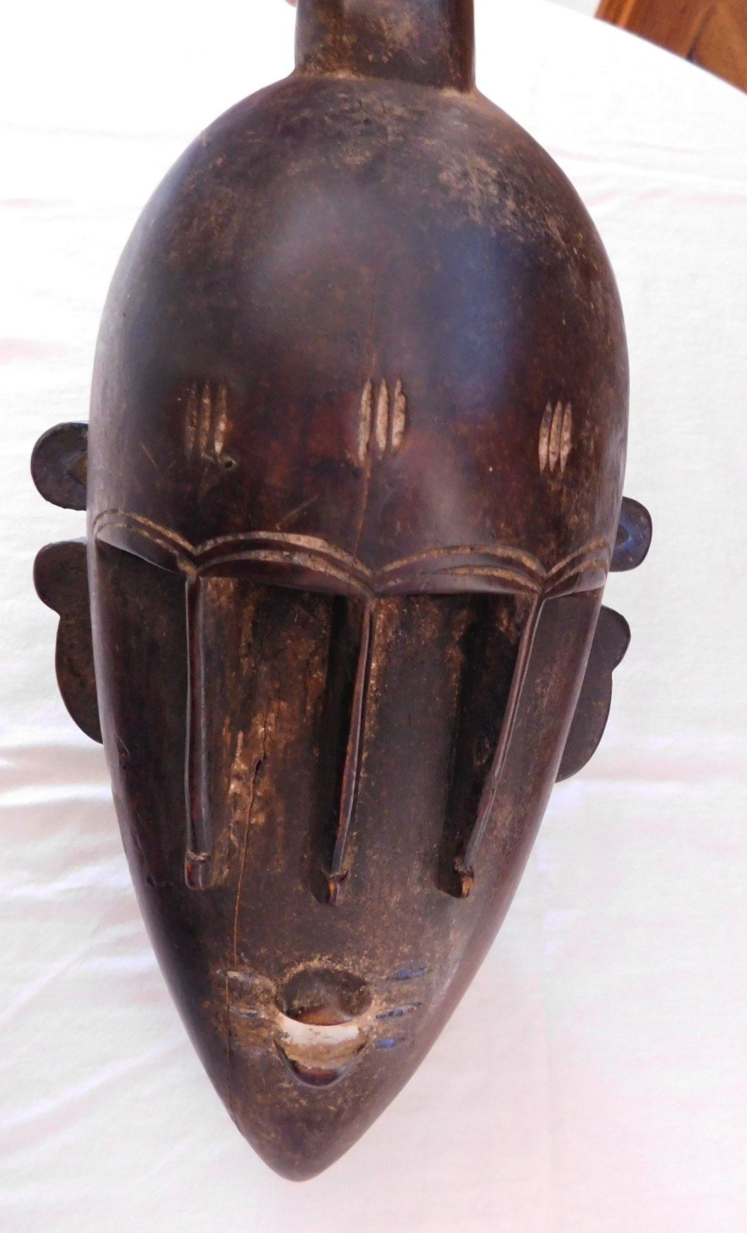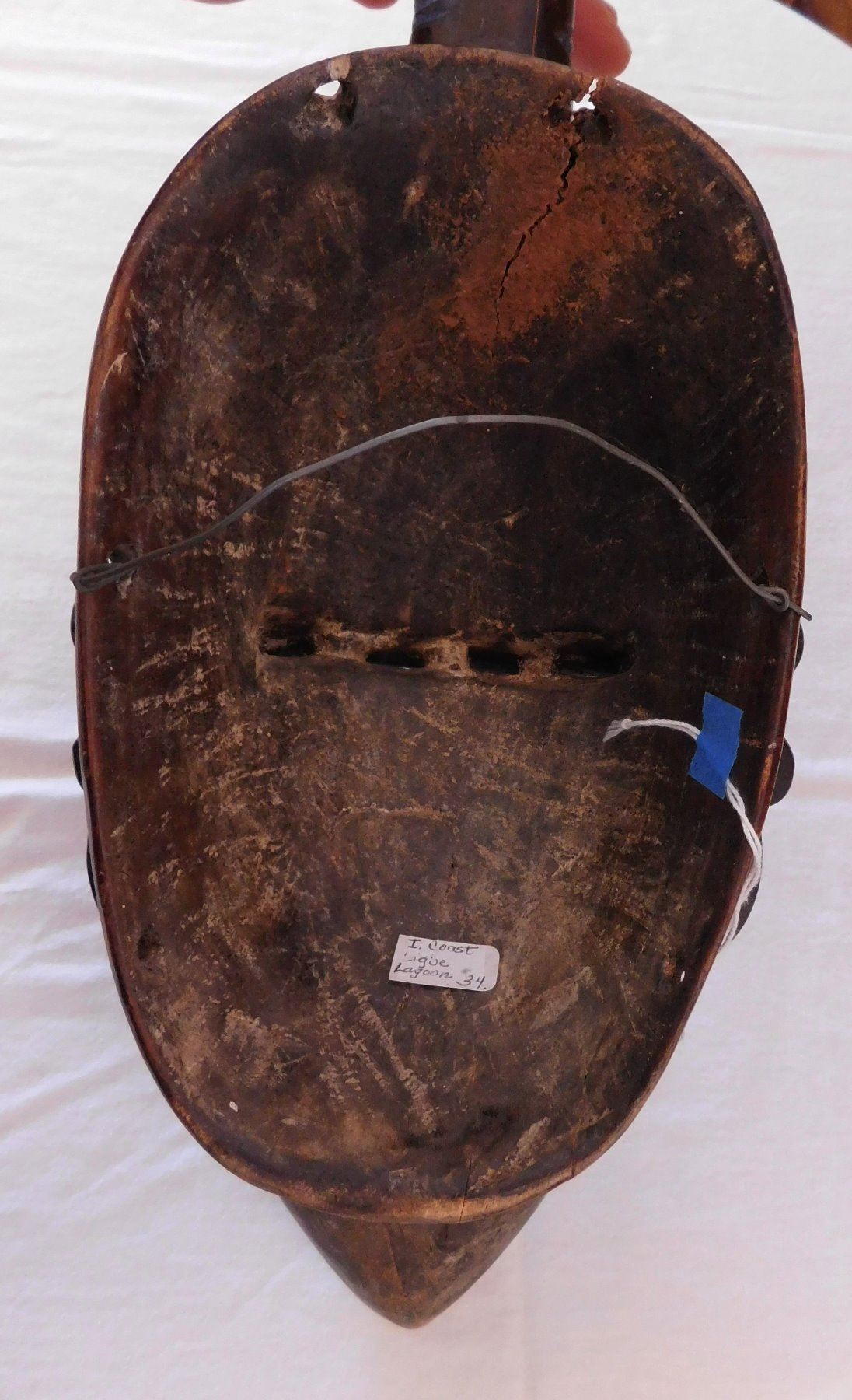 African Ligbe Lagoon Mask, early 20th century. Made of hardwood and paint, the item measures 19.5" x 6.5" x 5". Ivory Coast. 3-face Ligbe mask w/wild dog effigy on top. 4 eye holes and interesting ears. Condition: Good, some wear, see images. Shipping: $35.00 w/insurance and signature, due to length.