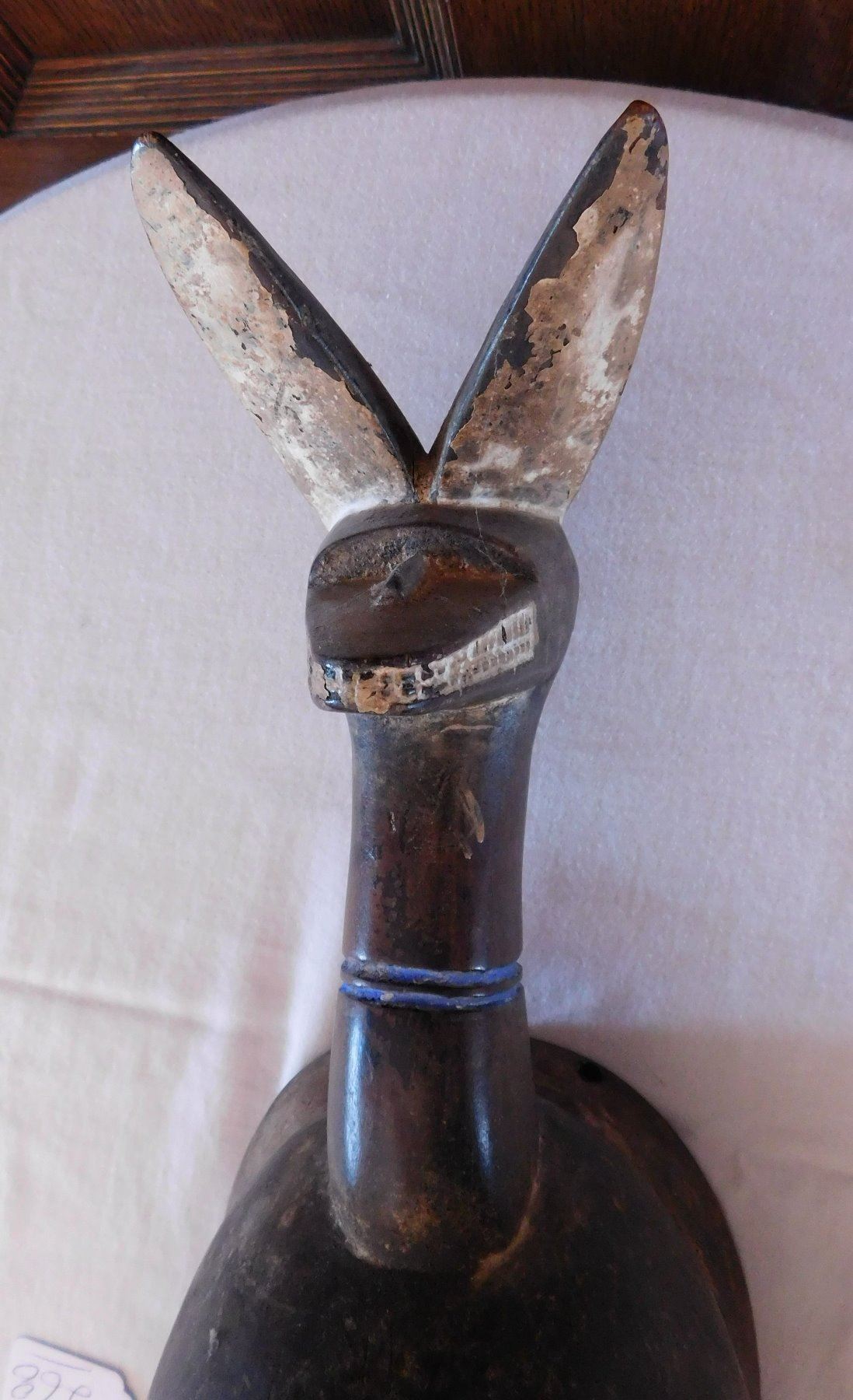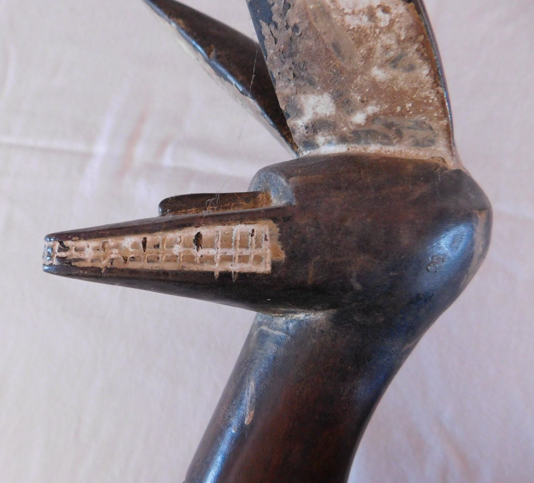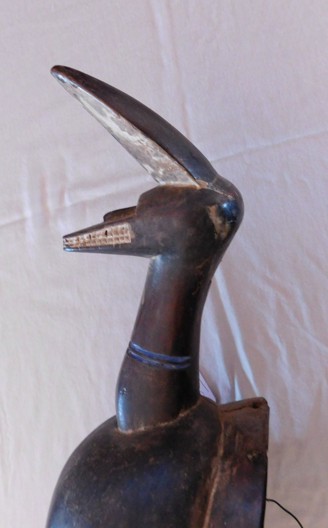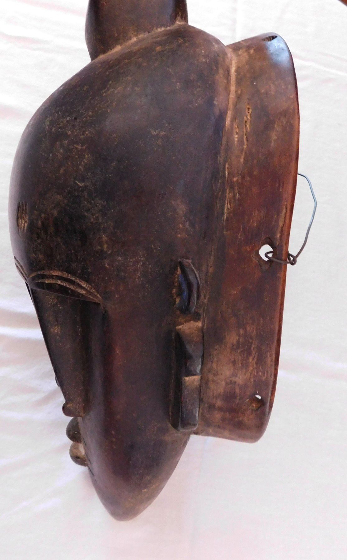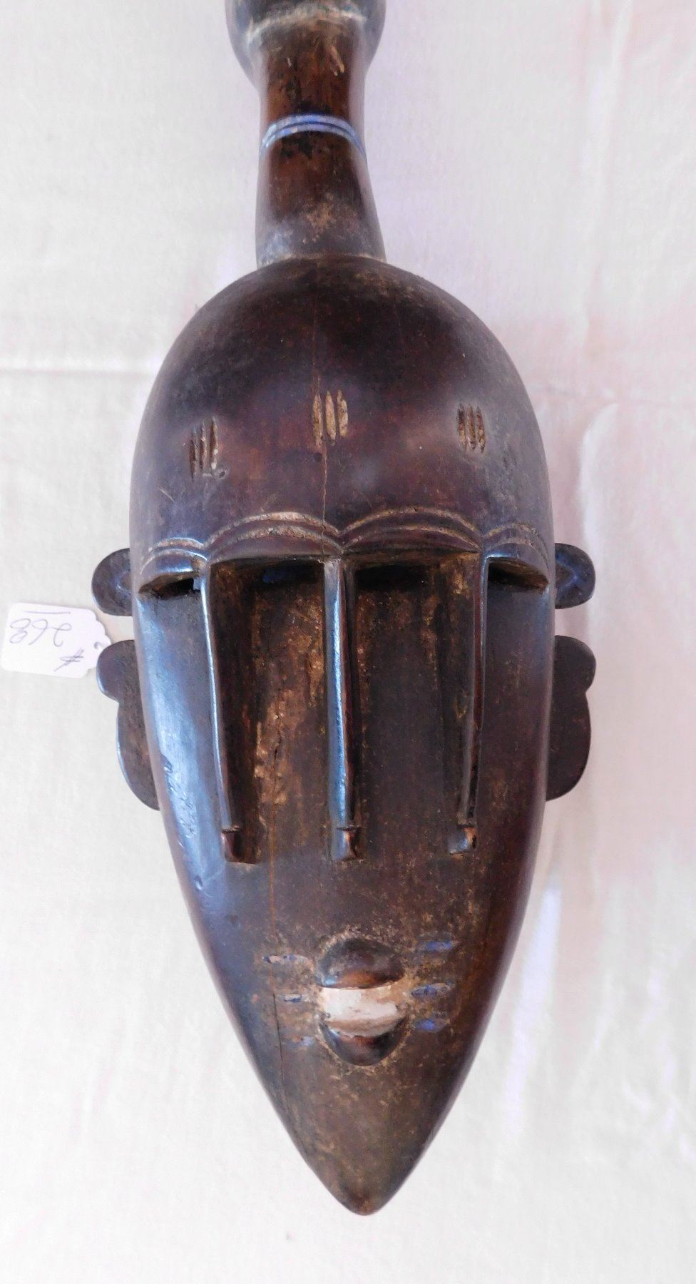 African Ligbe Lagoon Mask, early 20th century. Made of hardwood and paint, the item measures 19.5" x 6.5" x 5". Ivory Coast. 3-face Ligbe mask w/wild dog effigy on top. 4 eye holes and interesting ears. Condition: Good, some wear, see images. Shipping: $35.00 w/insurance and signature, due to length.