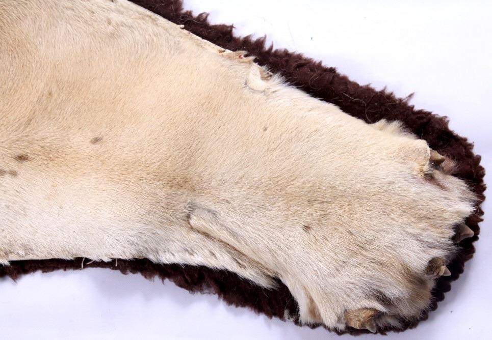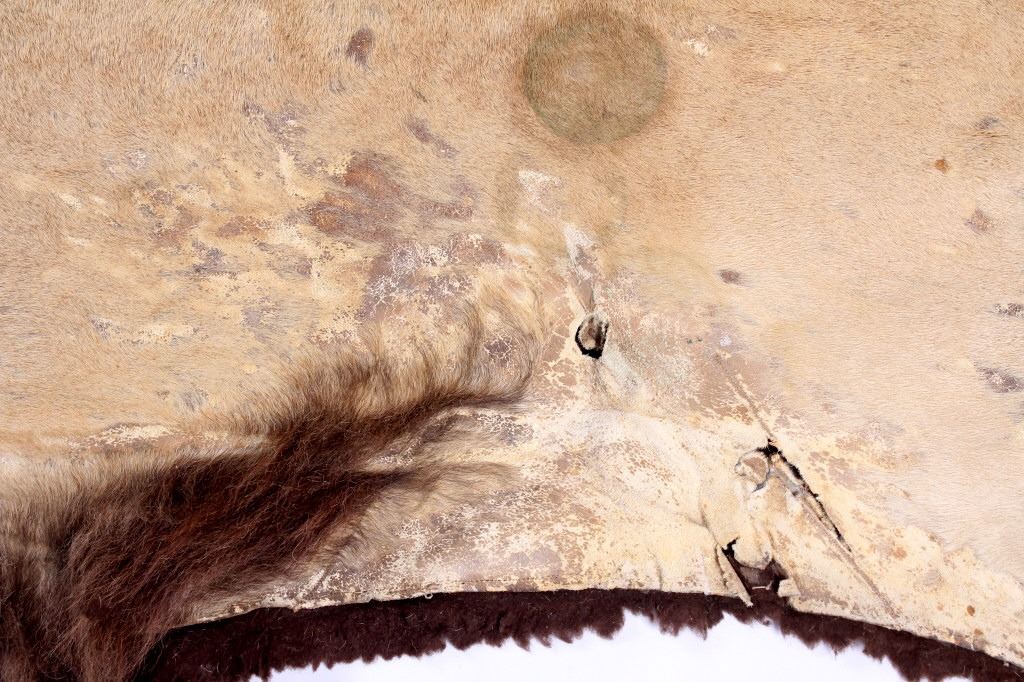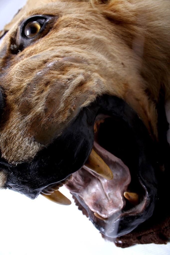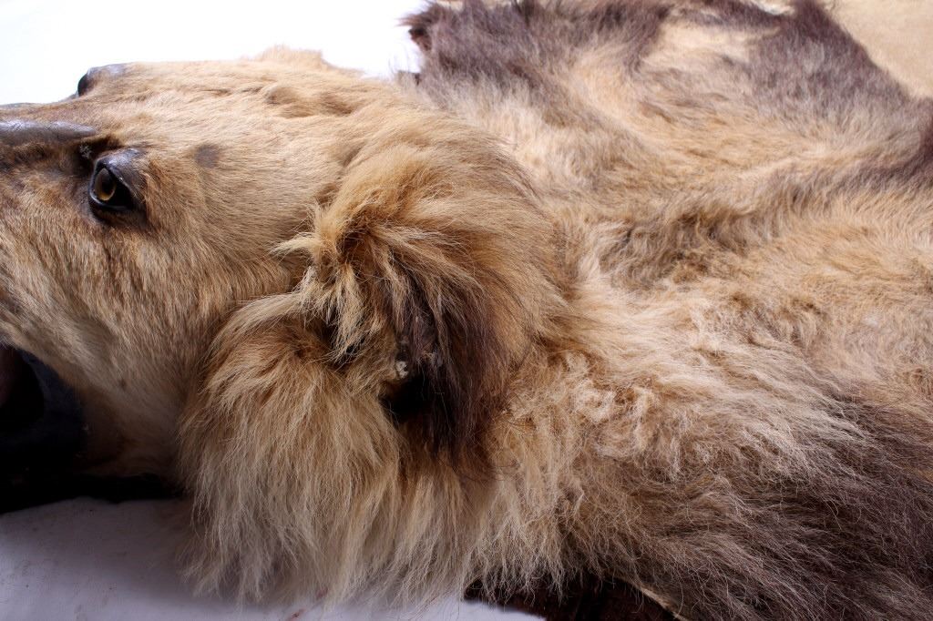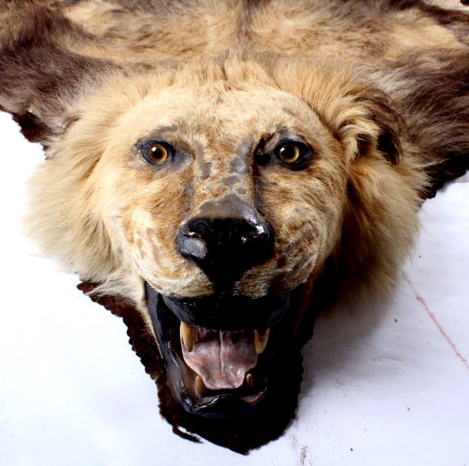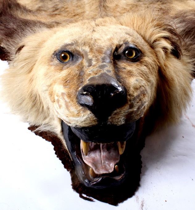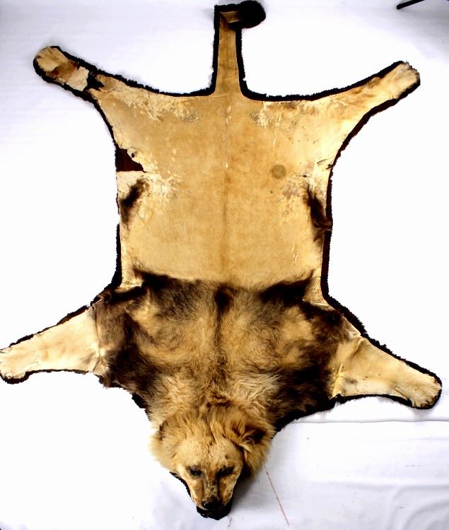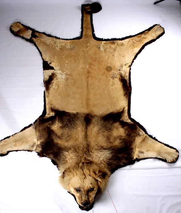 For your consideration is this African Lion taxidermy trophy rug. The full mount is double felted and has a canvass-like backing. It is believed this mount dates to about mid-century, as it has considerable wear. The full head is intact, however the claws are gone and the rug has some fur loss around the edges. The rug measures about