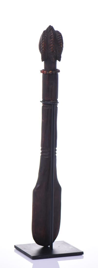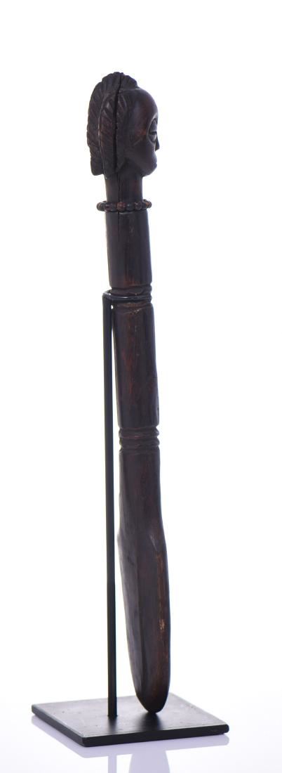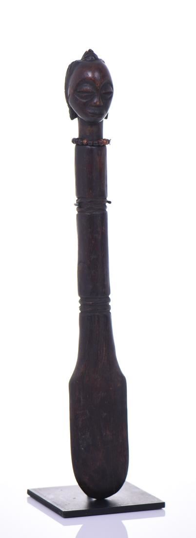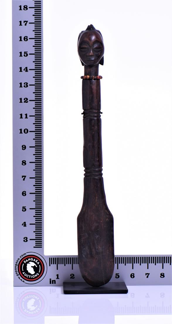 African Luba Spoon, Democratic Republic of the Congo. The Kingdom of "Luba" or Luba Empire (1585-1889) was a pre-colonial Central African state that arose in the marshy grasslands of the Upemba Depression in what is now southern Democratic Republic of Congo. Provenance: Ethnographic Tribal Museum Collection (See Auction Catalog Description). Some Lots Have Been On Exhibition And Have A Custom Made Metal Stand Specifically Designed To Fit The Work. Estimated more than 75 yrs old. African art is a term typically used for the art of Sub-Saharan Africa. A few of the most popular traditional African art was produced by the tribal people of the Fang, Dan, Baoule, Dogon, Senoufo, Makonde, Bambara, and San. Most African sculpture was historically in wood and other natural materials that have not survived from earlier than a few centuries ago; older pottery figures can be found from a number of areas. Masks are important elements in the art of many peoples, along with human figures, often highly stylized and in vast variety of styles. Sculpture is most common among "groups of settled cultivators in the areas drained by the Niger and Congo rivers. Direct images of deities are relatively infrequent, but masks in particular were made for religious ceremonies. Later West African cultures developed bronze casting for reliefs, like the Benin Bronzes, to decorate palaces and for highly naturalistic royal heads from around the Yoruba town of Ife, in terracotta as well as metal, from the 12th to 14th centuries. Akan gold weights are a form of small metal sculptures produced over the period 1400–1900; some apparently represent proverbs, contributing a narrative element rare in African sculpture; and royal regalia included impressive gold sculptured elements. Many West African figures are used in religious rituals and are often coated with materials placed on them for ceremonial offerings. Eastern Africans, in many areas shorter of large timber to carve, are known for Tinga Tinga paintings and Makonde sculptures. There is also tradition of producing textile art. Modern Zimbabwean sculptors in soapstone have achieved considerable international success. Southern Africa's oldest known clay figures date from 400 to 600 AD and have cylindrical heads with a mixture of human and animal features. (Wikipedia) Size and/or Weight: See Measurement Photo. (Photos Represent The Lot Condition.)