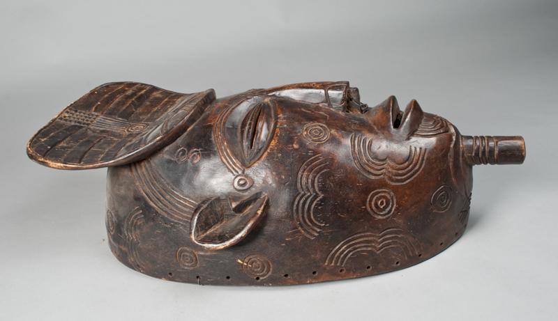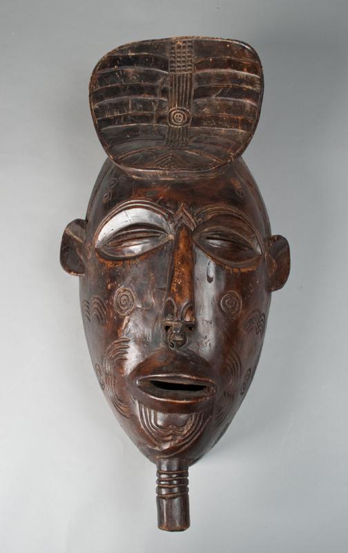 Large mask finely carved depicting a face with septum nose rin, fan form headress, and various scarification. The Luba are one of the Bantu peoples of Central Africa. They are indigenous to the Katanga, Kasai, and Maniema regions which were historic provinces of present-day Democratic Republic of the Congo. They speak the Luba-Kasai, Luba-Katanga, and Swahili languages. 29" H x 14.75" W, minor wear consistent with age. Early 20th century.