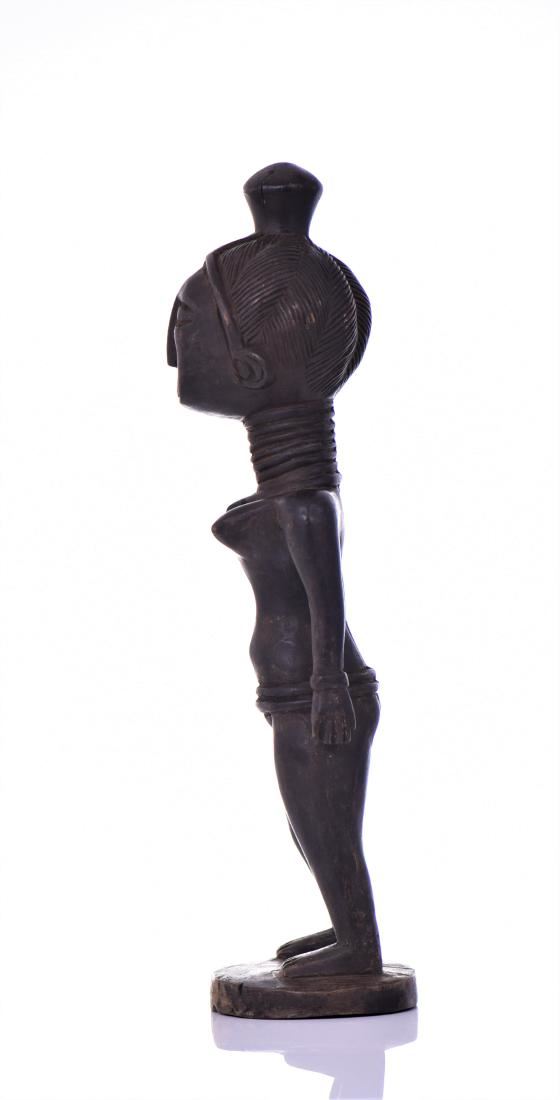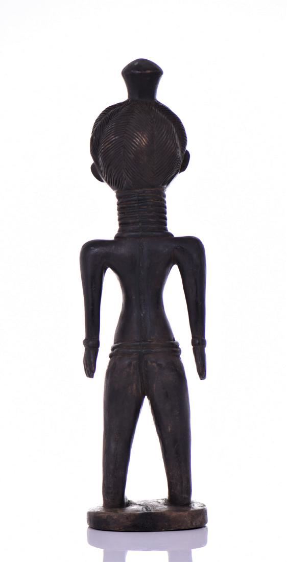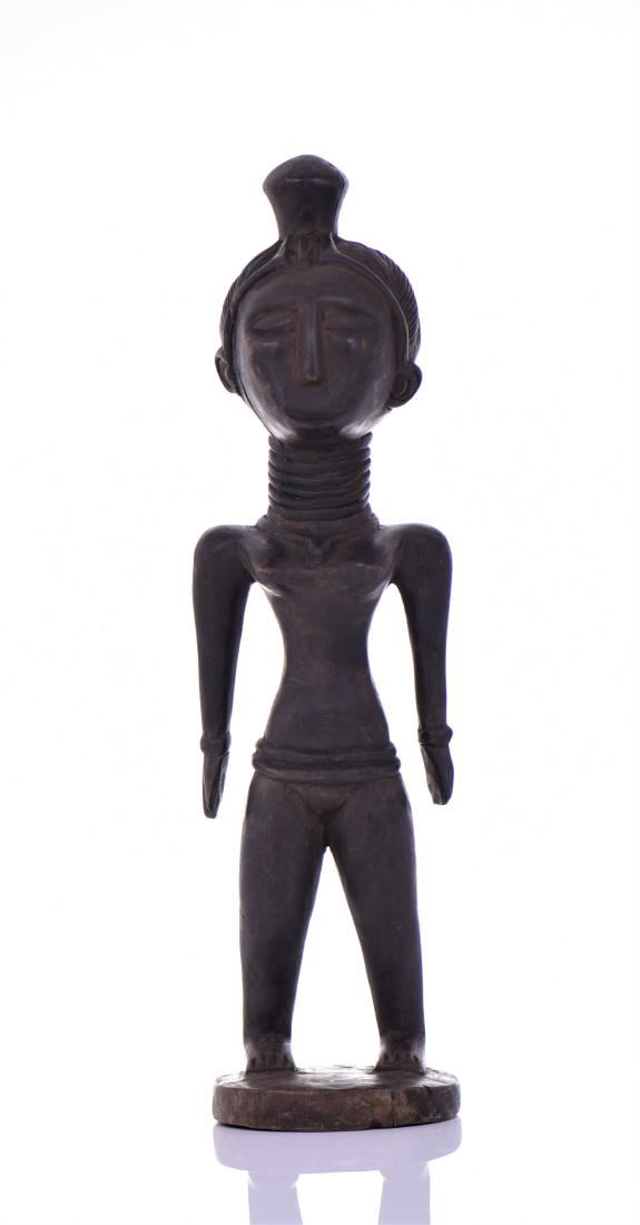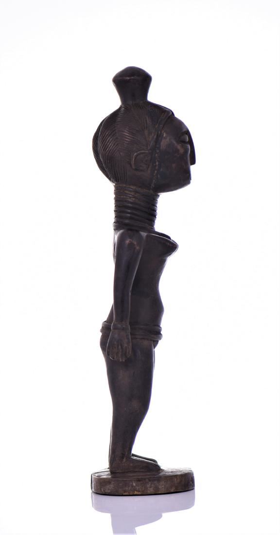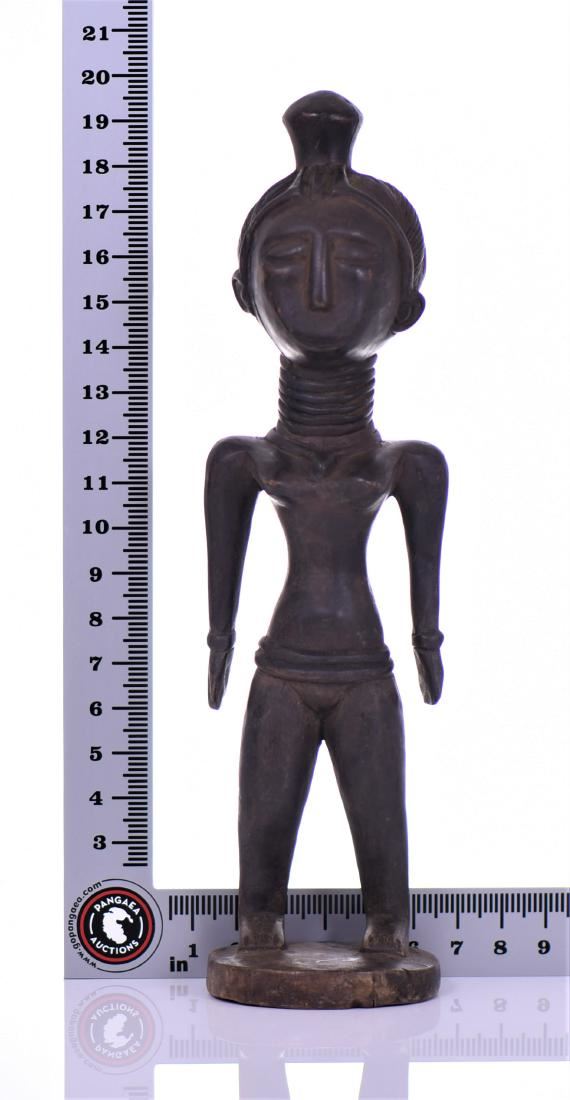 African Luba Wood Power Figure. The Kingdom of "Luba" or Luba Empire (1585-1889) was a pre-colonial Central African state that arose in the marshy grasslands of the Upemba Depression in what is now southern Democratic Republic of Congo. Provenance: Ethnographic Tribal Museum Collection (See Auction Catalog Description). Some Lots Have Been On Exhibition And Have A Custom Made Metal Stand Specifically Designed To Fit The Work. Estimated more than 50 yrs old. African art is a term typically used for the art of Sub-Saharan Africa. A few of the most popular traditional African art was produced by the tribal people of the Fang, Dan, Baoule, Dogon, Senoufo, Makonde, Bambara, and San. Most African sculpture was historically in wood and other natural materials that have not survived from earlier than a few centuries ago; older pottery figures can be found from a number of areas. Masks are important elements in the art of many peoples, along with human figures, often highly stylized and in vast variety of styles. Sculpture is most common among "groups of settled cultivators in the areas drained by the Niger and Congo rivers. Direct images of deities are relatively infrequent, but masks in particular were made for religious ceremonies. Later West African cultures developed bronze casting for reliefs, like the Benin Bronzes, to decorate palaces and for highly naturalistic royal heads from around the Yoruba town of Ife, in terracotta as well as metal, from the 12th to 14th centuries. Akan gold weights are a form of small metal sculptures produced over the period 1400–1900; some apparently represent proverbs, contributing a narrative element rare in African sculpture; and royal regalia included impressive gold sculptured elements. Many West African figures are used in religious rituals and are often coated with materials placed on them for ceremonial offerings. Eastern Africans, in many areas shorter of large timber to carve, are known for Tinga Tinga paintings and Makonde sculptures. There is also tradition of producing textile art. Modern Zimbabwean sculptors in soapstone have achieved considerable international success. Southern Africa's oldest known clay figures date from 400 to 600 AD and have cylindrical heads with a mixture of human and animal features. (Wikipedia) Size and/or Weight: See Measurement Photo. (Photos Represent The Lot Condition.)