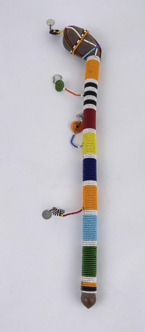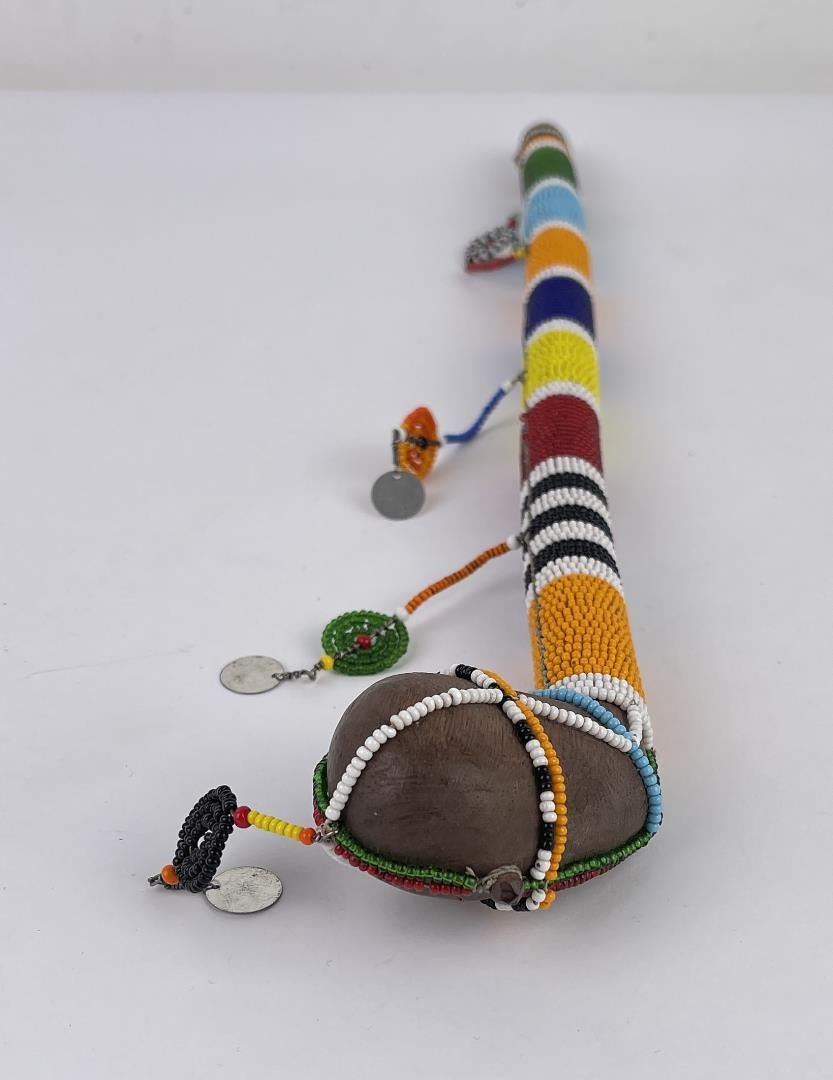 16" long. In Maasai culture, the rungu is an important emblem of warrior status for young males. A special one is held by the designated speaker at important tribal gatherings. Although utilitarian examples are made of simple hard wood, ceremonial rungus may be elaborately carved or made of other materials. Local women are widely employed in sewing decorative beads onto the handles of those made for the tourist trade.