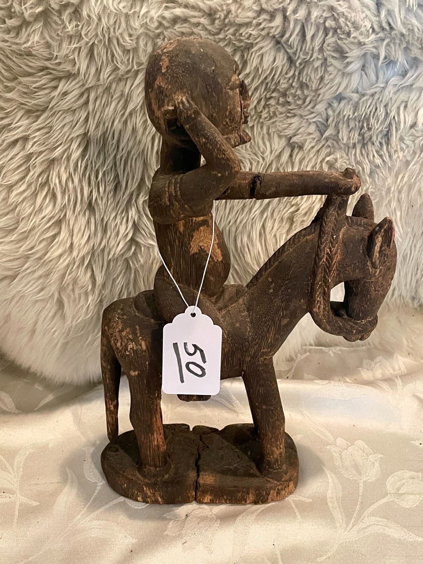 An African sculpture of a man on a horse offered in the auction is a stunning work of art, expertly crafted with intricate details that capture the dynamic movement and cultural significance of the figures.