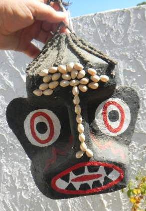 African Mask with corn row hair and cowrie shells decoration and made from some unknown fiber not wood although rigid. Measures 11x10x4 inches. The black, white and red paint on face is quite vivid. Very unique and have never seen anything similar Good Condition Shipping $18.00