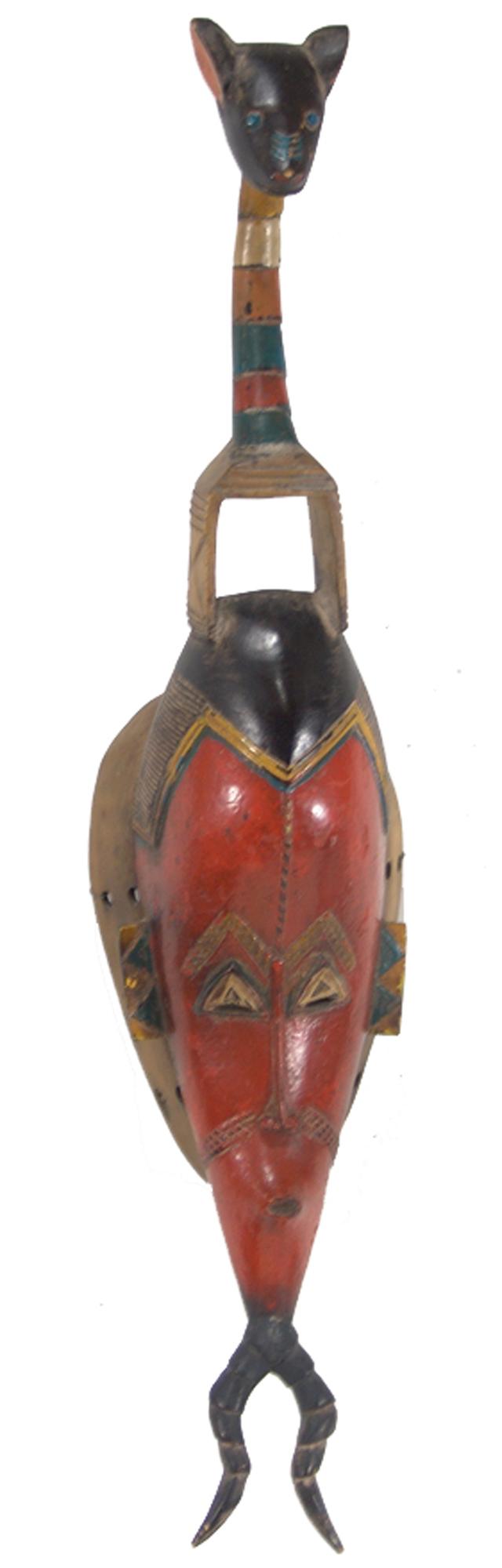 Early 1900s, Beautiful hand carved dance mask, the headdress an animal figure, the face painted in orange. 29-1/2" x 7"