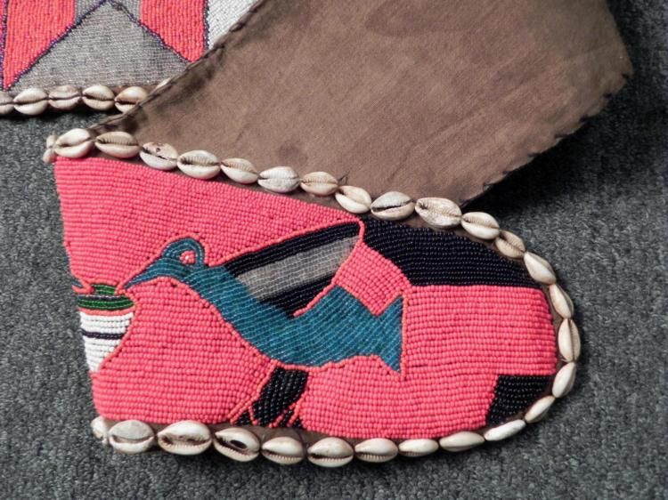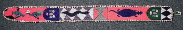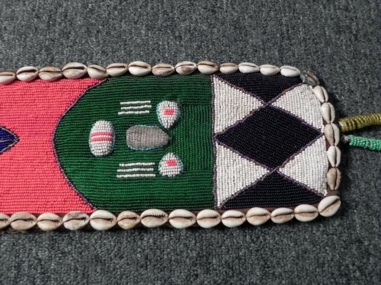 This wall hanging tapestry piece from Africa features colorful mask faces, bird, snake and lizard. The designs are all beaded, and the edges are lined with puka shells. The backing is linen, or some type of natural material. The overall size is about 5 1/2" x 62", including the hanging tab at the top. The condition is excellent. * Bring a vibrant, tribal look to your home with this impressive beaded tapestry.
