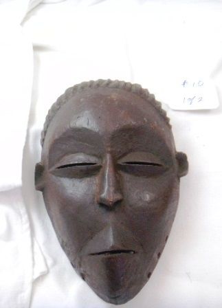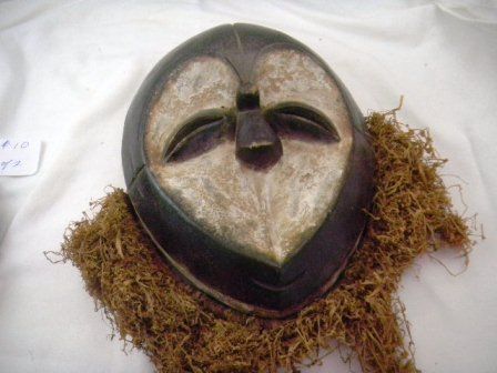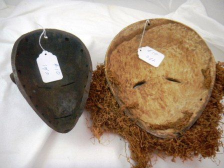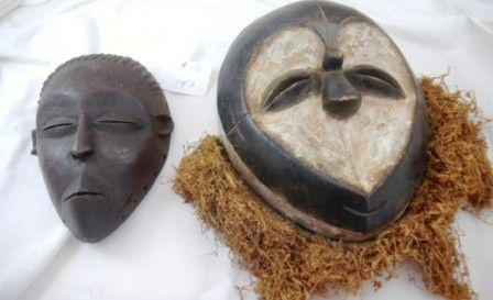 Two Lega African Masks. Larger one has a raffia beard measures 10 by 12 inches the other mask is 9 by 12 inches. Shipping $16.00