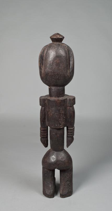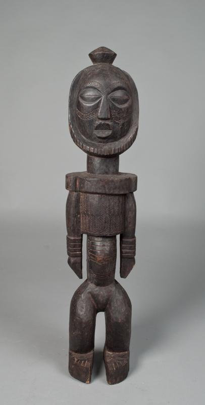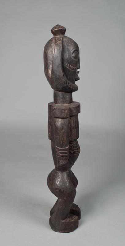 Finely carved figure with beard, arm bands and scarification to face and stomach. The Membas follow Nyingmapa Tibetan Buddhism and have their own script, Hikor, which is derived from the Tibetan script.[3] In every village, there is a small Gompa presided by a Buddhist Lama. As devout Buddhists, they follow all the intricate details of rituals of Buddhist puja, hoisting at least a Buddhist prayer flag or a string of small Buddhist prayer flags in front of every household. Festivals that are celebrated by the Memba include Losar and Choskar. 29.25" H, nicks and abrasions consistent with age. Mid. 20th century.