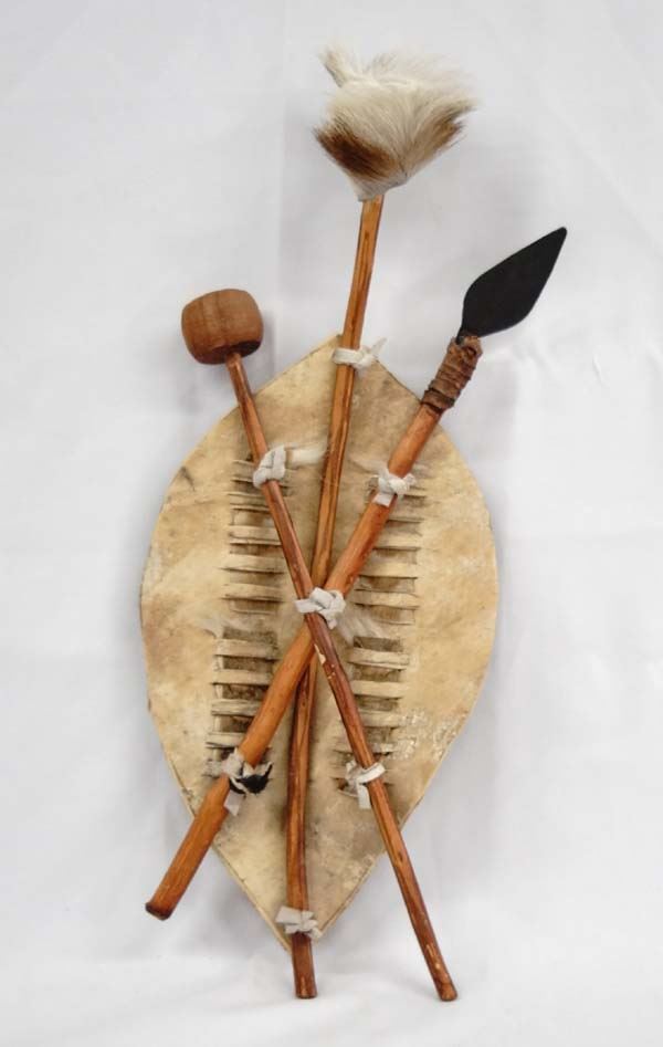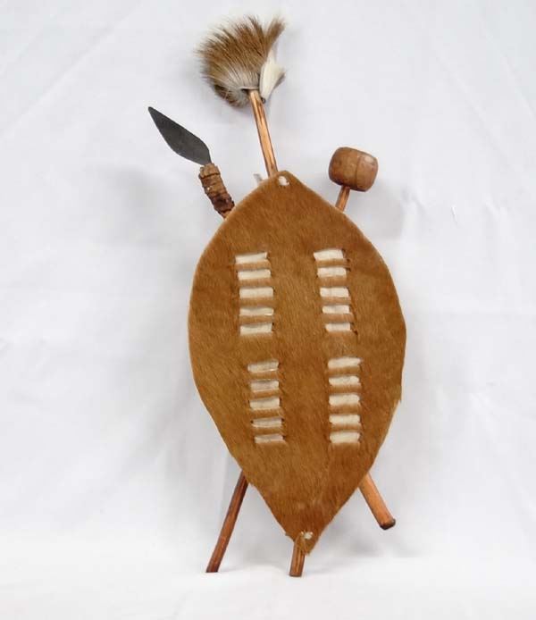 African Miniature Cow's Hide War Shield. Decorated with deer hide this piece measures approx. 19'' x 8''.