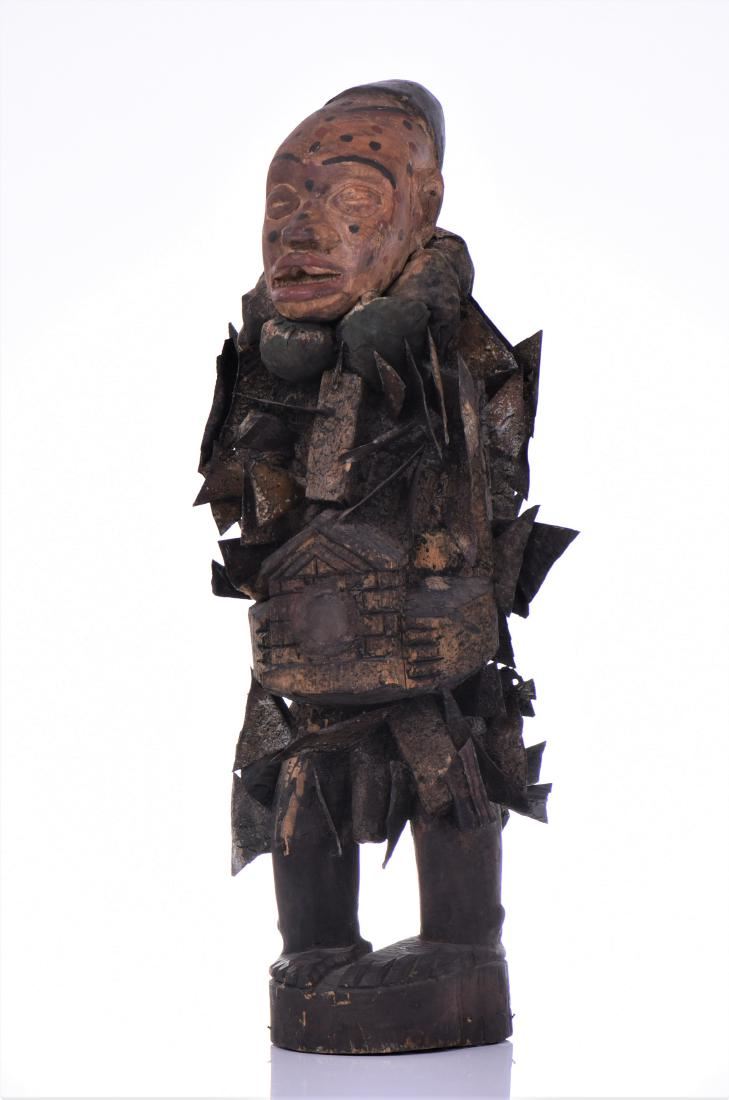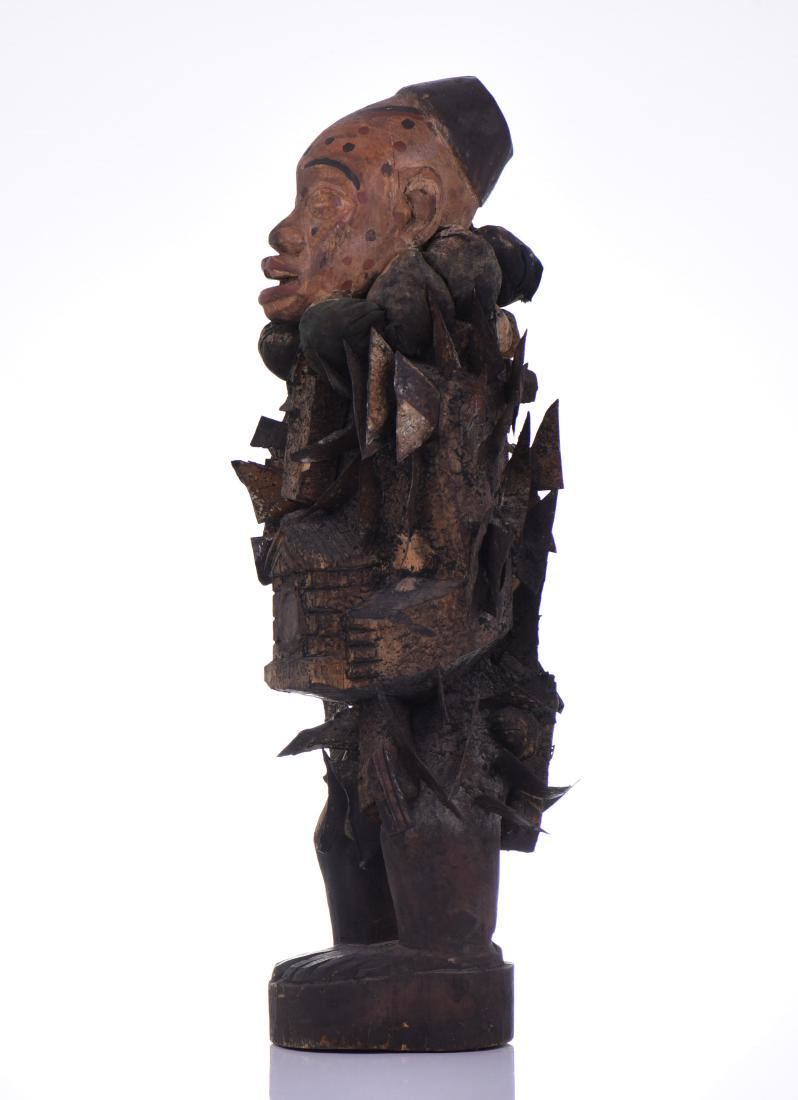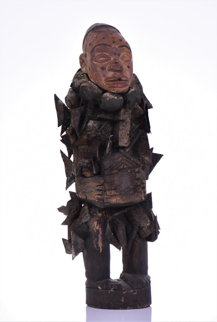 African Nkondi Nail Fetish Power figure, Congo. These religious objects, frequently called nail fetish because users often hammered nails into them, made by the Kongo people of West Central Africa. Nkondi are a subclass of minkisi that are considered aggressive. The name nkondi derives from the verb -konda, meaning to hunt and thus nkondi means hunter because they can hunt down and attack wrong-doers or witches, or in some cases, also enemies. Fetishes were protective figures used by individuals, families, or whole communities to destroy or weaken