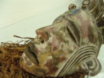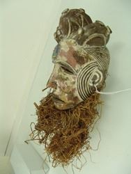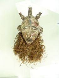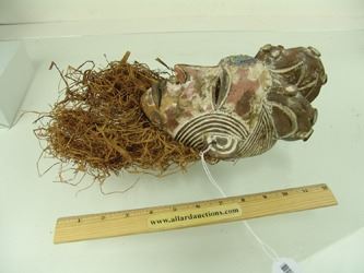 Heavy, colorful, hand formed pottery display mask with narrowed eyes and heavy brows, incised ears, triple headdress, raffia beard, and small shield of beads on the forehead. Good condition, some paint loss, scuffs, etc. Early 1900s. 10" x 7"