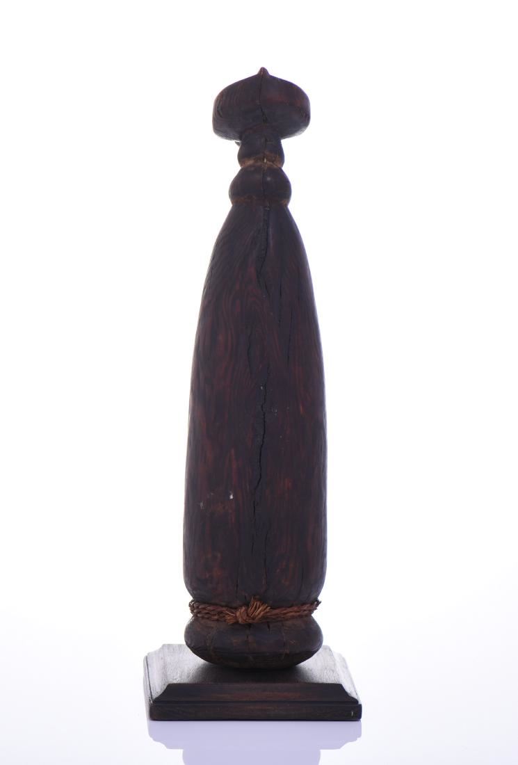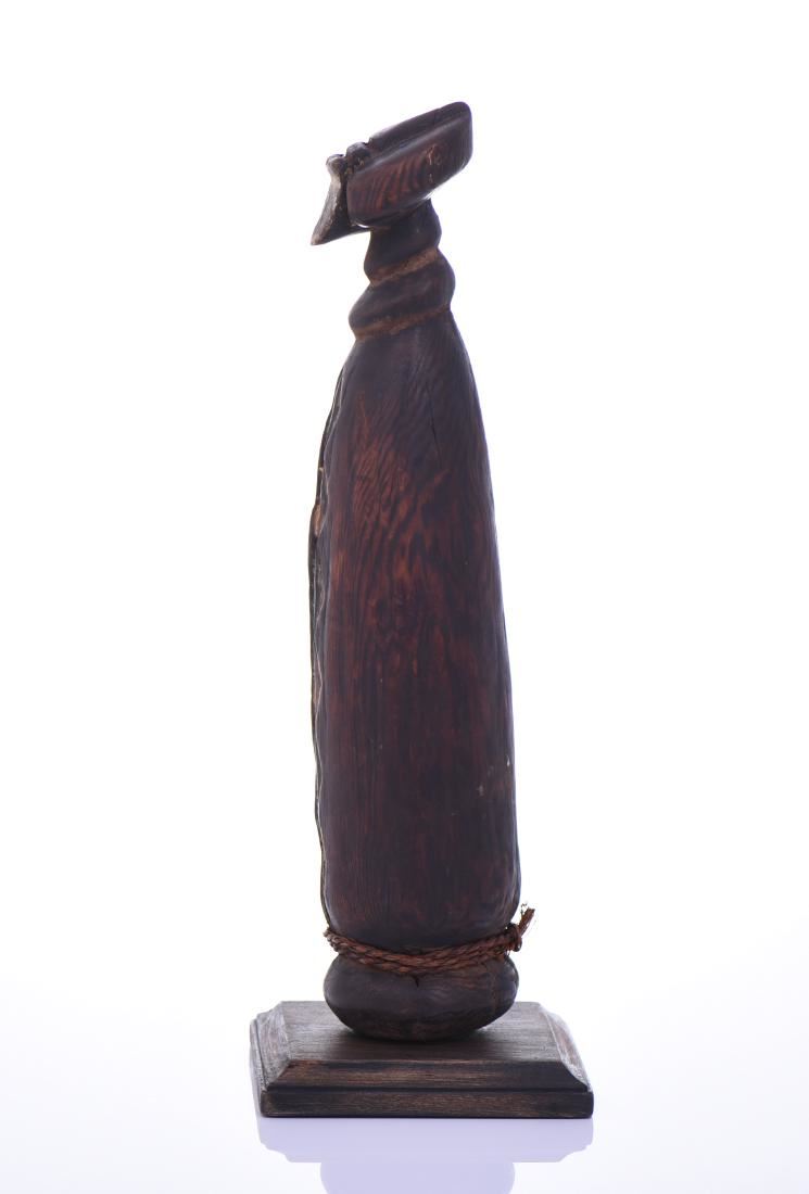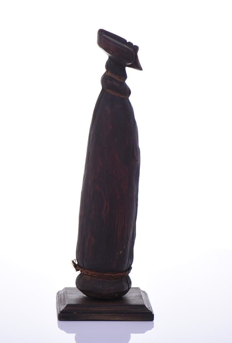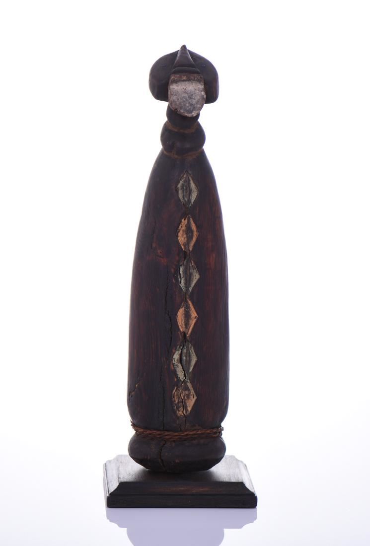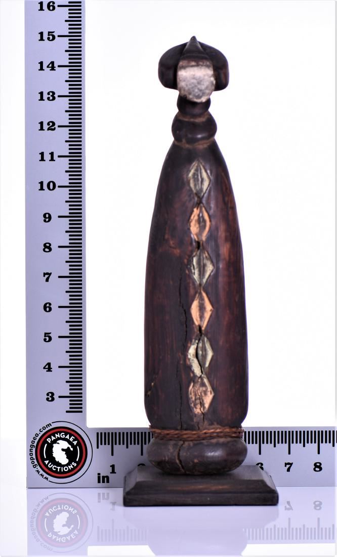 African Power Figure Wood Figure Facing The Sky With Pigment Paint And Blue Beaded Eyes, Cameroon. Provenance: Ethnographic Tribal Museum Collection (See Auction Catalog Description). Some Lots Have Been On Exhibition And Have A Custom Made Metal Stand Specifically Designed To Fit The Work. Estimated more than 50 yrs old. African art is a term typically used for the art of Sub-Saharan Africa. A few of the most popular traditional African art was produced by the tribal people of the Fang, Dan, Baoule, Dogon, Senoufo, Makonde, Bambara, and San. Most African sculpture was historically in wood and other natural materials that have not survived from earlier than a few centuries ago; older pottery figures can be found from a number of areas. Masks are important elements in the art of many peoples, along with human figures, often highly stylized and in vast variety of styles. Sculpture is most common among "groups of settled cultivators in the areas drained by the Niger and Congo rivers. Direct images of deities are relatively infrequent, but masks in particular were made for religious ceremonies. Later West African cultures developed bronze casting for reliefs, like the Benin Bronzes, to decorate palaces and for highly naturalistic royal heads from around the Yoruba town of Ife, in terracotta as well as metal, from the 12th to 14th centuries. Akan gold weights are a form of small metal sculptures produced over the period 1400–1900; some apparently represent proverbs, contributing a narrative element rare in African sculpture; and royal regalia included impressive gold sculptured elements. Many West African figures are used in religious rituals and are often coated with materials placed on them for ceremonial offerings. Eastern Africans, in many areas shorter of large timber to carve, are known for Tinga Tinga paintings and Makonde sculptures. There is also tradition of producing textile art. Modern Zimbabwean sculptors in soapstone have achieved considerable international success. Southern Africa's oldest known clay figures date from 400 to 600 AD and have cylindrical heads with a mixture of human and animal features. (Wikipedia) Size and/or Weight: See Measurement Photo. (Photos Represent The Lot Condition.)