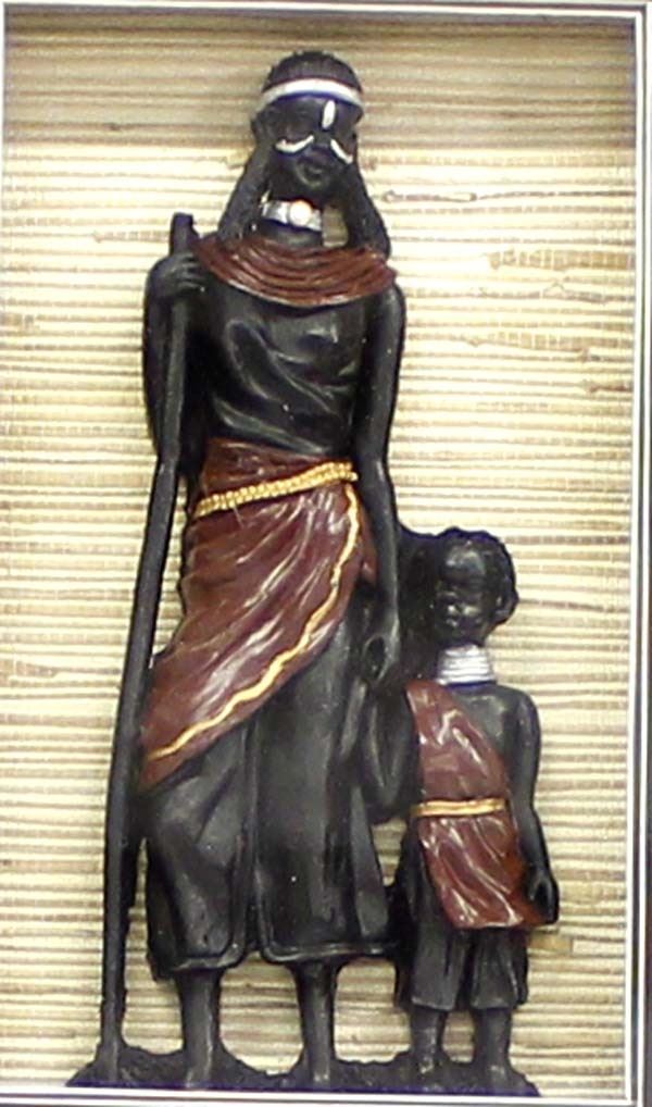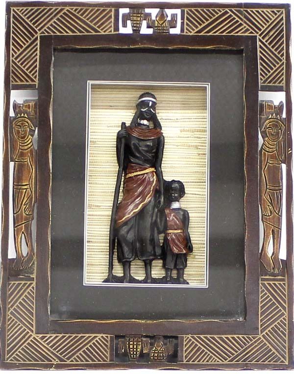 African Shadowbox Art, features beautifully carved wood shadowbox frame with a mother and child inside, visual measures 10'' x 6'' and framed measures 17.75'' x 13.75''
