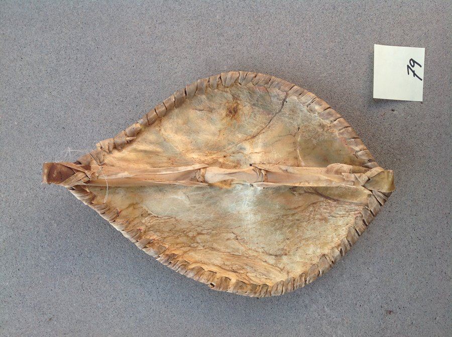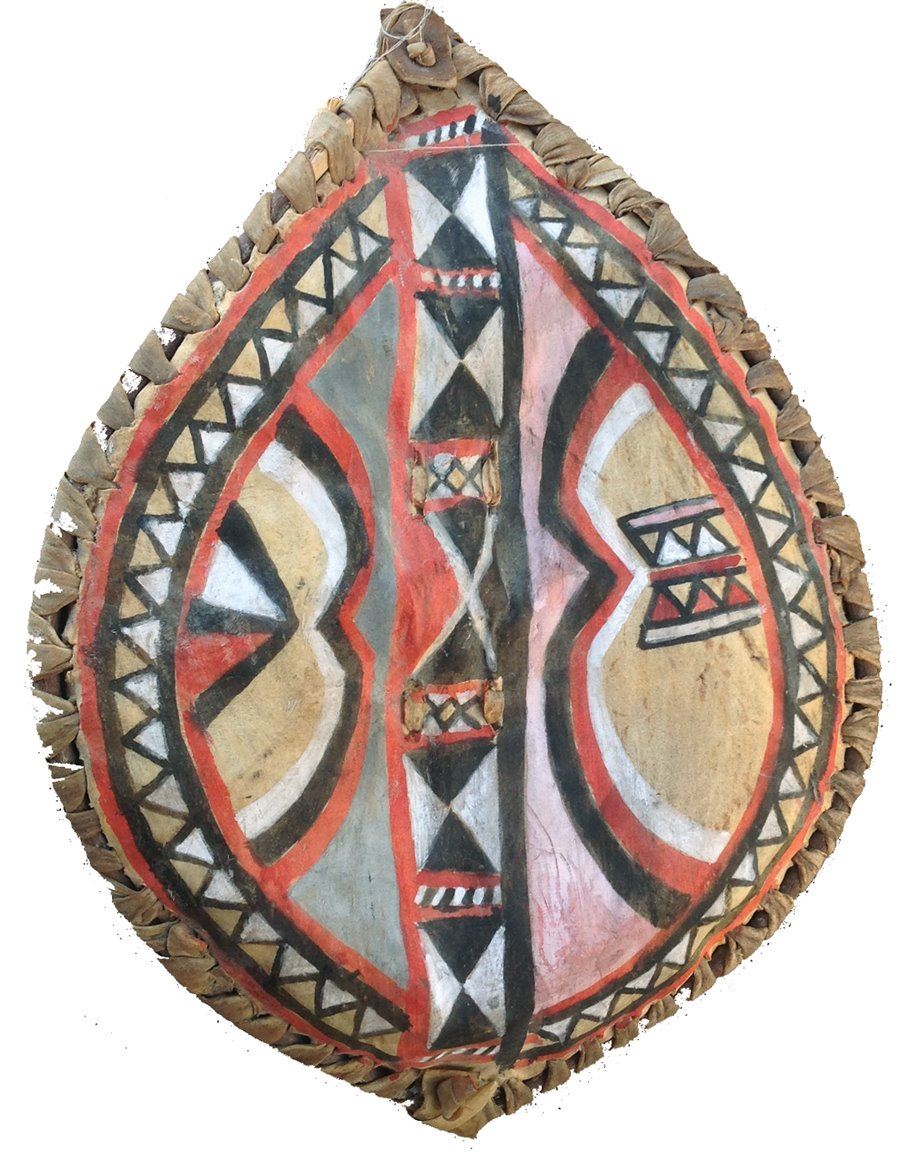 Hand crafted bentwood and stretched rawhide dance shield with colorful painted designs. Very good condition.,Ca. 1970s,18" x 12"