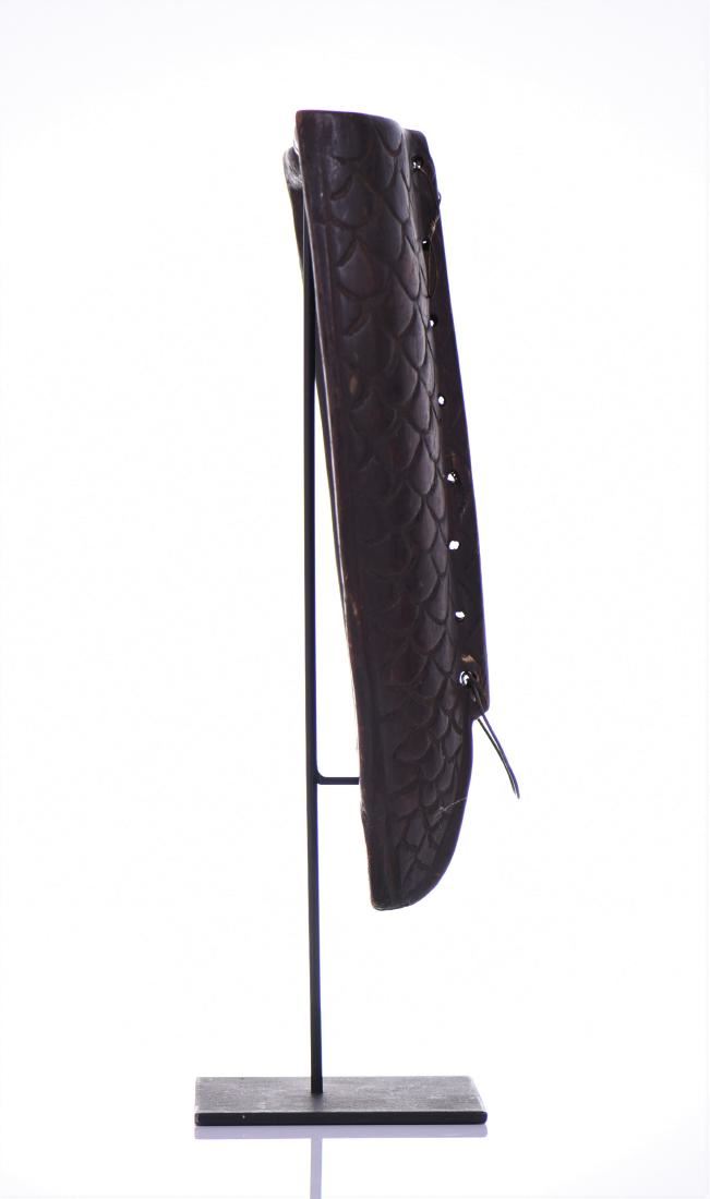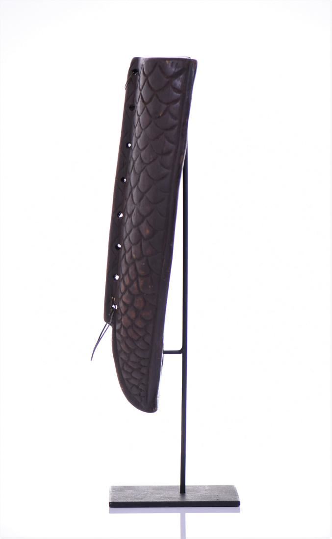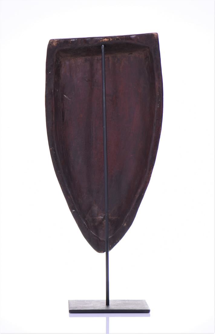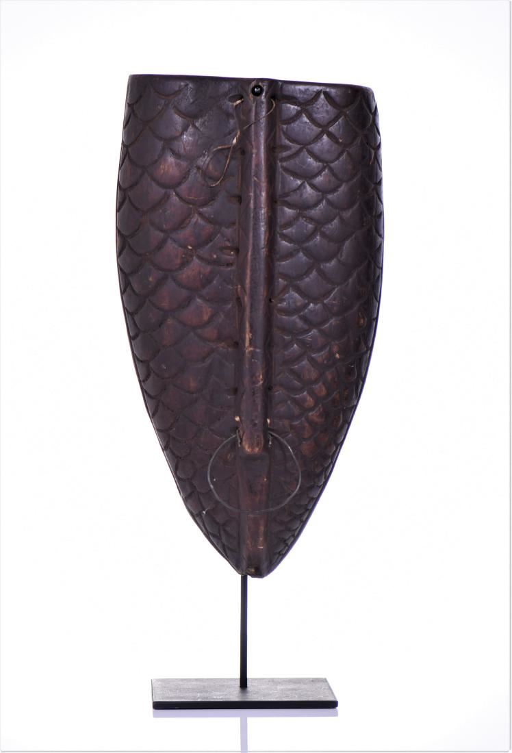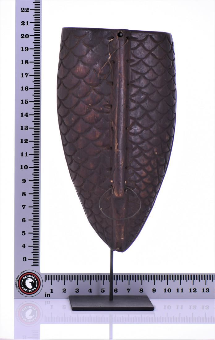 African Snake Pattern Shield, Zaire. Provenance: Ethnographic Tribal Museum Collection (See Auction Catalog Description). Some Lots Have Been On Exhibition And Have A Custom Made Metal Stand Specifically Designed To Fit The Work. Estimated more than 50 yrs old. African art is a term typically used for the art of Sub-Saharan Africa. A few of the most popular traditional African art was produced by the tribal people of the Fang, Dan, Baoule, Dogon, Senoufo, Makonde, Bambara, and San. Most African sculpture was historically in wood and other natural materials that have not survived from earlier than a few centuries ago; older pottery figures can be found from a number of areas. Masks are important elements in the art of many peoples, along with human figures, often highly stylized and in vast variety of styles. Sculpture is most common among "groups of settled cultivators in the areas drained by the Niger and Congo rivers. Direct images of deities are relatively infrequent, but masks in particular were made for religious ceremonies. Later West African cultures developed bronze casting for reliefs, like the Benin Bronzes, to decorate palaces and for highly naturalistic royal heads from around the Yoruba town of Ife, in terracotta as well as metal, from the 12th to 14th centuries. Akan gold weights are a form of small metal sculptures produced over the period 1400–1900; some apparently represent proverbs, contributing a narrative element rare in African sculpture; and royal regalia included impressive gold sculptured elements. Many West African figures are used in religious rituals and are often coated with materials placed on them for ceremonial offerings. Eastern Africans, in many areas shorter of large timber to carve, are known for Tinga Tinga paintings and Makonde sculptures. There is also tradition of producing textile art. Modern Zimbabwean sculptors in soapstone have achieved considerable international success. Southern Africa's oldest known clay figures date from 400 to 600 AD and have cylindrical heads with a mixture of human and animal features. (Wikipedia) Size and/or Weight: See Measurement Photo. (Photos Represent The Lot Condition.)