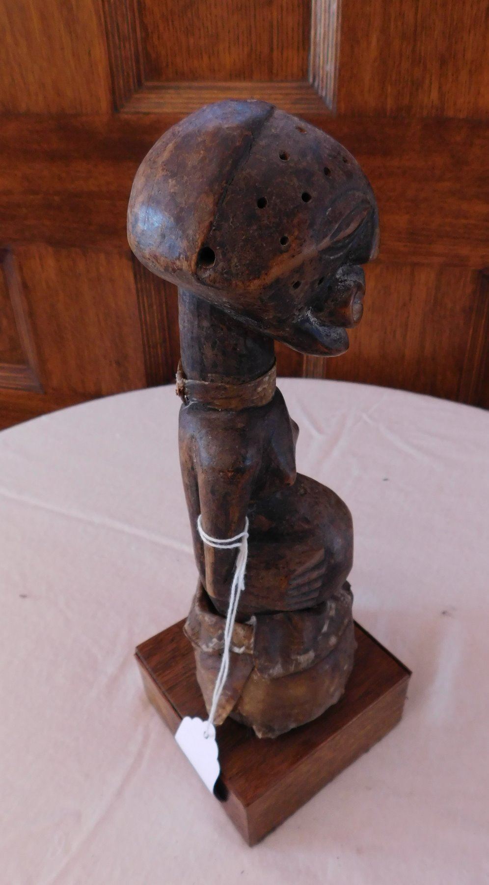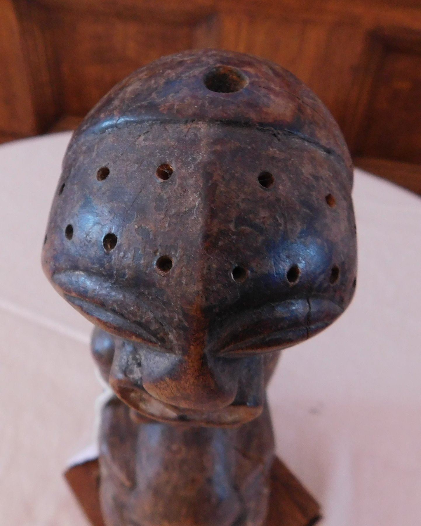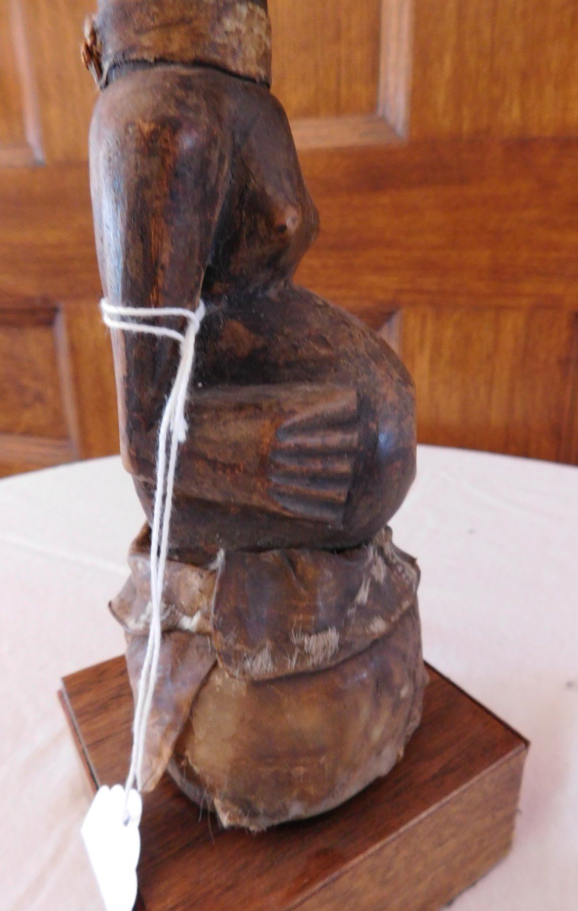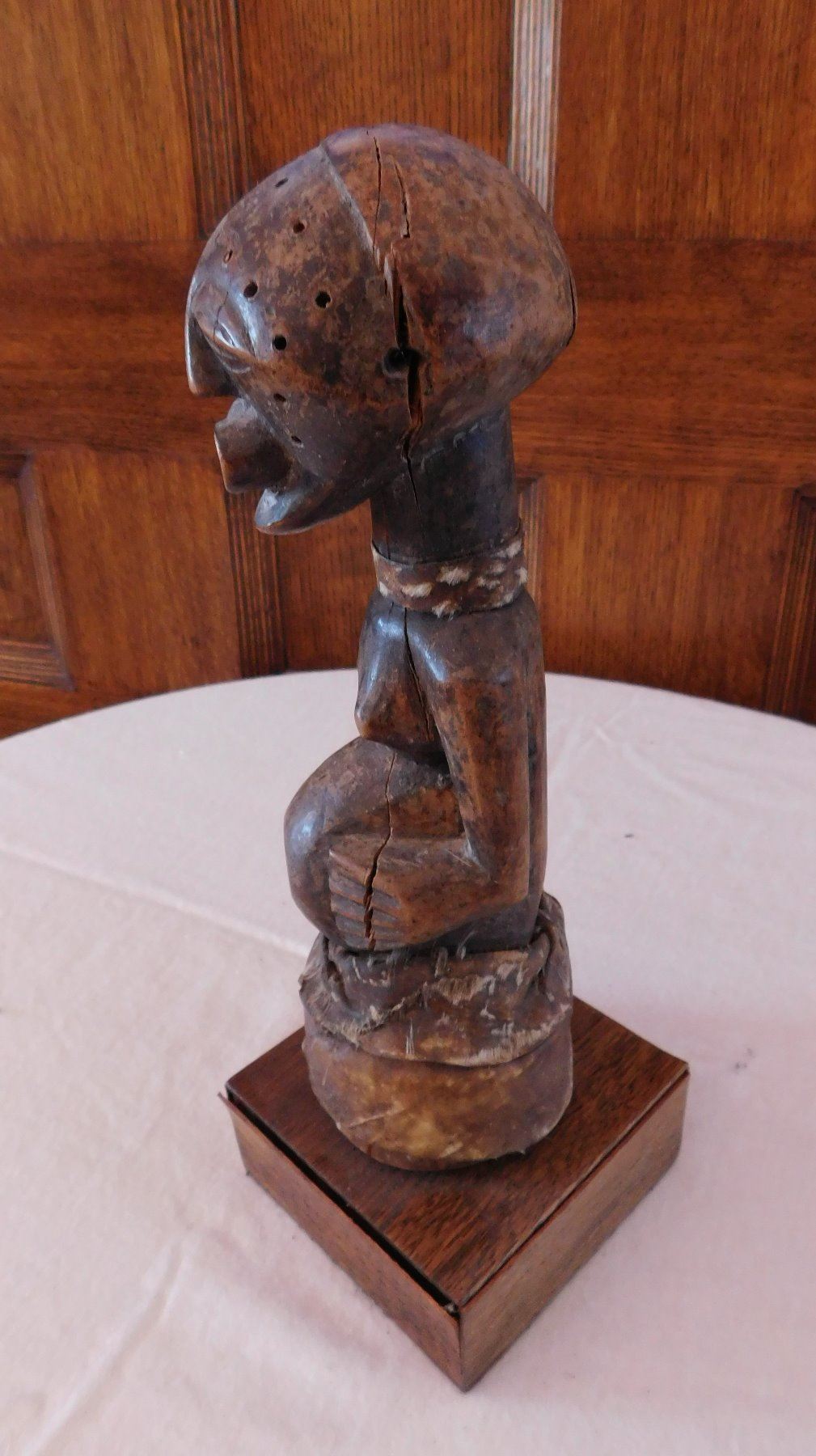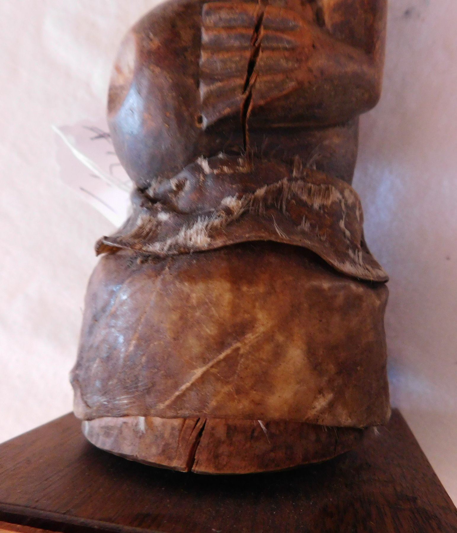 African Songye Power Fetish Figure, late 19th century. Made of rawhide, wood and wood stand, the item measures 3" x 3" x 9.25", stand measuring 3.75" x 3.75" x 1.5". Songye, Congo. Drilled holes in face and arms, interesting expression. Condition: Good, some wear and patina, see images. Shipping: $22.50 w/insurance and signature.