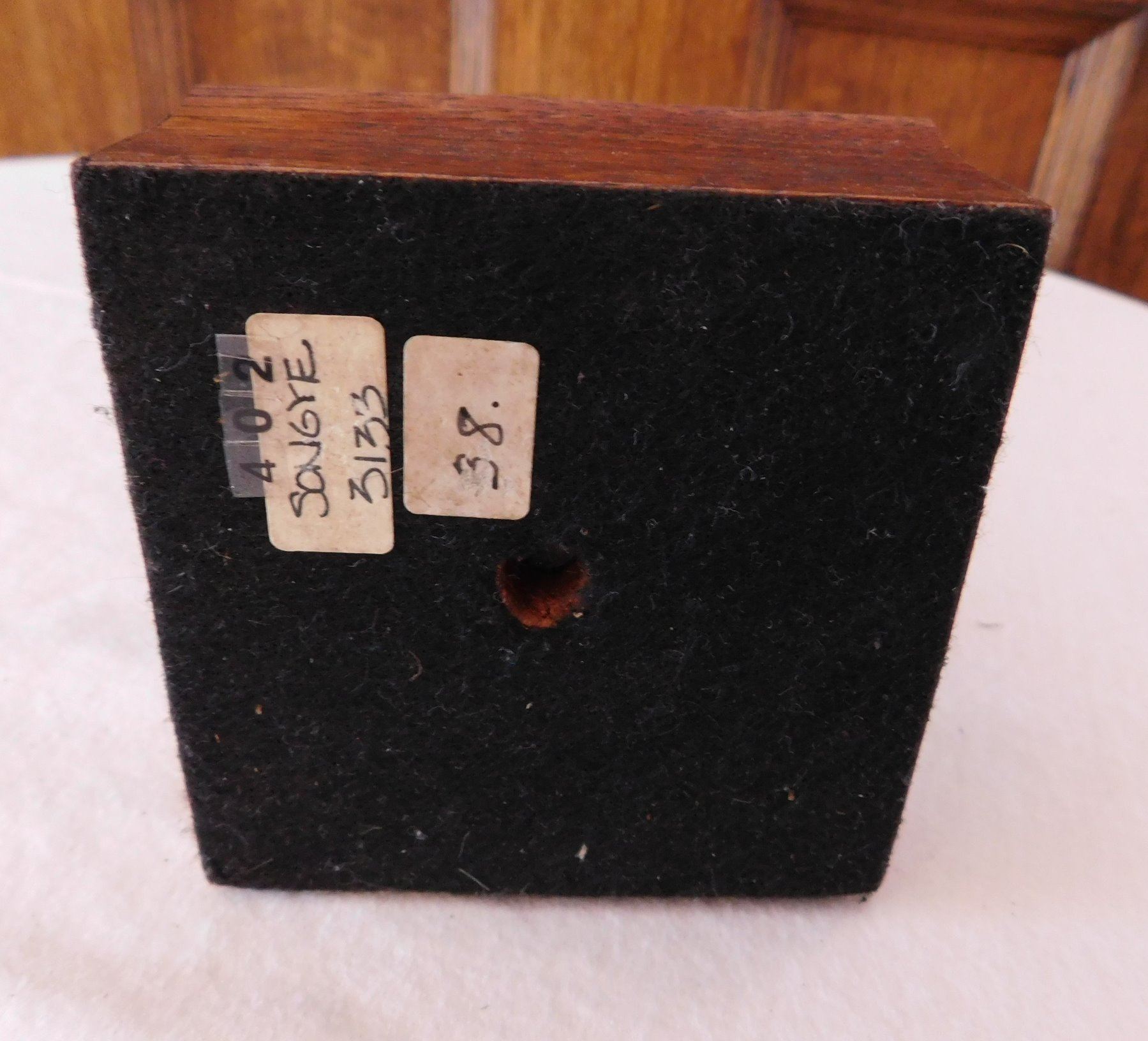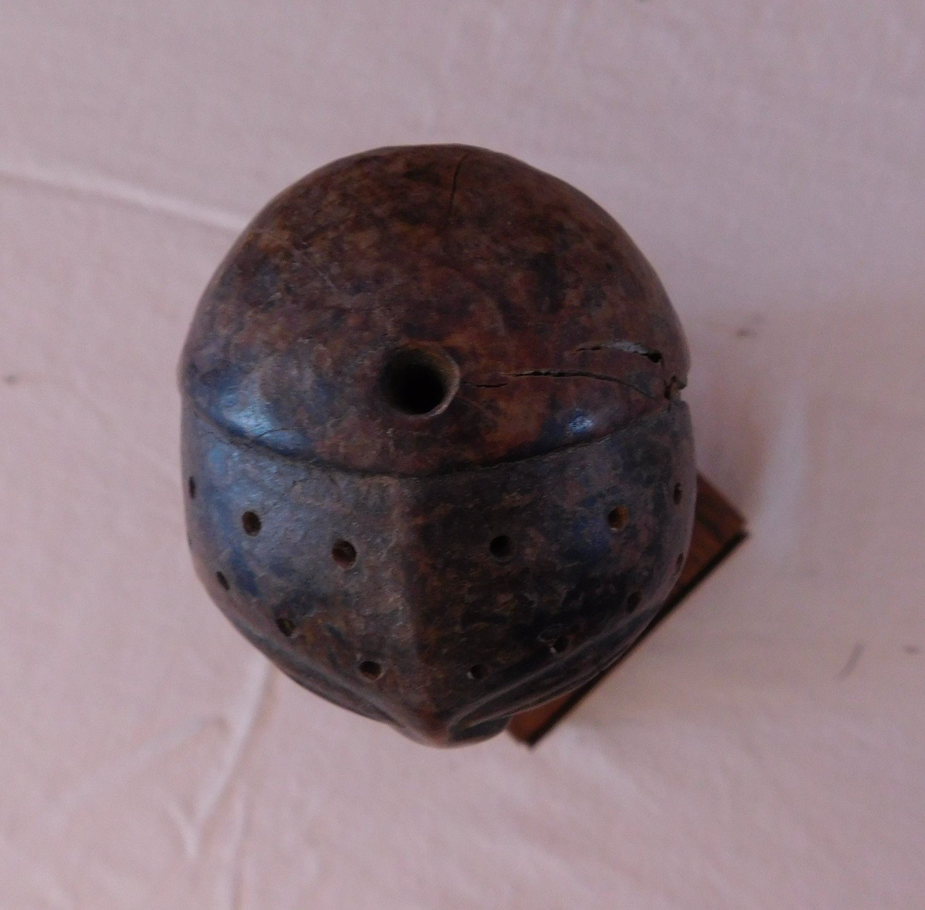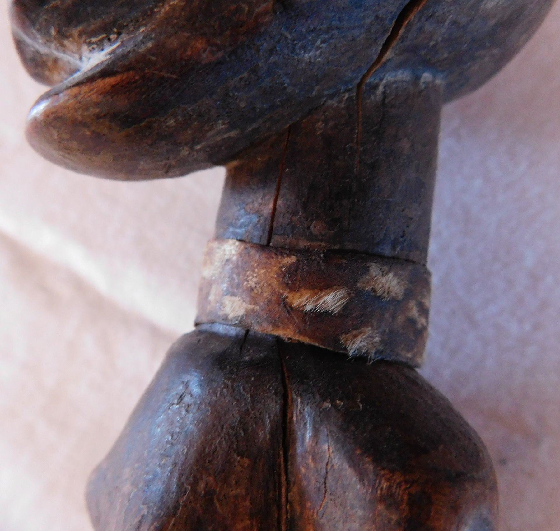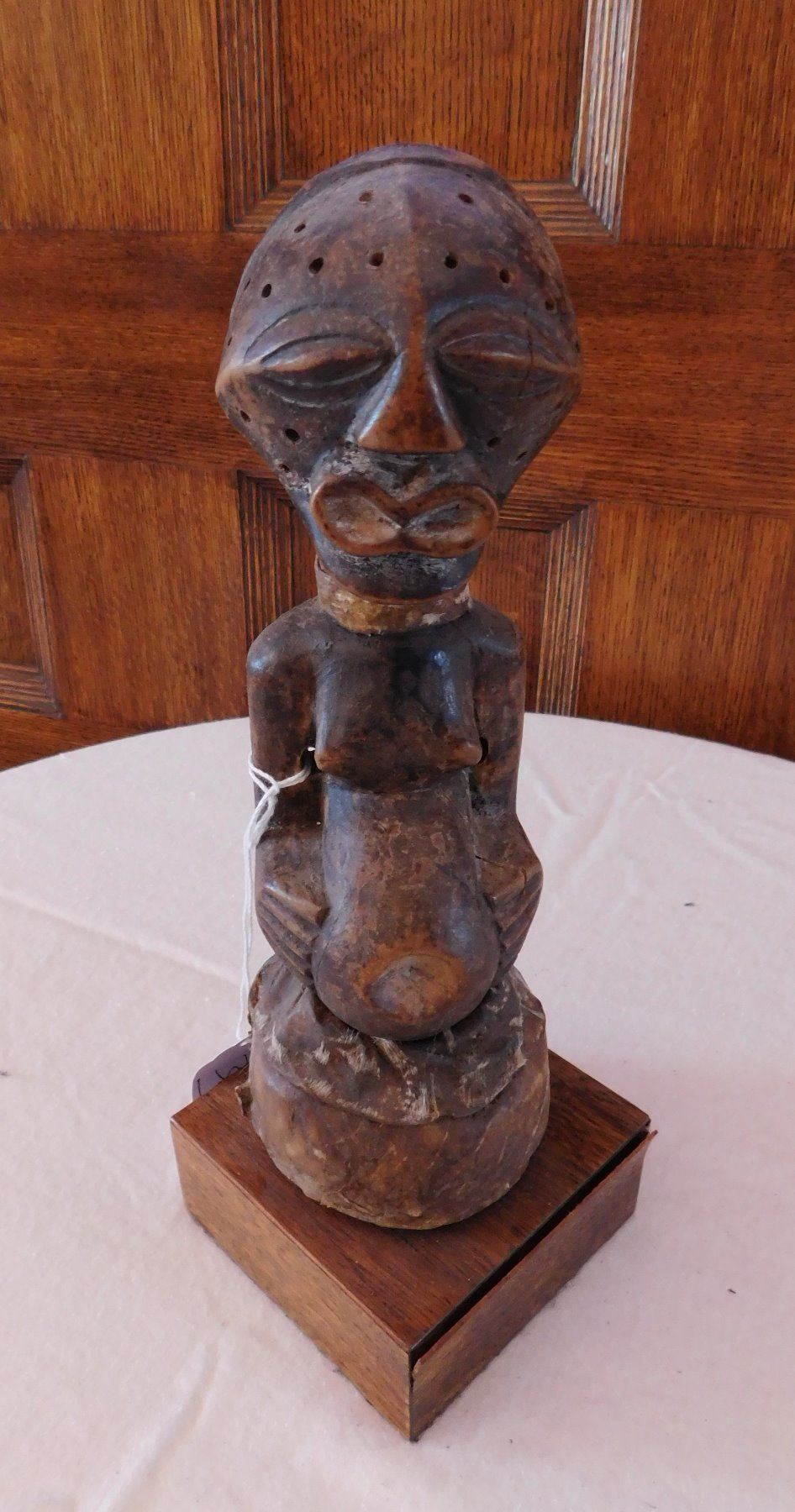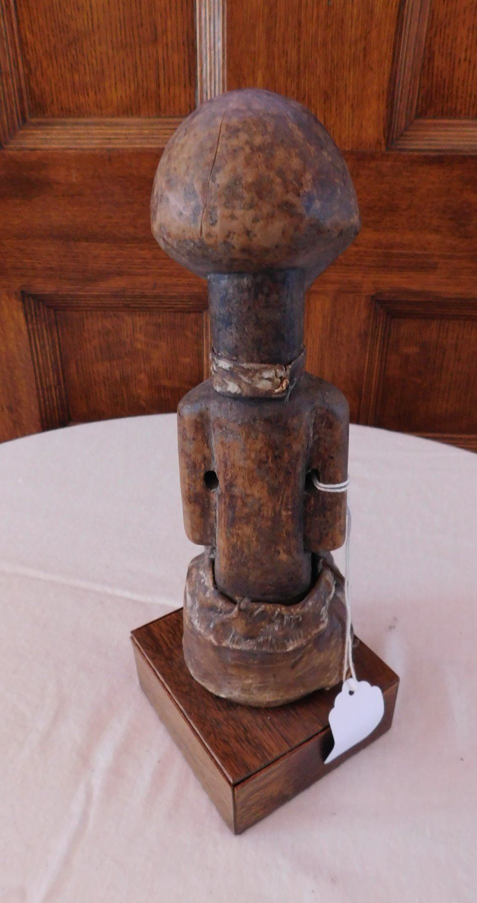 African Songye Power Fetish Figure, late 19th century. Made of rawhide, wood and wood stand, the item measures 3" x 3" x 9.25", stand measuring 3.75" x 3.75" x 1.5". Songye, Congo. Drilled holes in face and arms, interesting expression. Condition: Good, some wear and patina, see images. Shipping: $22.50 w/insurance and signature.