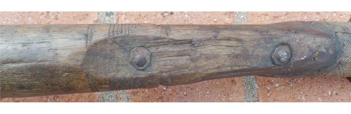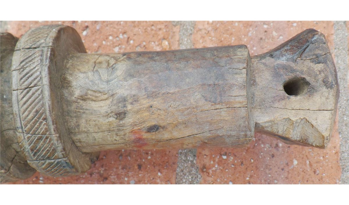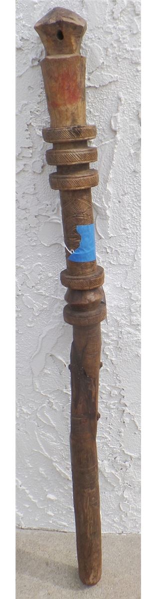 African Speaker's Staff, circa 1890. Made of wood and has two metal bolt-like objects. Measures 34.5" long x 2" x 2". From the Congo. This Speaker's staff has nice engraving throughout. Condition: As found, see images. Shipping: $24.
