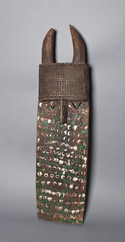 Very large maske carved with geometric hat with horns, and protruding nose, painted in green and white orbs. Settled in the northwest of Liberia, western Sierra Leone, and eastern Guinea, the 200,000 Toma live in the high-altitude rain forest. They organized their political and religious life around the poro association. This society was, among other things, responsible for the initiation of young boys that took place in the forest, which is particularly dense in the land of the Toma. When called forth by the landai (landa), a large mask, the future initiates would leave “on retreat” for the forest for a month. 46.25" H x 12" W, chip to tip of right horn, wear consistent with age. Early 20th century.