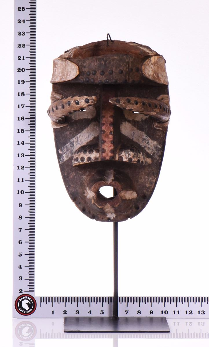 African Tribal Mask, Wood Carved With Nails. Base Stand Not Included. Estimated more than 50 yrs old. African art is a term typically used for the art of Sub-Saharan Africa. A few of the most popular traditional African art was produced by the tribal people of the Fang, Dan, Baoule, Dogon, Senoufo, Makonde, Bambara, and San. Most African sculpture was historically in wood and other natural materials that have not survived from earlier than a few centuries ago; older pottery figures can be found from a number of areas. Masks are important elements in the art of many peoples, along with human figures, often highly stylized and in vast variety of styles. Sculpture is most common among "groups of settled cultivators in the areas drained by the Niger and Congo rivers. Direct images of deities are relatively infrequent, but masks in particular were made for religious ceremonies. Later West African cultures developed bronze casting for reliefs, like the Benin Bronzes, to decorate palaces and for highly naturalistic royal heads from around the Yoruba town of Ife, in terracotta as well as metal, from the 12th to 14th centuries. Akan gold weights are a form of small metal sculptures produced over the period 1400–1900; some apparently represent proverbs, contributing a narrative element rare in African sculpture; and royal regalia included impressive gold sculptured elements. Many West African figures are used in religious rituals and are often coated with materials placed on them for ceremonial offerings. Eastern Africans, in many areas shorter of large timber to carve, are known for Tinga Tinga paintings and Makonde sculptures. There is also tradition of producing textile art. Modern Zimbabwean sculptors in soapstone have achieved considerable international success. Southern Africa's oldest known clay figures date from 400 to 600 AD and have cylindrical heads with a mixture of human and animal features. (Wikipedia) Size: See Ruler Photo. (Photos Represent The Condition Of The Lot.)