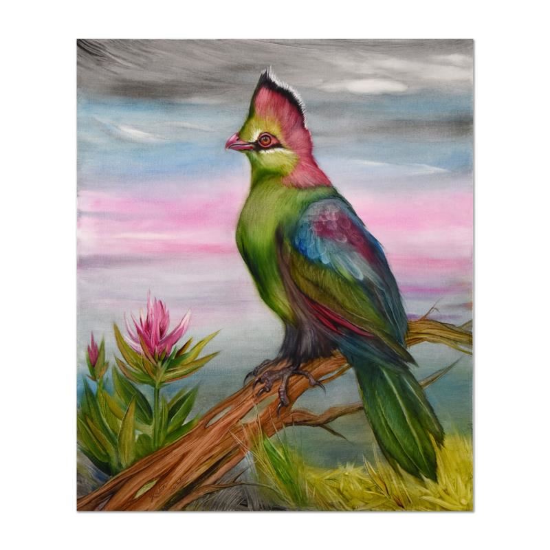"African Turaco" is an original oil painting on stretched canvas by Martin Katon, hand signed by the artist. Includes Letter of Authenticity. Measures approx. 20" x 24" (image).