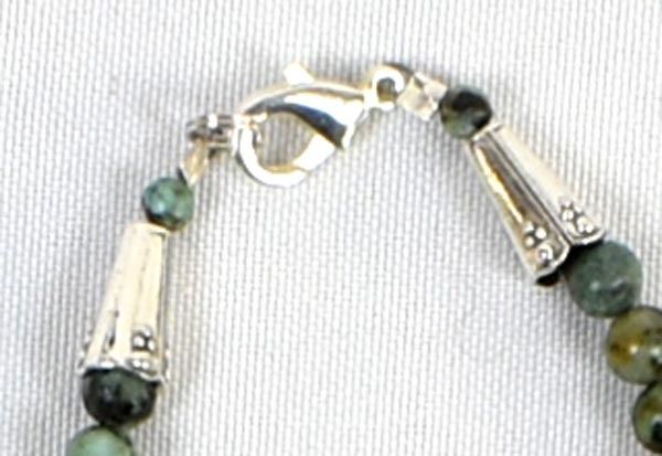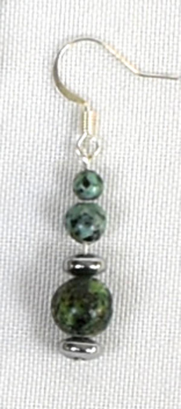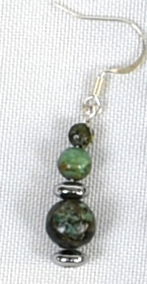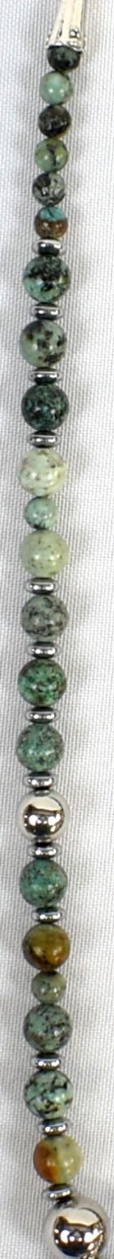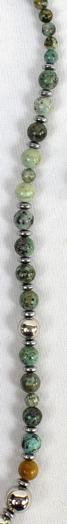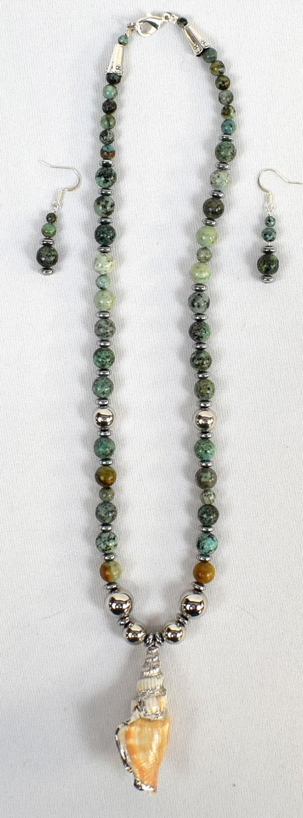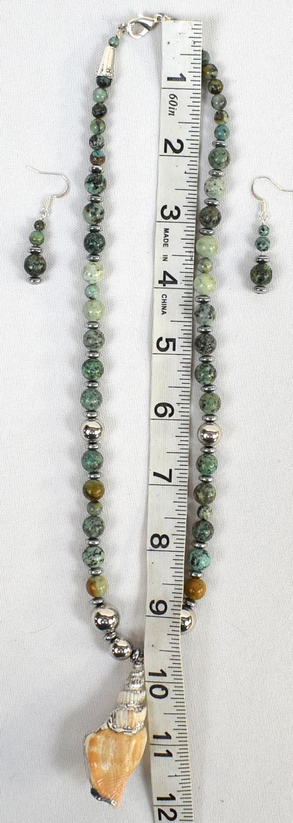 One of a Kind African Turquoise and Sterling Silver Necklace with Shell Pendant and Earrings by Larry McLellan. This unique necklace measures 20'' end to end while the earring, on sterling silver wires are 1 1/2'' long.